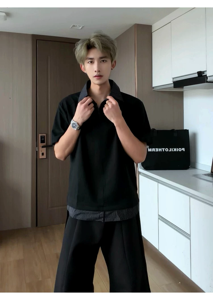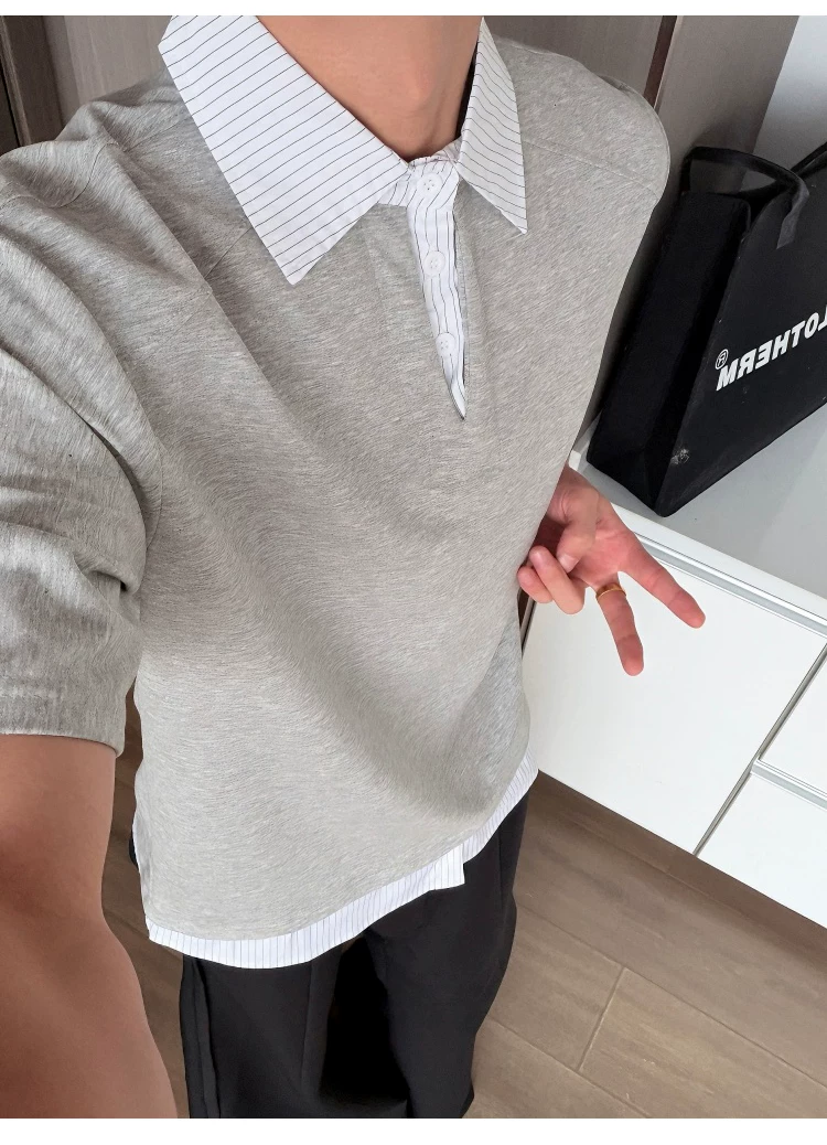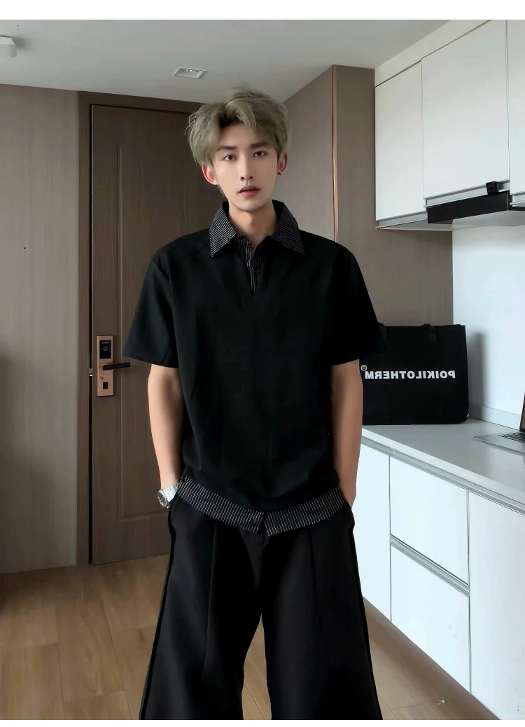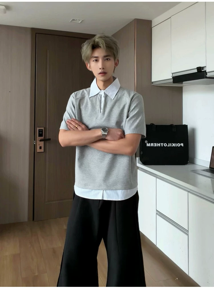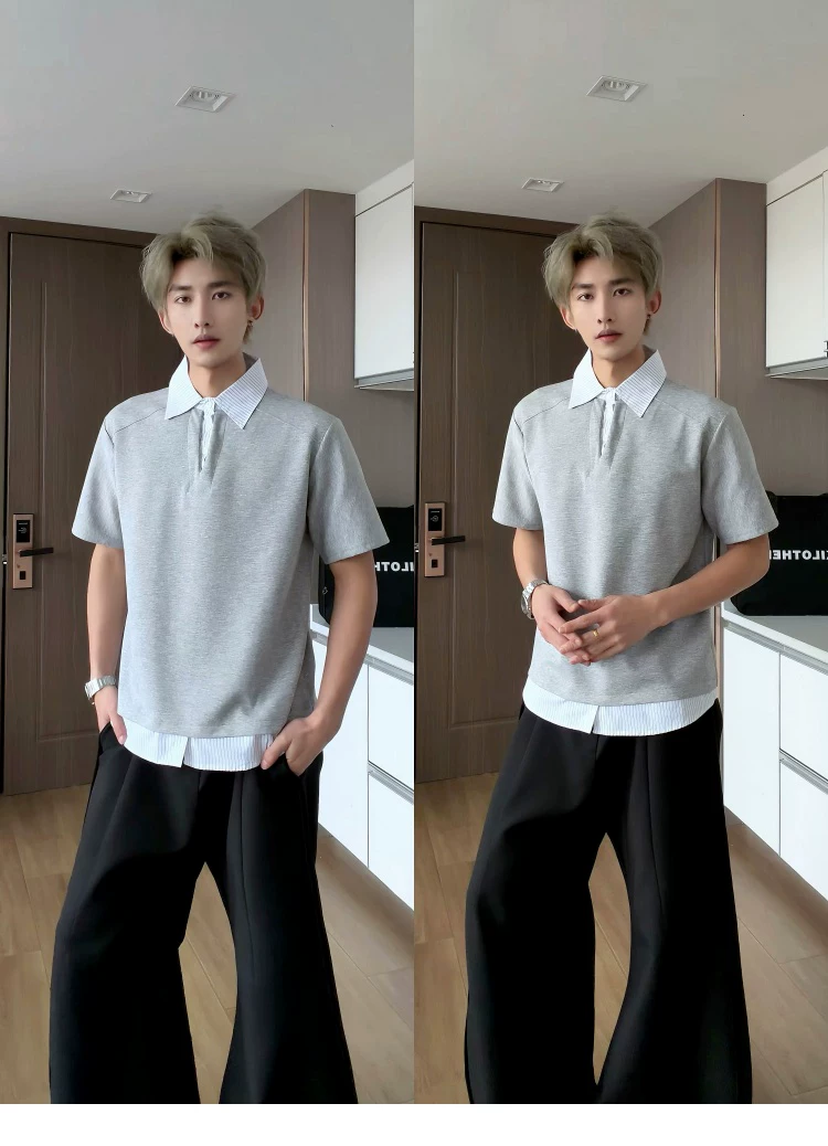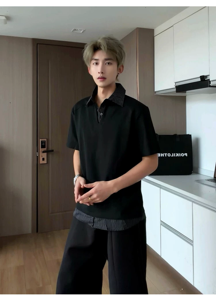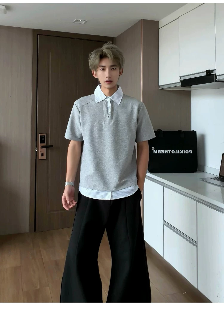 - Áo sơ mi giả hai mảnh cổ polo dành cho nam, áo thun sọc phối màu rộng rãi mùa hè, áo thun cao cấp phong cách Mỹ thời thượng.