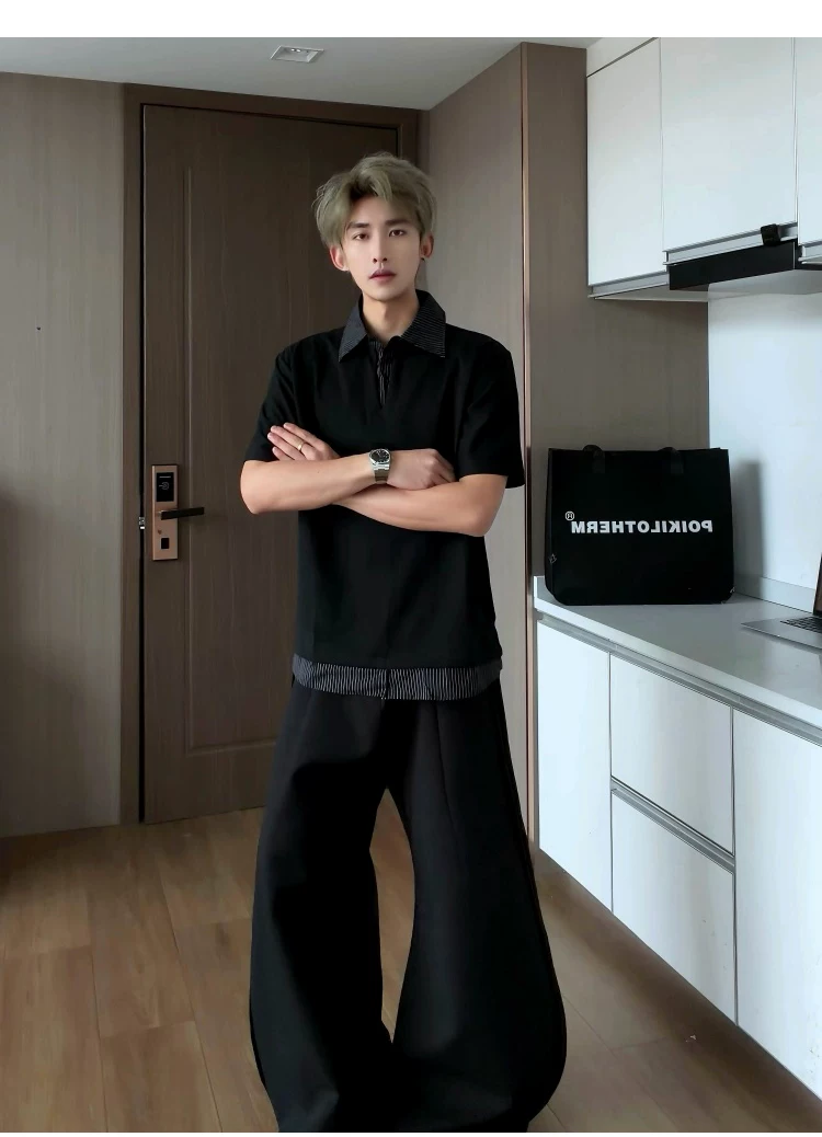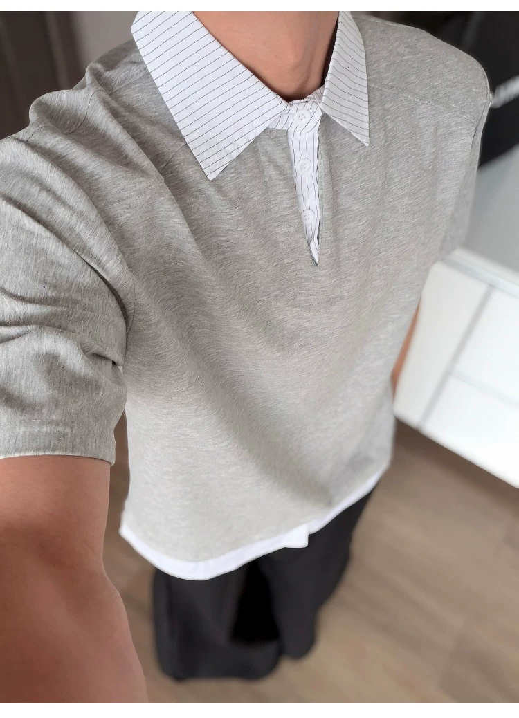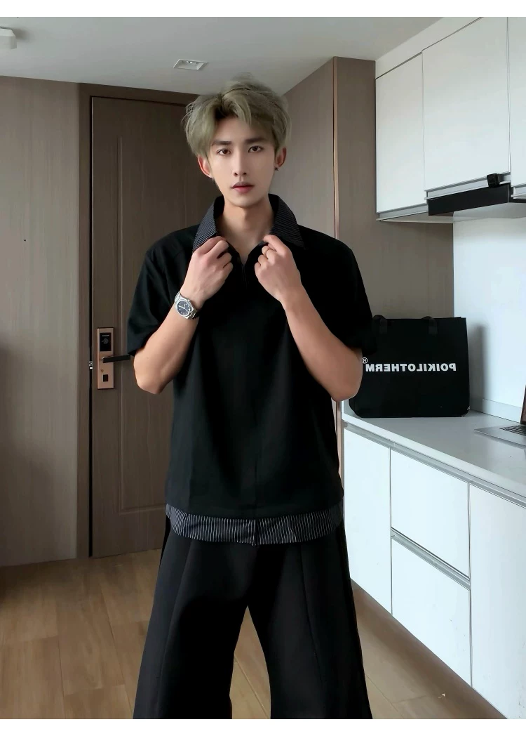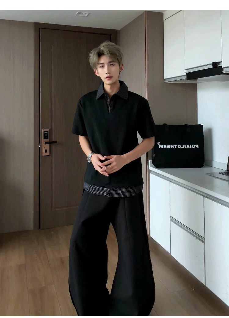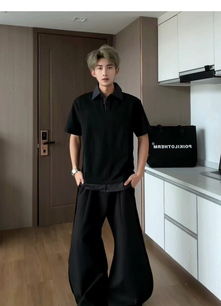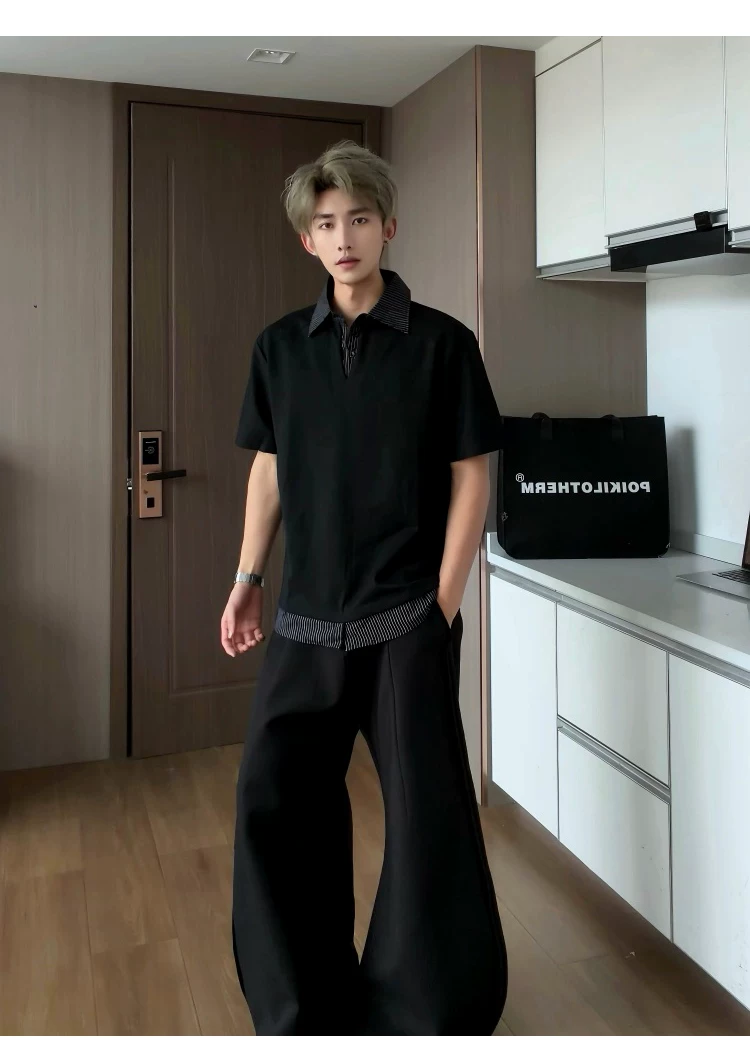 - Áo sơ mi giả hai mảnh cổ polo dành cho nam, áo thun sọc phối màu rộng rãi mùa hè, áo thun cao cấp phong cách Mỹ thời thượng.