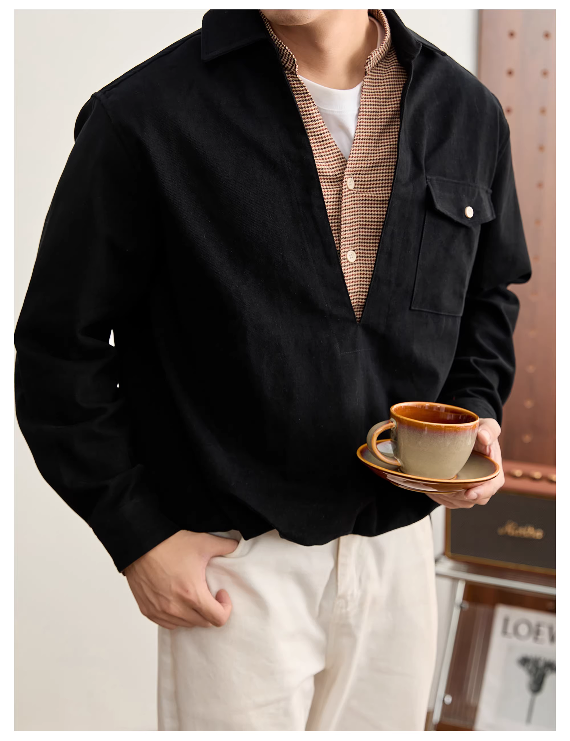 Áo sơ mi giả hai mảnh LUUD 100% cotton nguyên chất, áo sơ mi nửa khuy kiểu dáng cổ điển hợp thời trang có họa tiết chắp vá houndstooth dành cho nam.