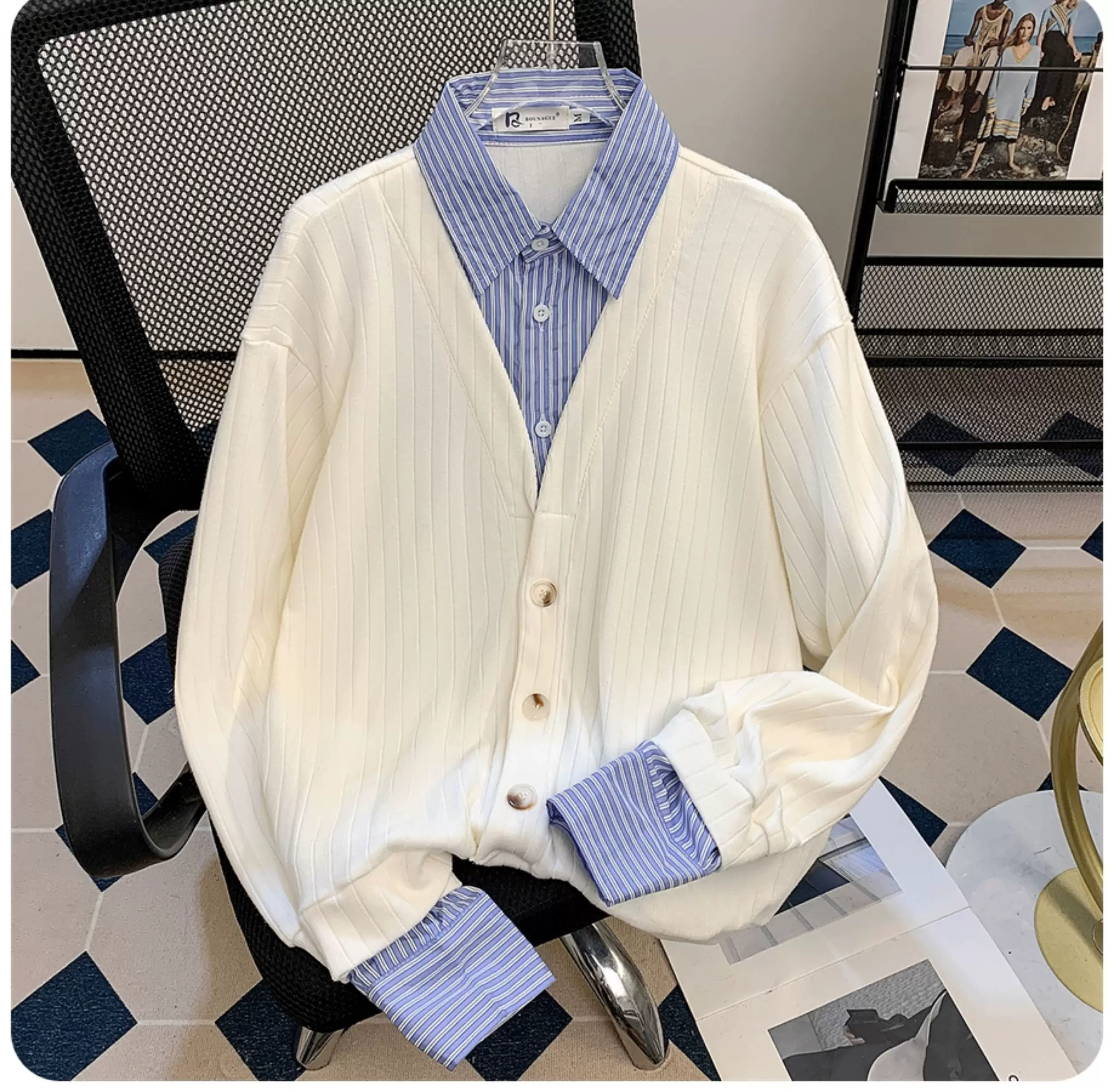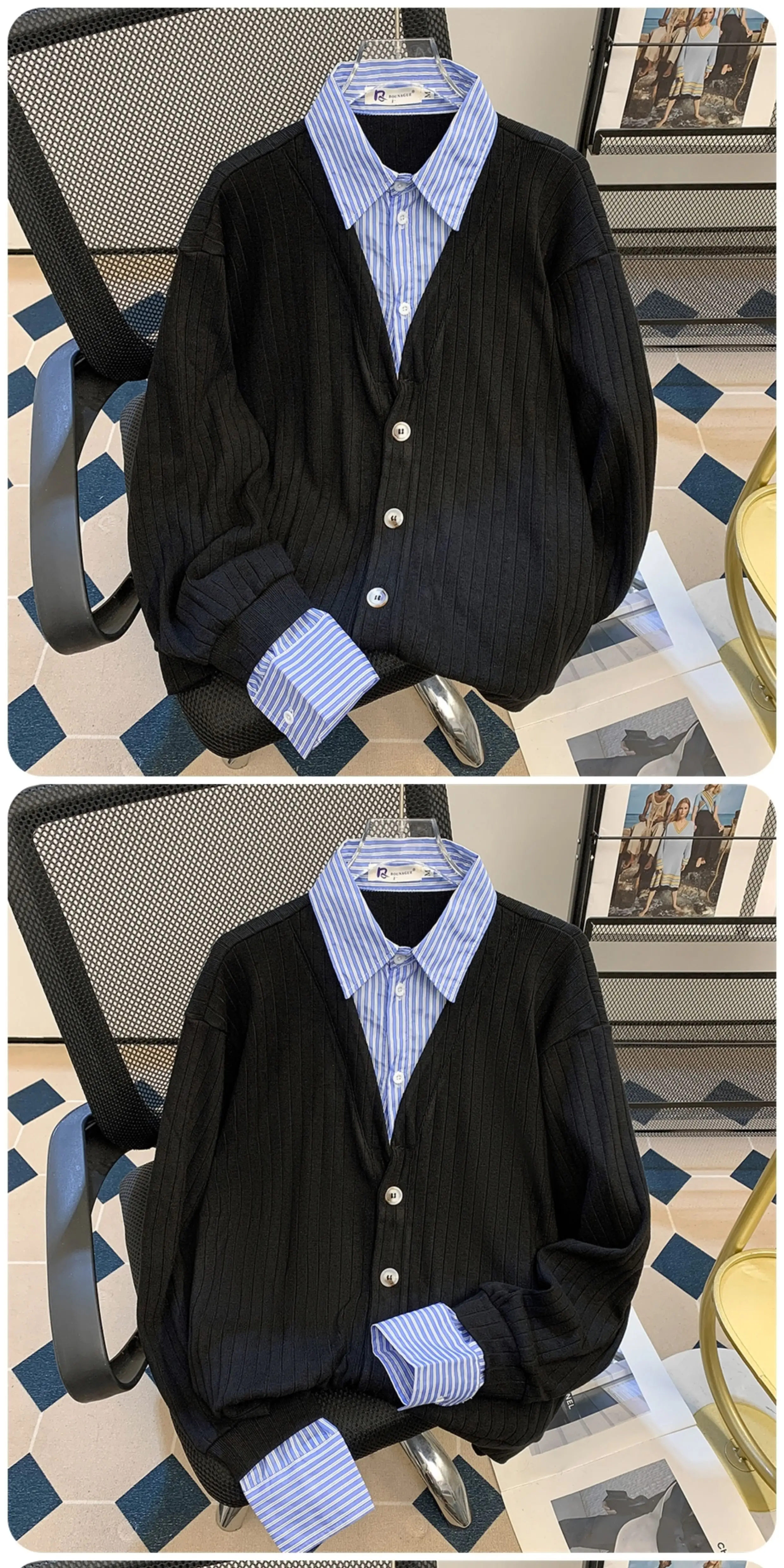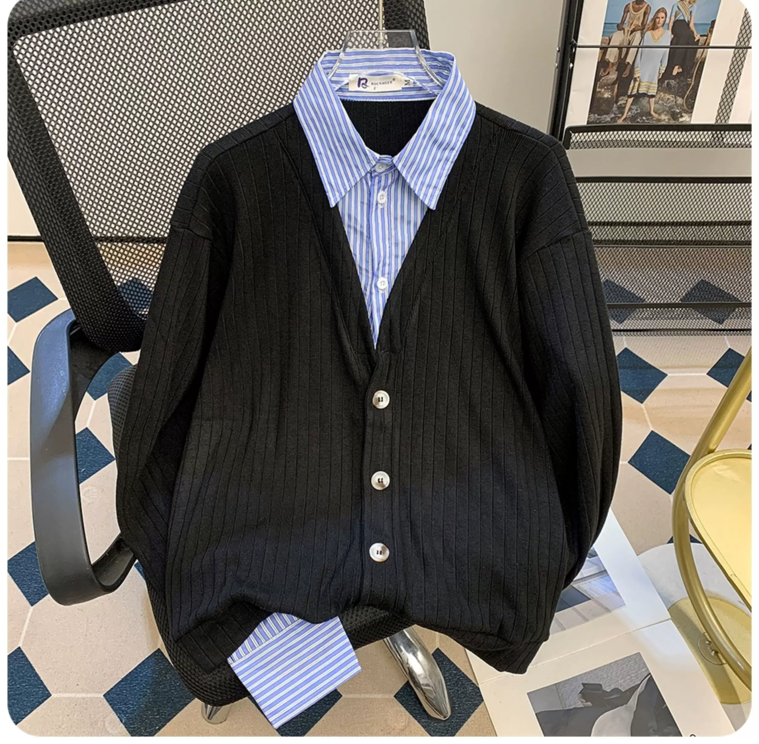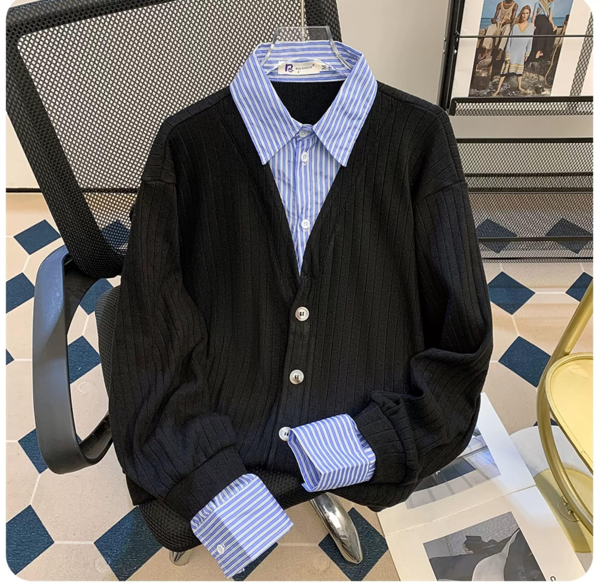 - Áo sơ mi giả hai mảnh phong cách Nhật Bản dành cho nam, áo nỉ cổ bẻ dáng rộng hợp thời trang mùa xuân thu, áo sơ mi dài tay phối màu cao cấp.