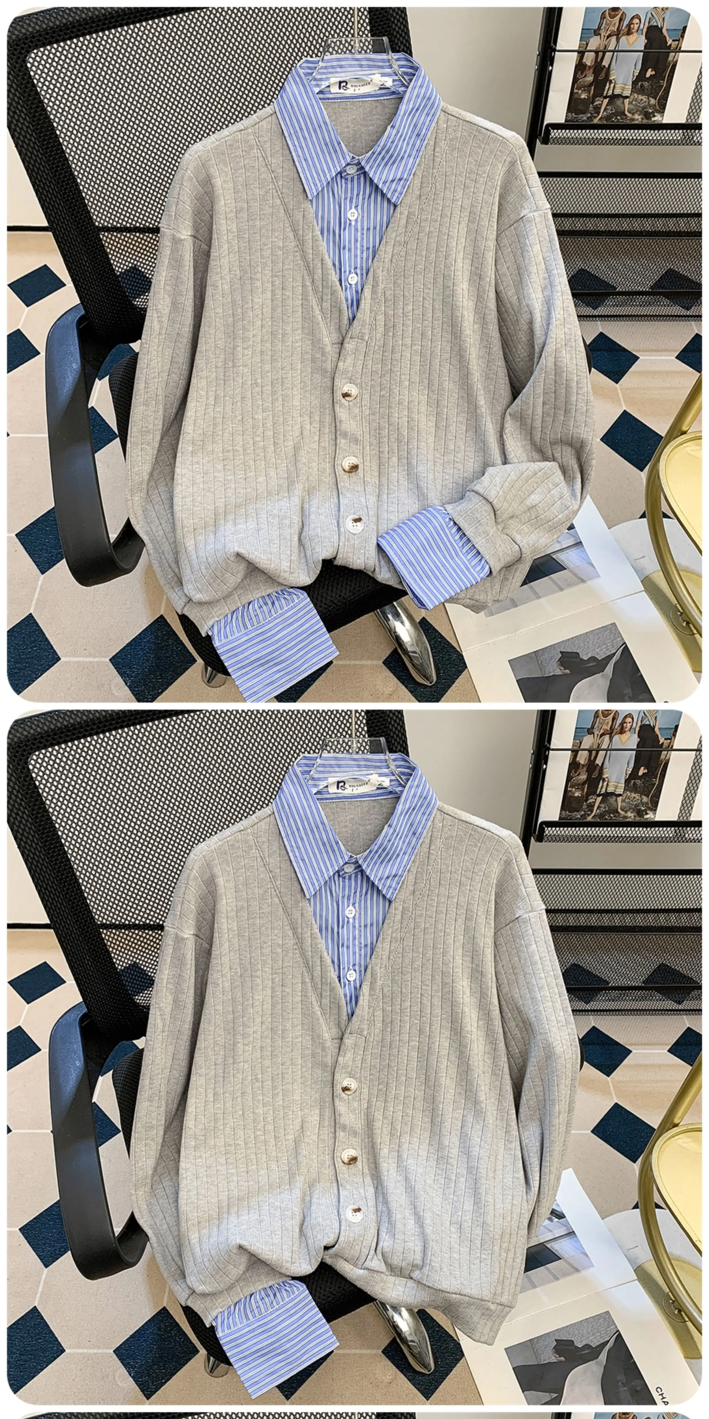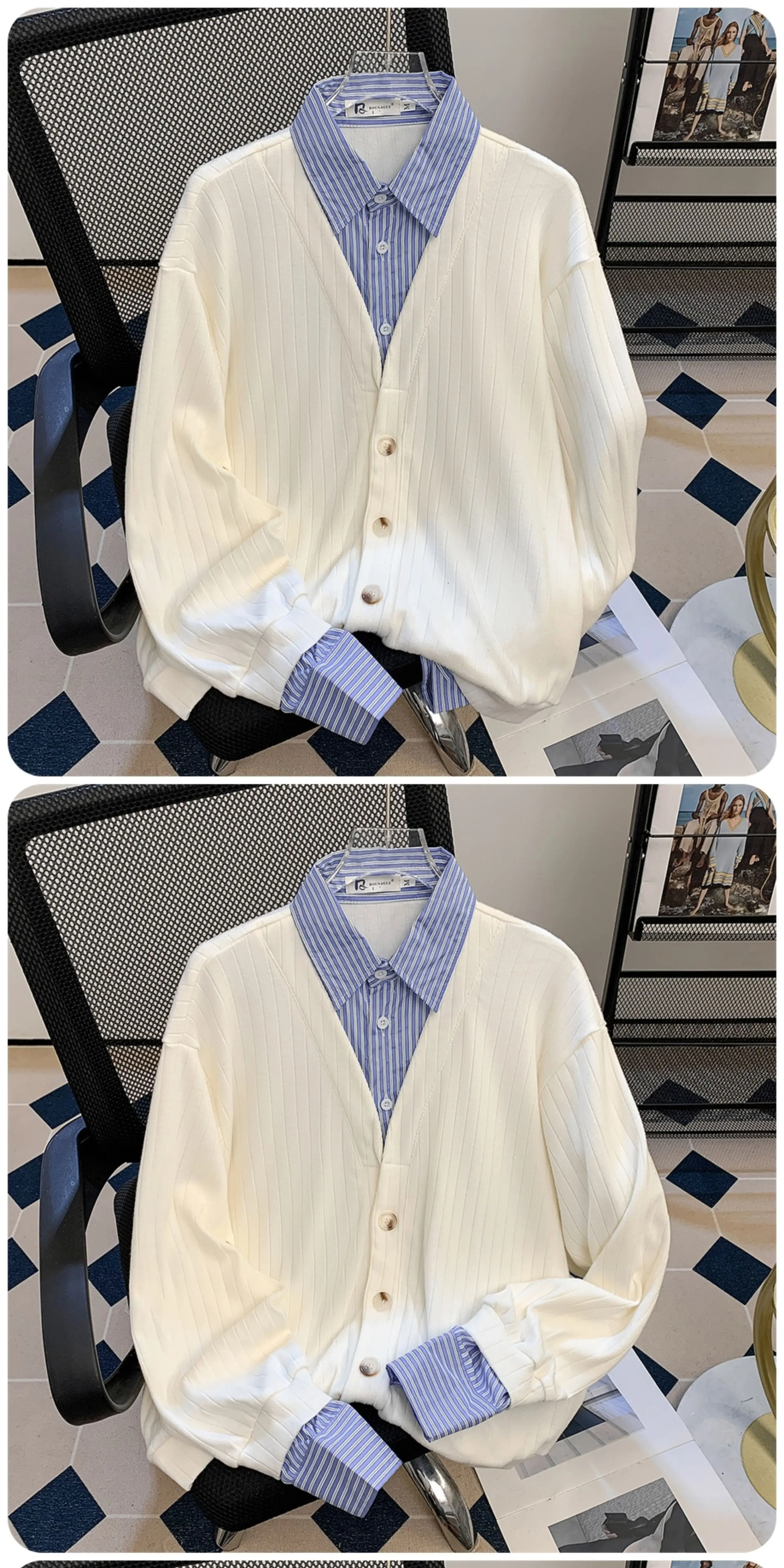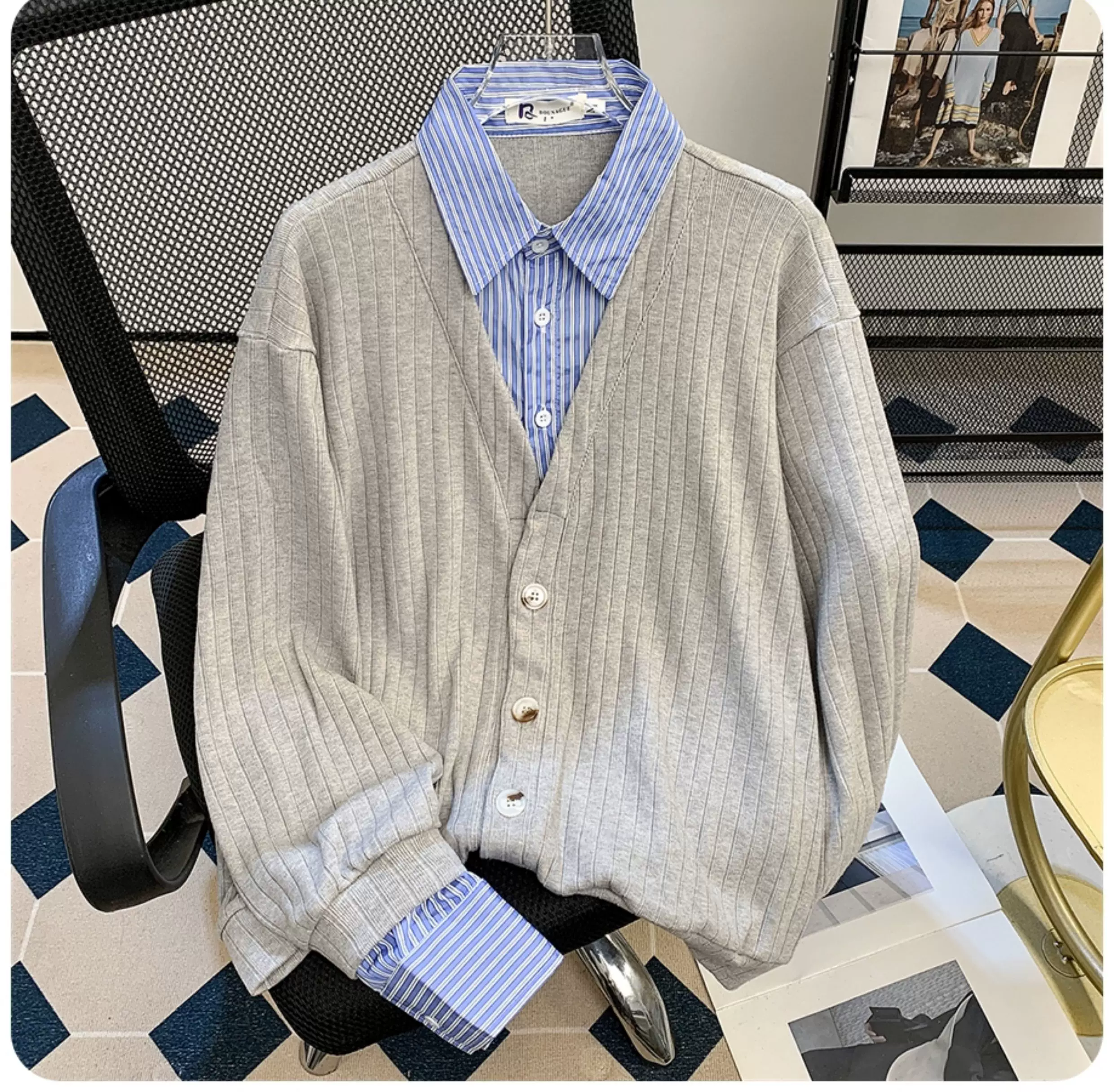 - Áo sơ mi giả hai mảnh phong cách Nhật Bản dành cho nam, áo nỉ cổ bẻ dáng rộng hợp thời trang mùa xuân thu, áo sơ mi dài tay phối màu cao cấp.
