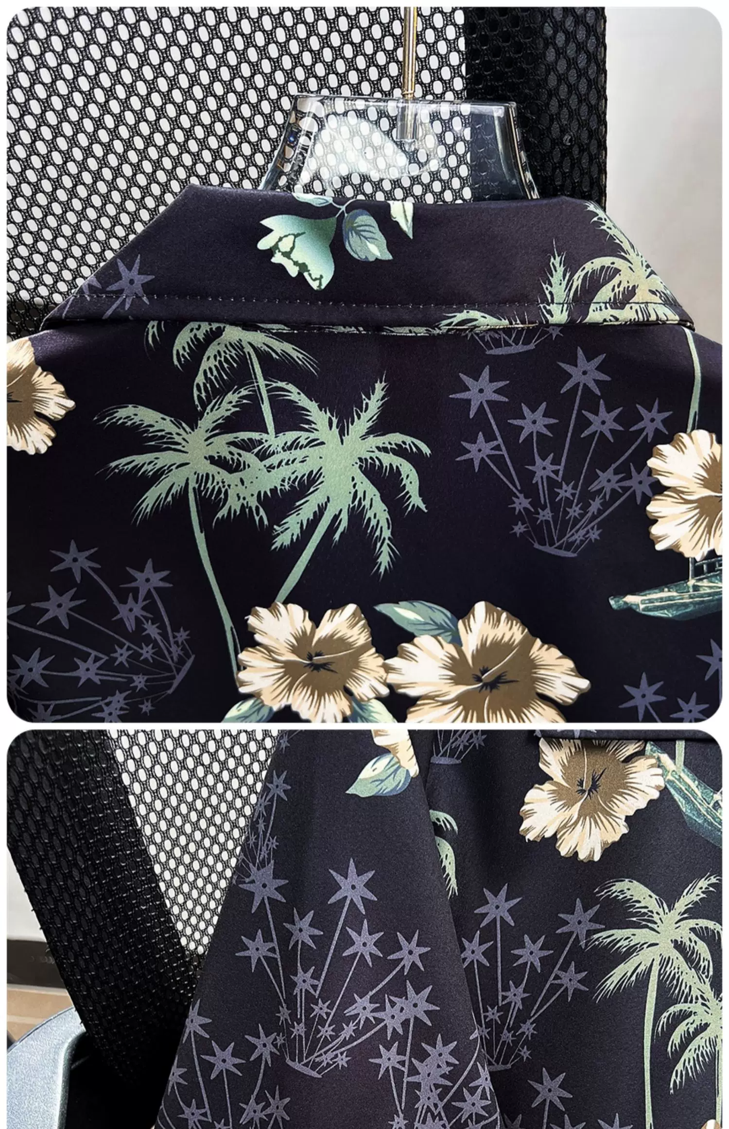 Áo sơ mi hoa bãi biển chất liệu lụa băng dành cho nam, tay ngắn, kiểu cổ Cuba phong cách Mỹ thời thượng, cao cấp mùa hè, kiểu dáng thời trang và rộng rãi.