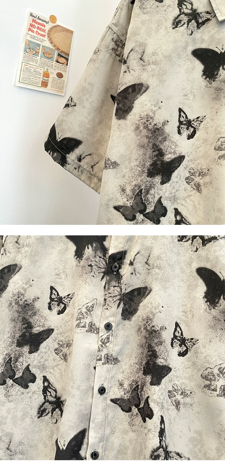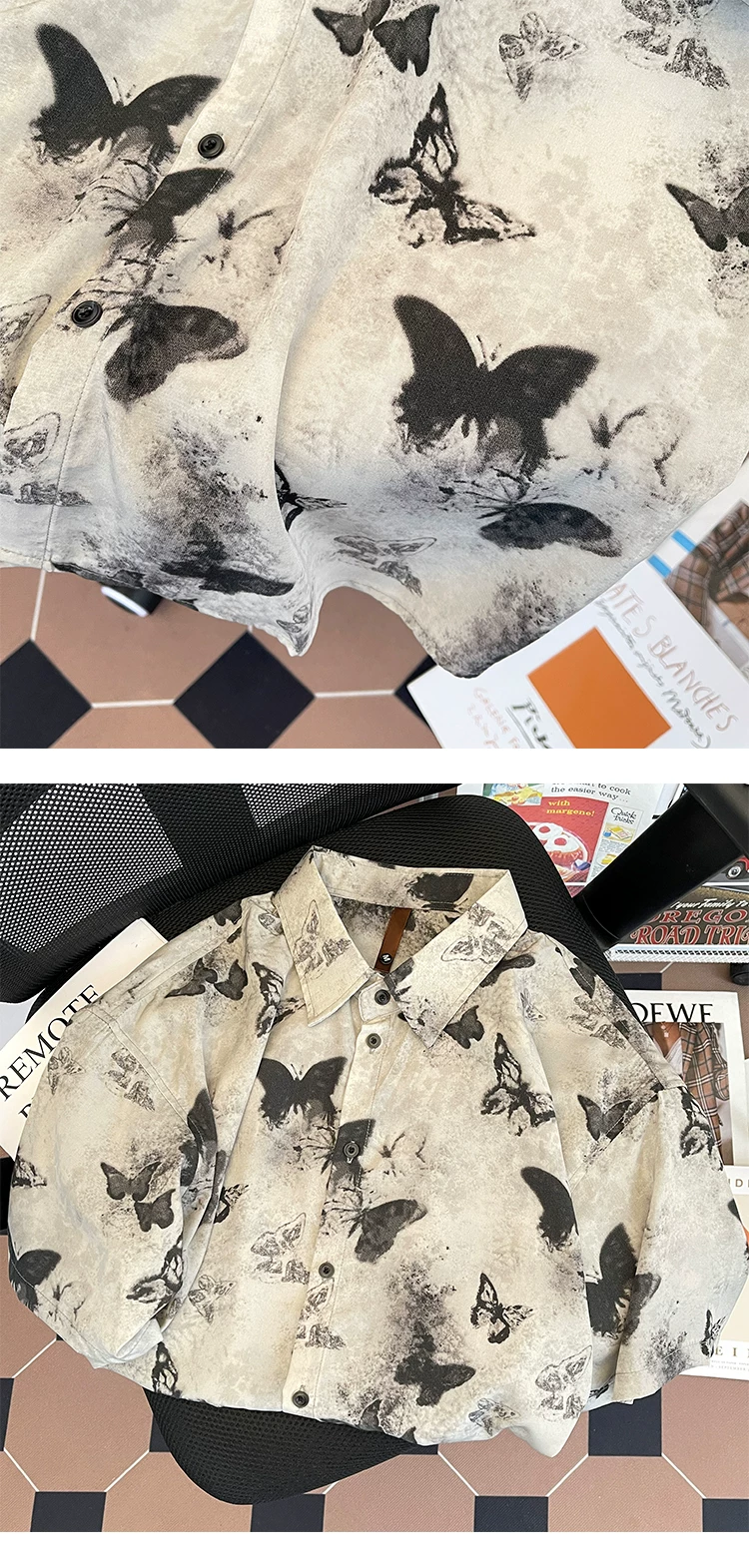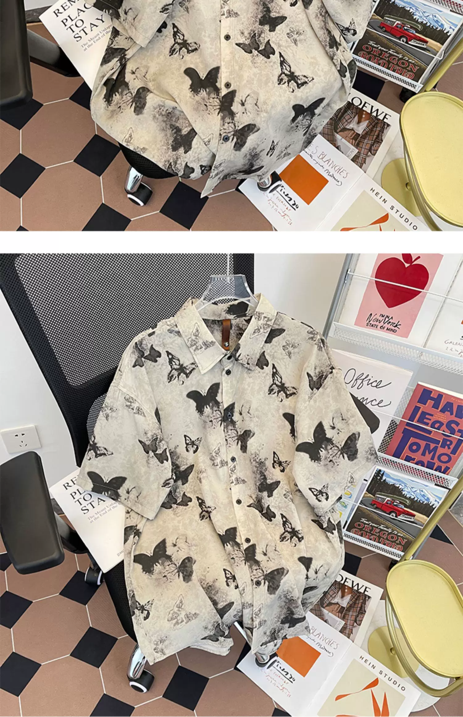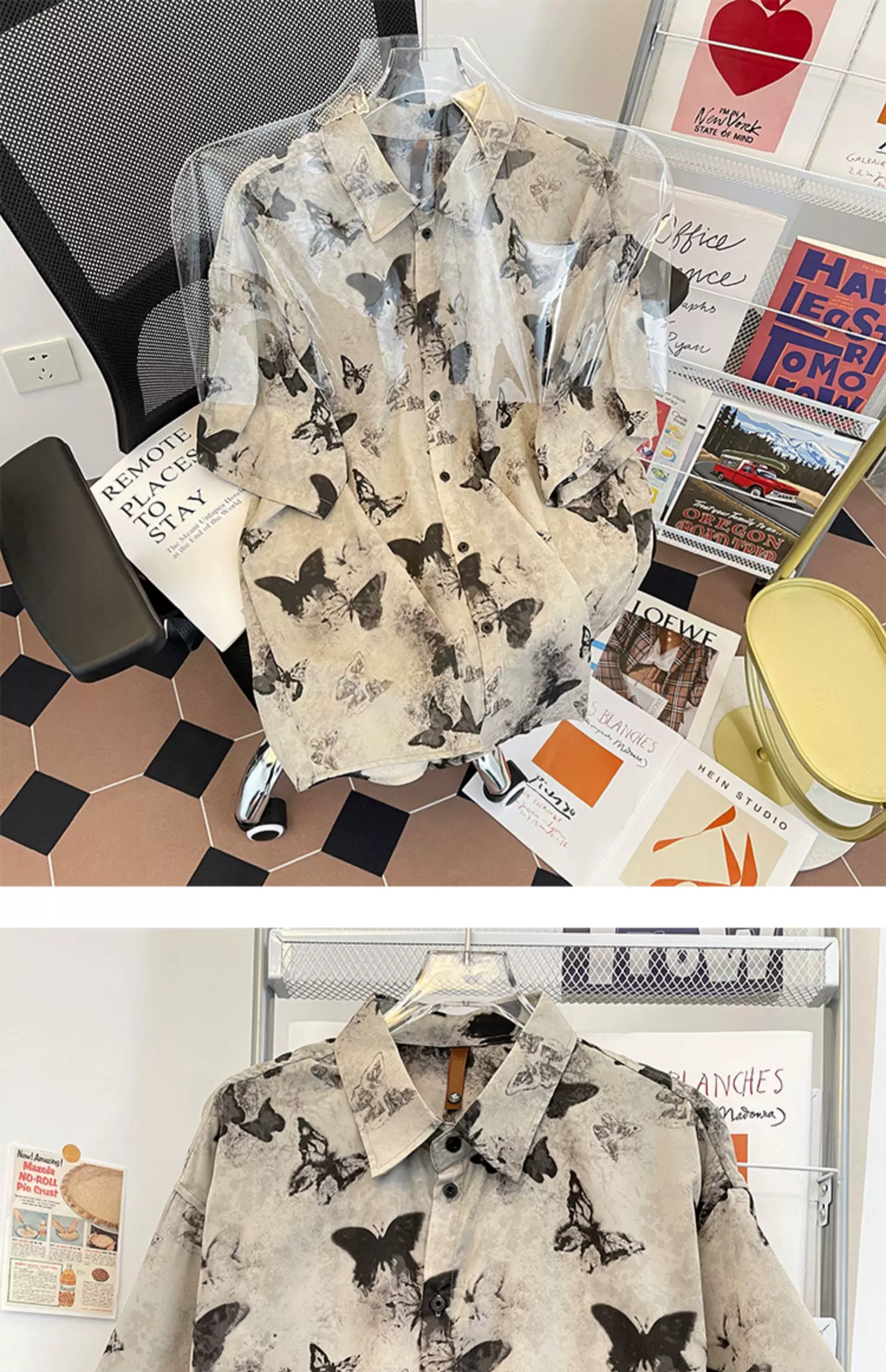 Áo sơ mi in họa tiết tie-dye hình bướm dành cho nam và nữ, áo sơ mi lụa đá mùa hè mới 2024, kiểu dáng rộng rãi, thời trang, chất liệu mát mẻ.