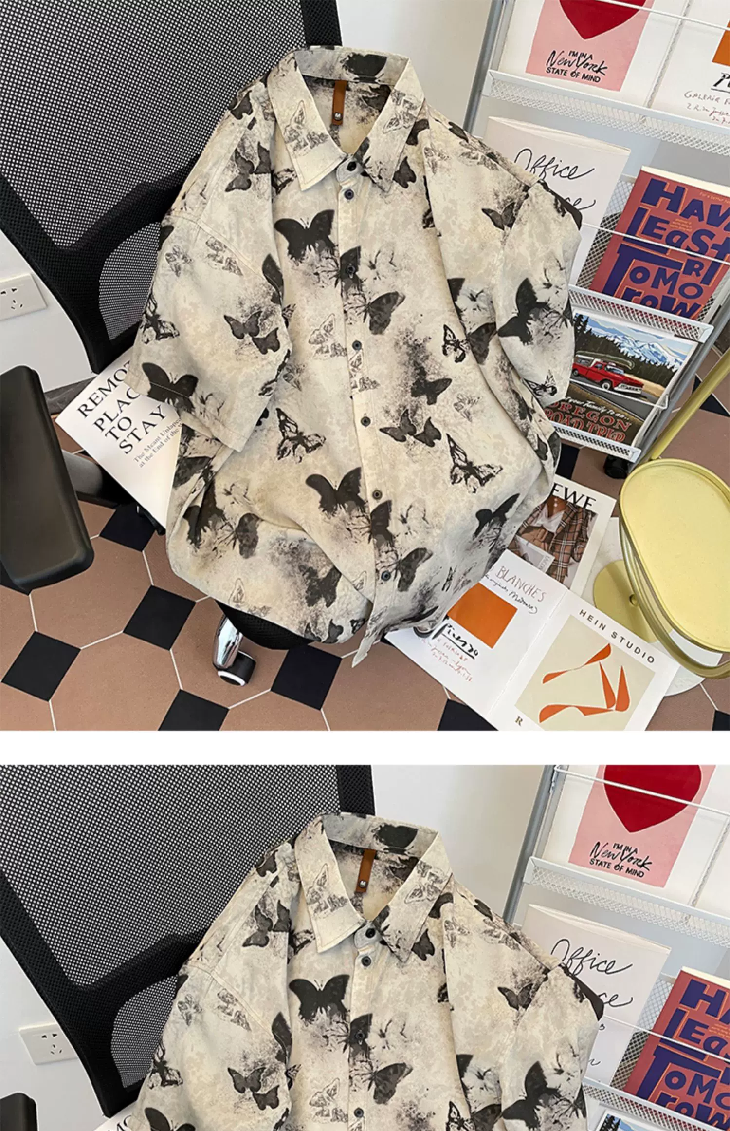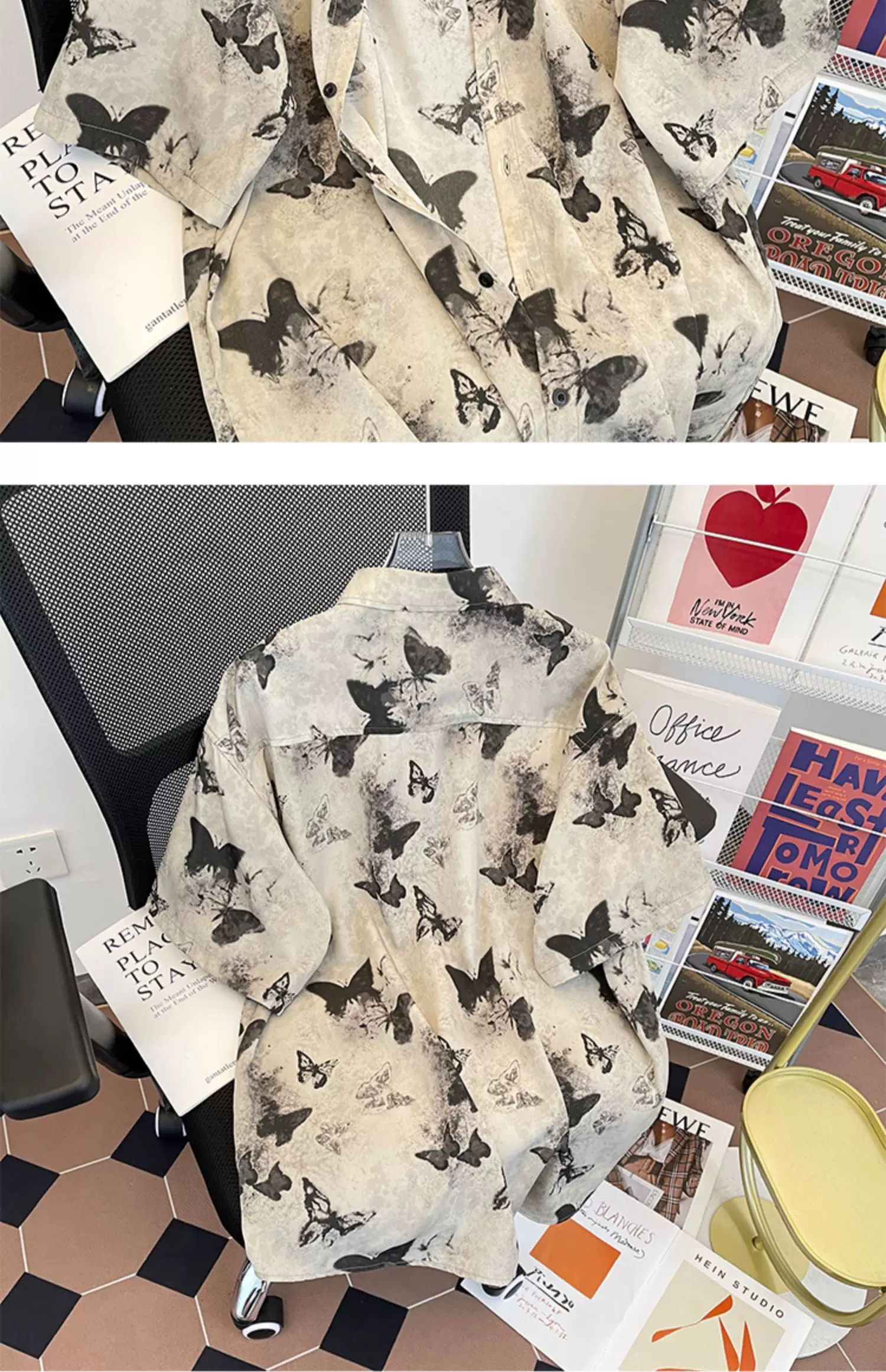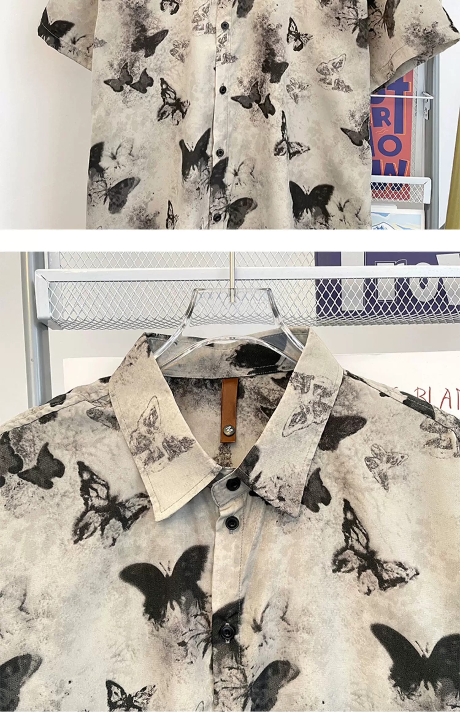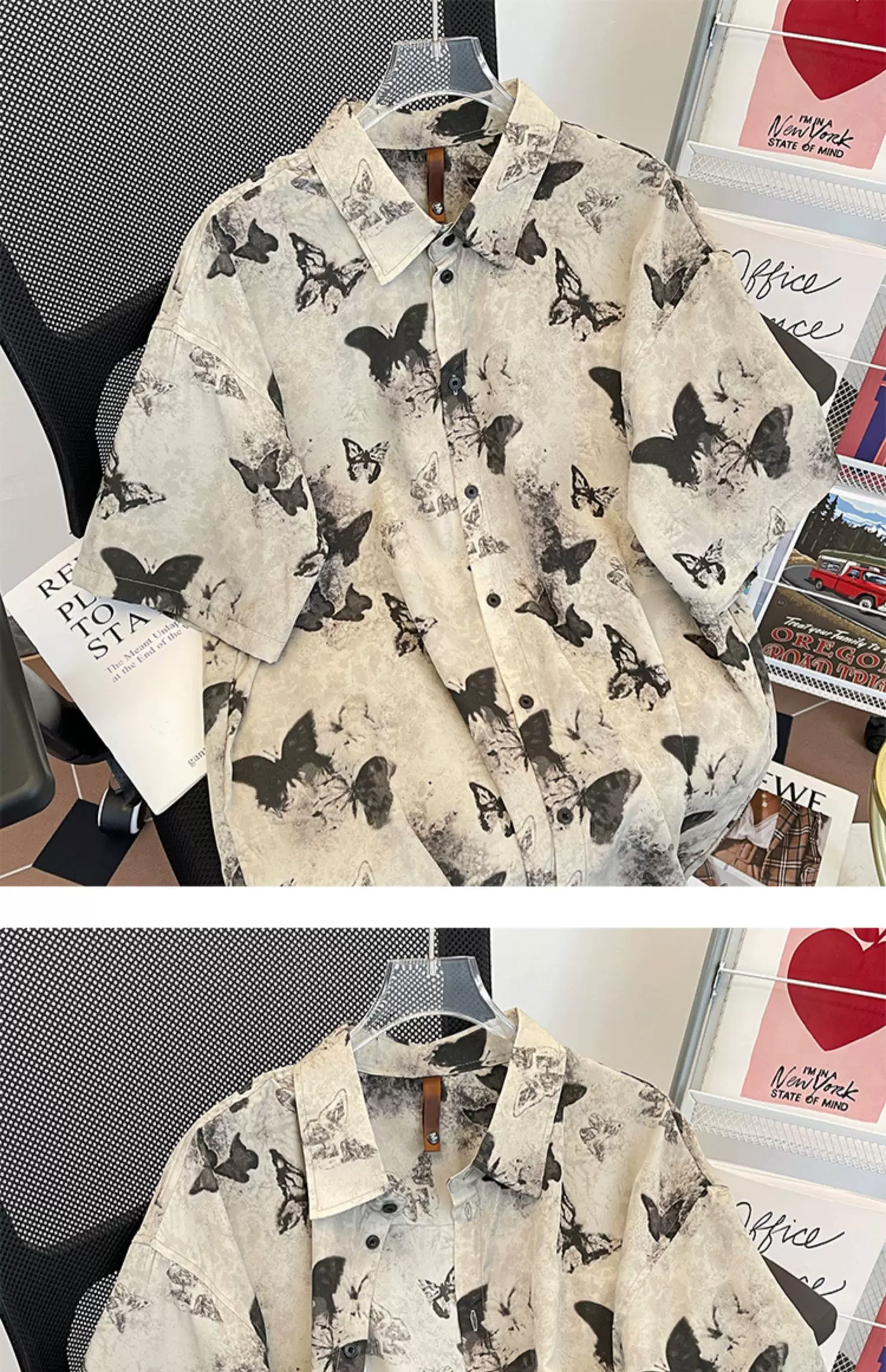 Áo sơ mi in họa tiết tie-dye hình bướm dành cho nam và nữ, áo sơ mi lụa đá mùa hè mới 2024, kiểu dáng rộng rãi, thời trang, chất liệu mát mẻ.