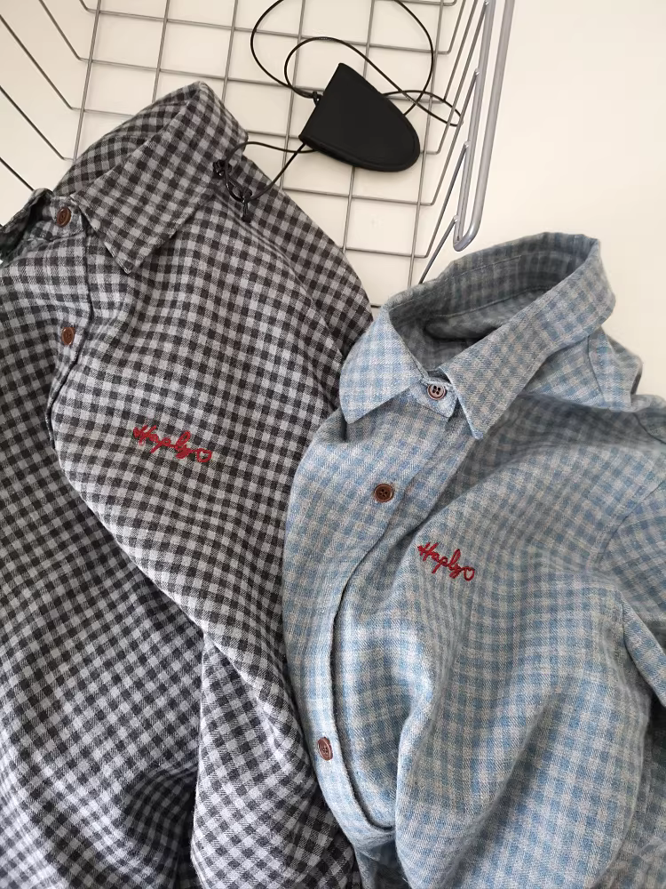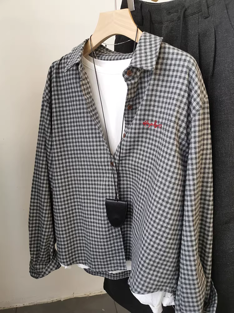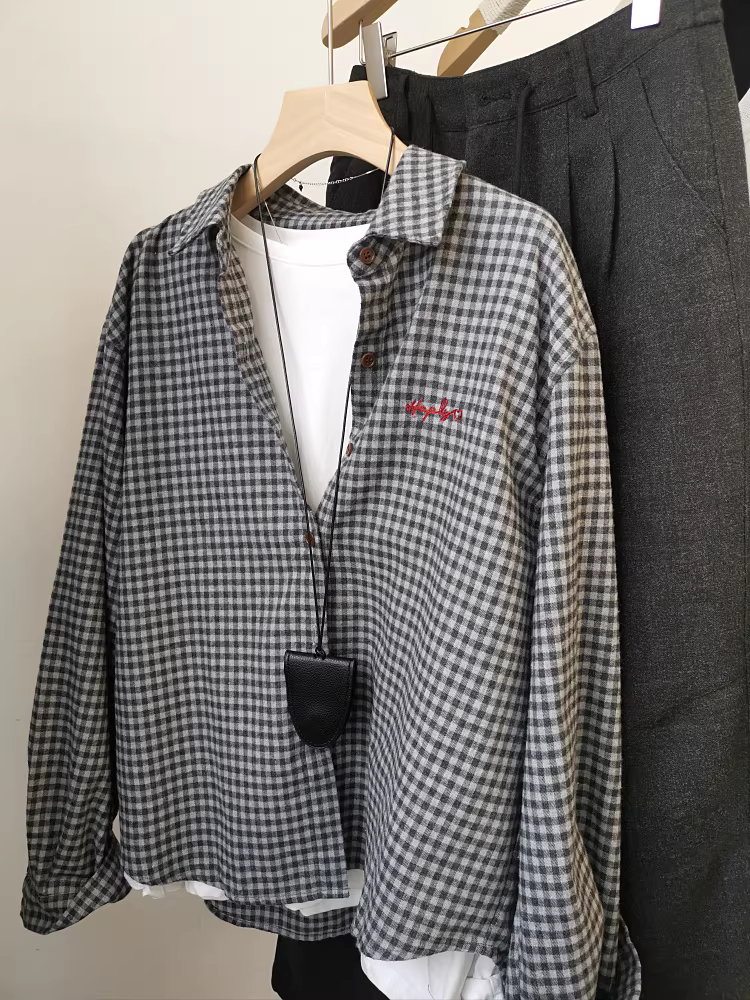 - Áo sơ mi kẻ caro đỏ cổ điển có thêu, chất liệu vải mềm mại, kiểu dáng rộng rãi năm 2025, hai màu
