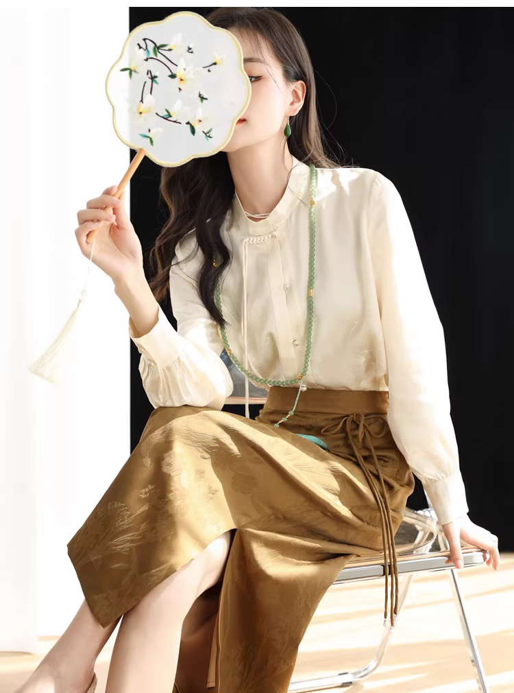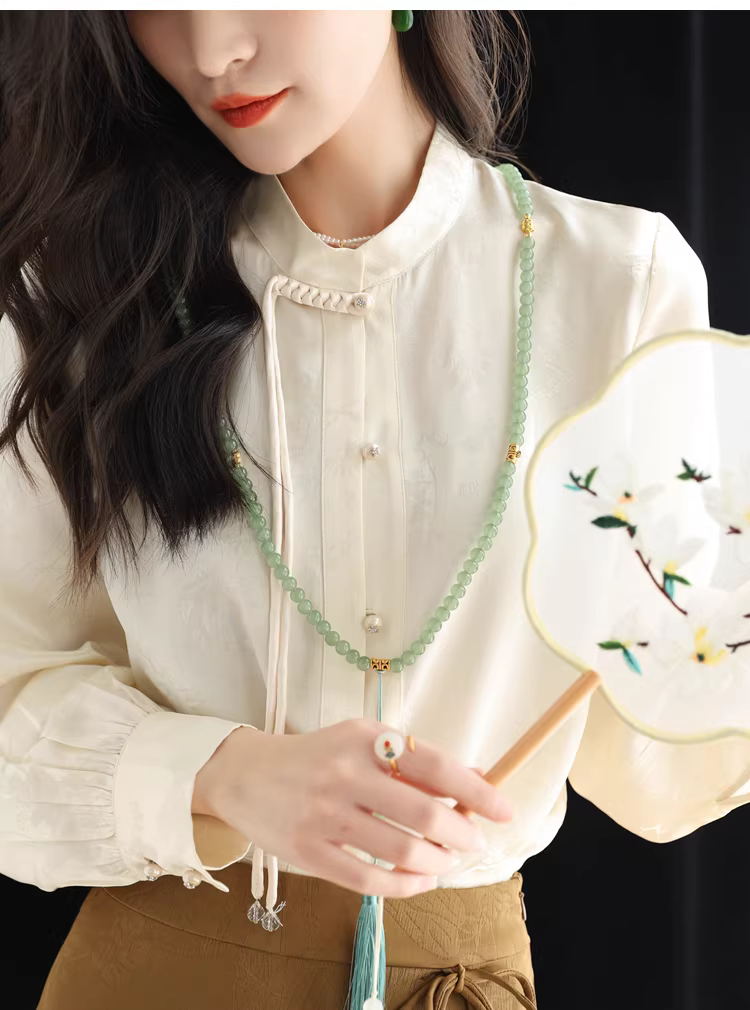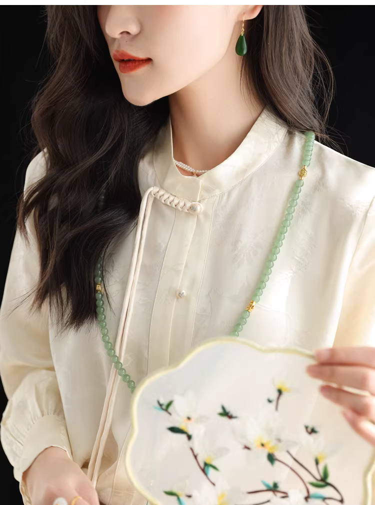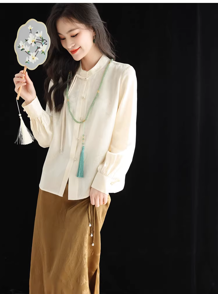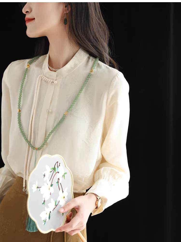 - Áo sơ mi lụa cải tiến kiểu Trung Quốc mới dành cho nữ, mùa xuân, áo cổ đứng bằng lụa dâu tằm jacquard nặng 32 momme.