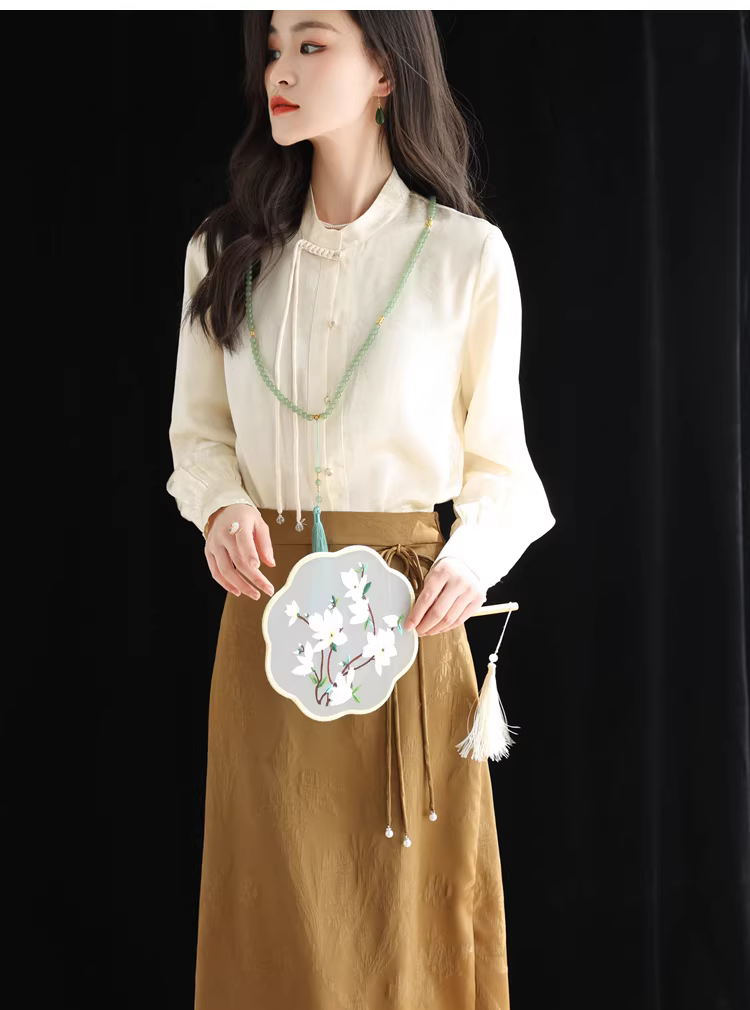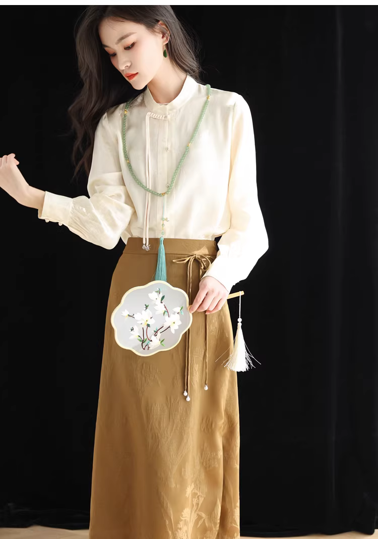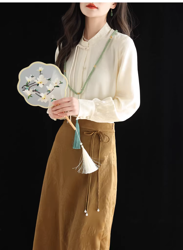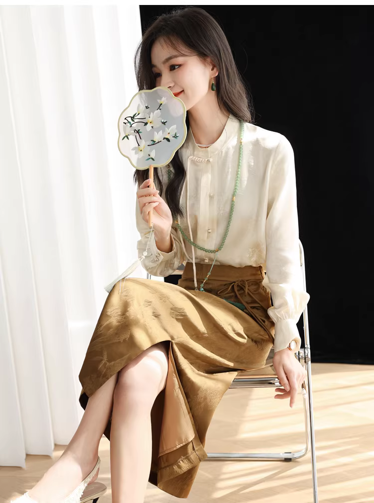 - Áo sơ mi lụa cải tiến kiểu Trung Quốc mới dành cho nữ, mùa xuân, áo cổ đứng bằng lụa dâu tằm jacquard nặng 32 momme.