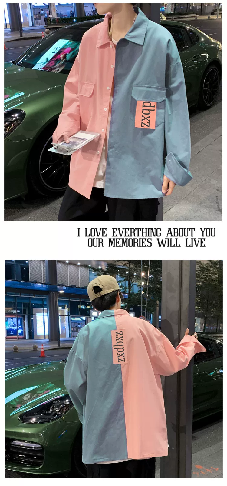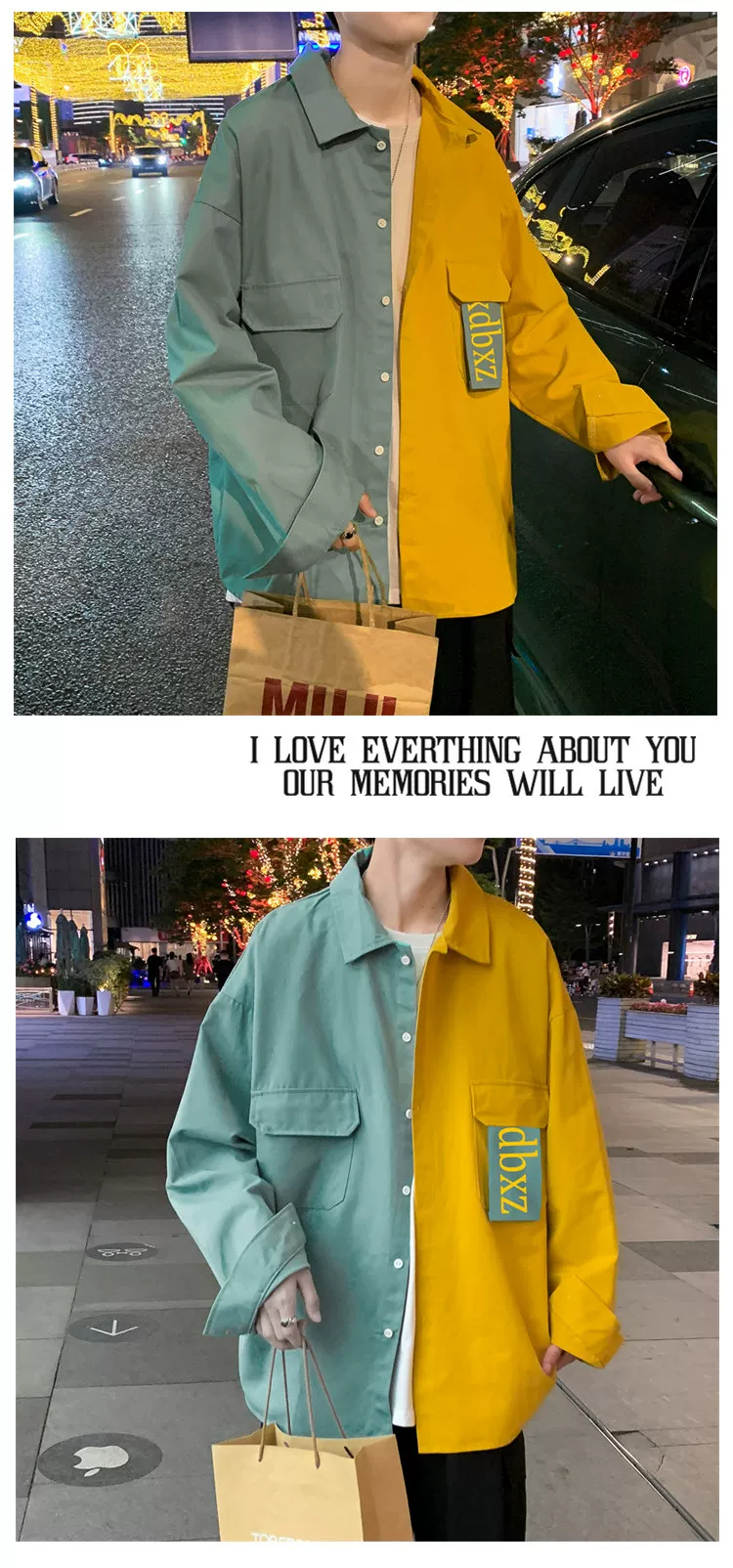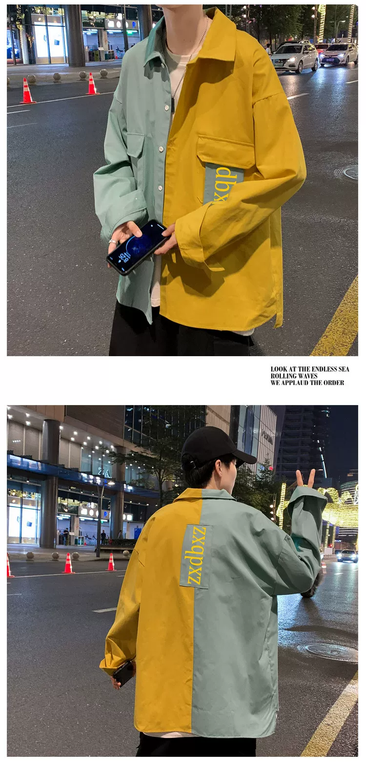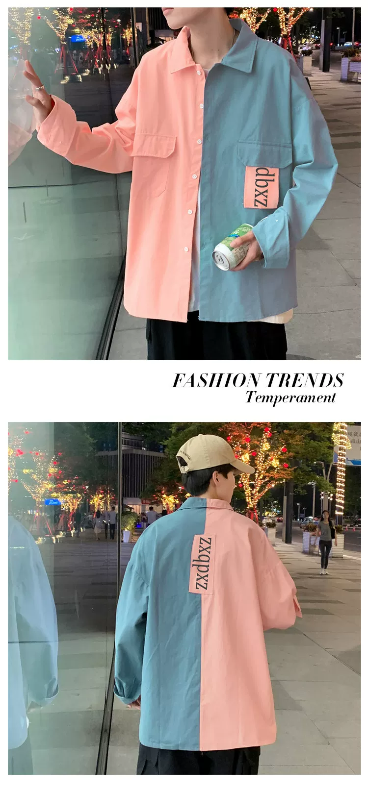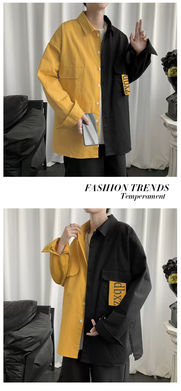 Áo sơ mi nam dài tay, phong cách Hồng Kông thời thượng, phối màu, dáng rộng, áo khoác thường ngày xuân/hè.