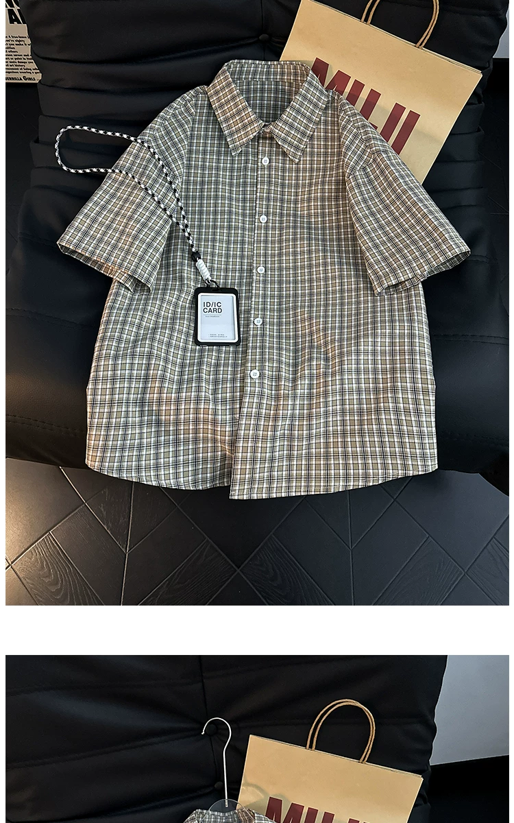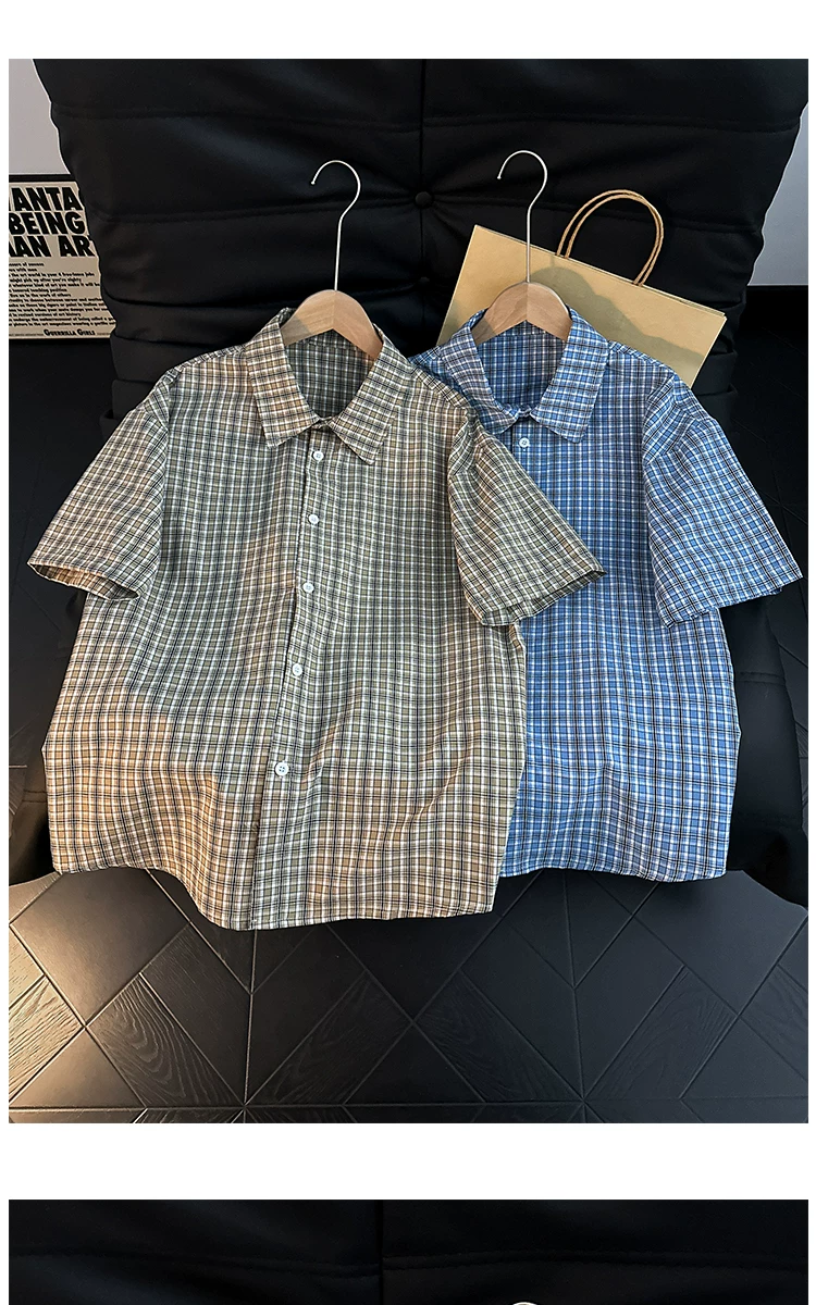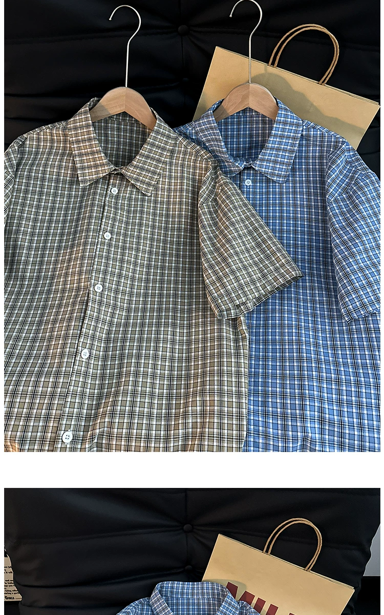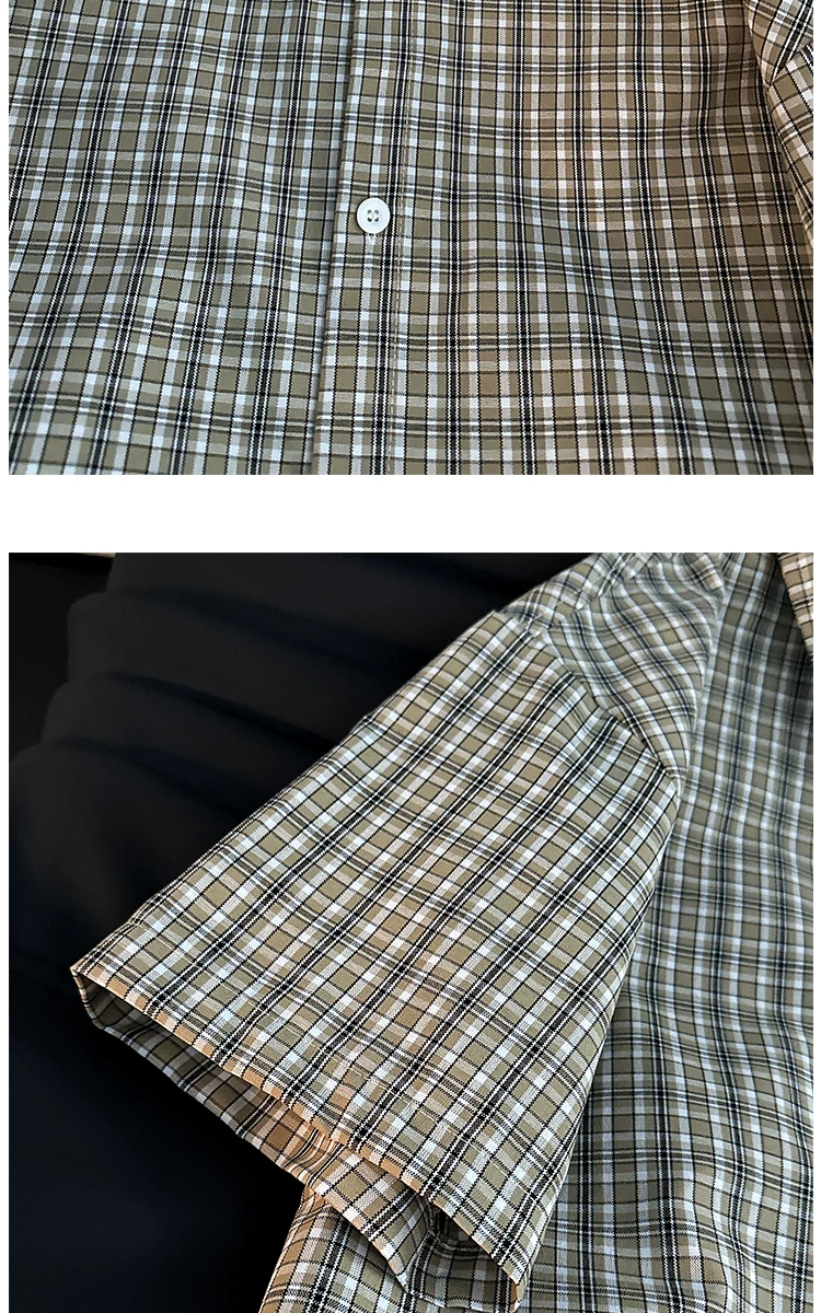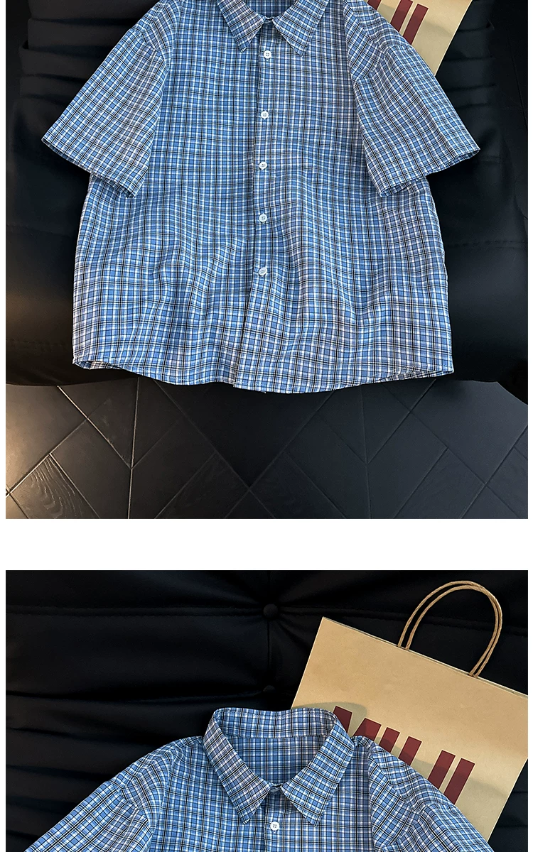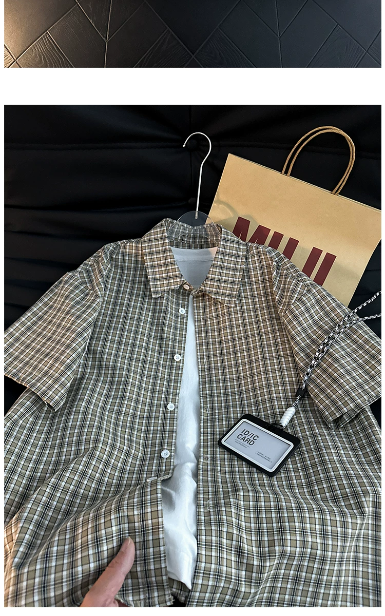 - Áo sơ mi ngắn tay kẻ sọc phong cách retro của Mỹ dành cho nam, áo khoác sơ mi dáng rộng mùa hè, áo nửa tay thông thường của thương hiệu thời thượng