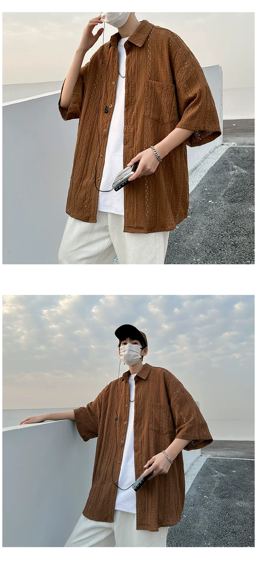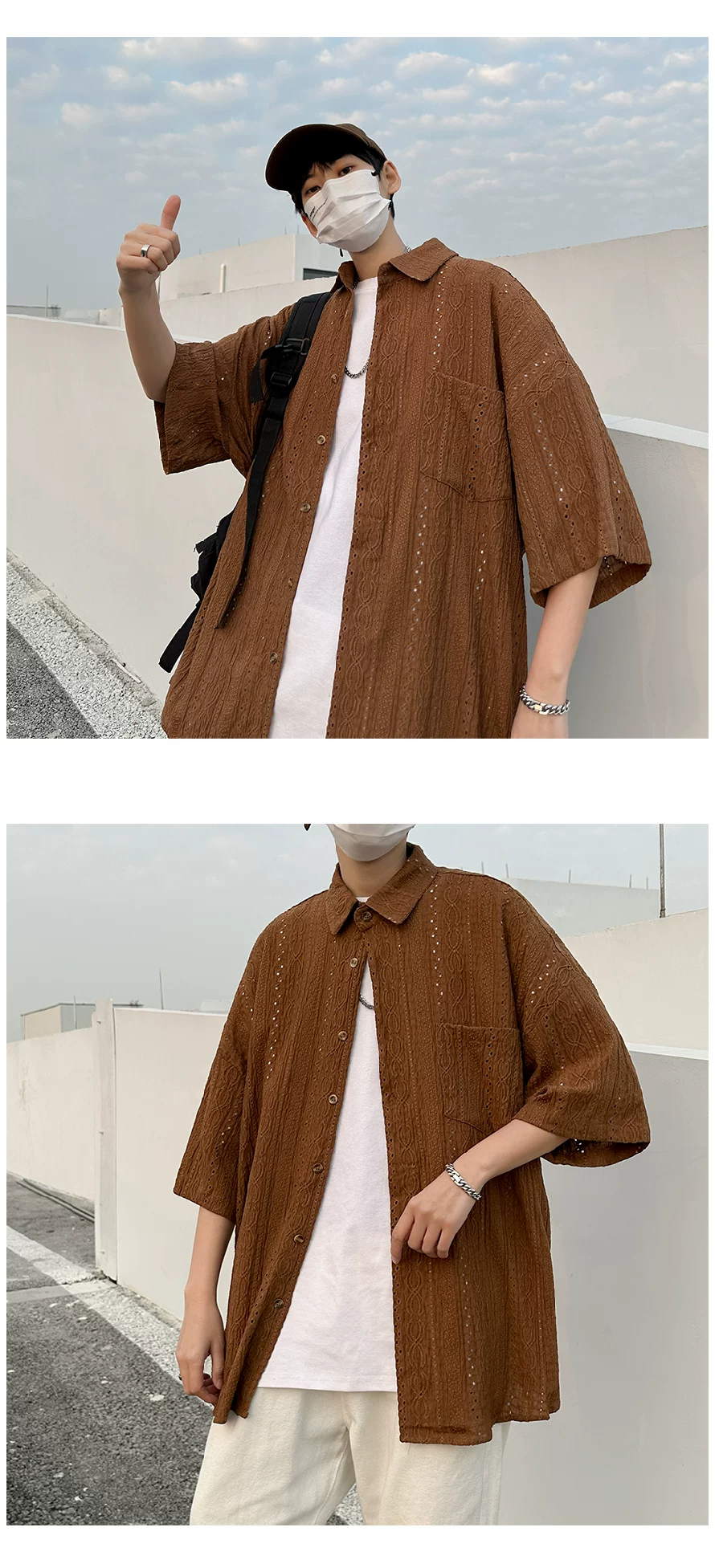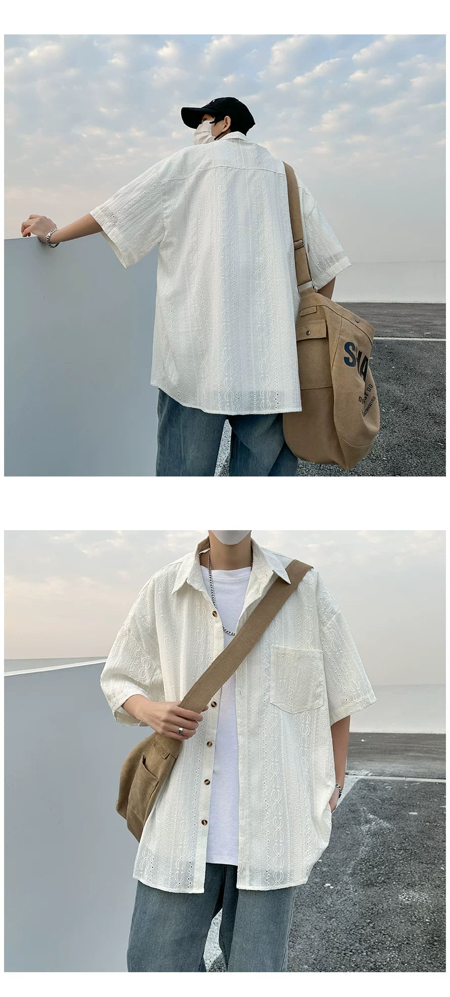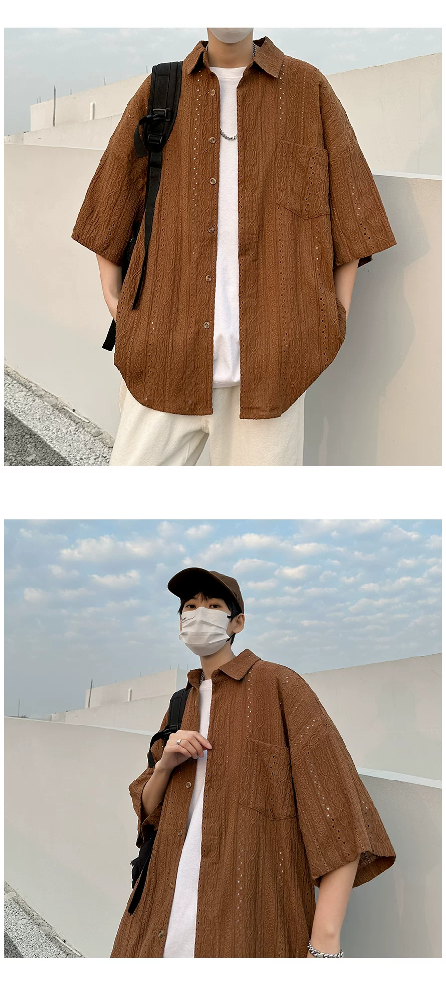 - Áo sơ mi ngắn tay khoét lỗ Jacquard dành cho nam, áo kiểu dáng thời trang mùa hè, áo sơ mi dáng rộng phong cách retro Nhật Bản.