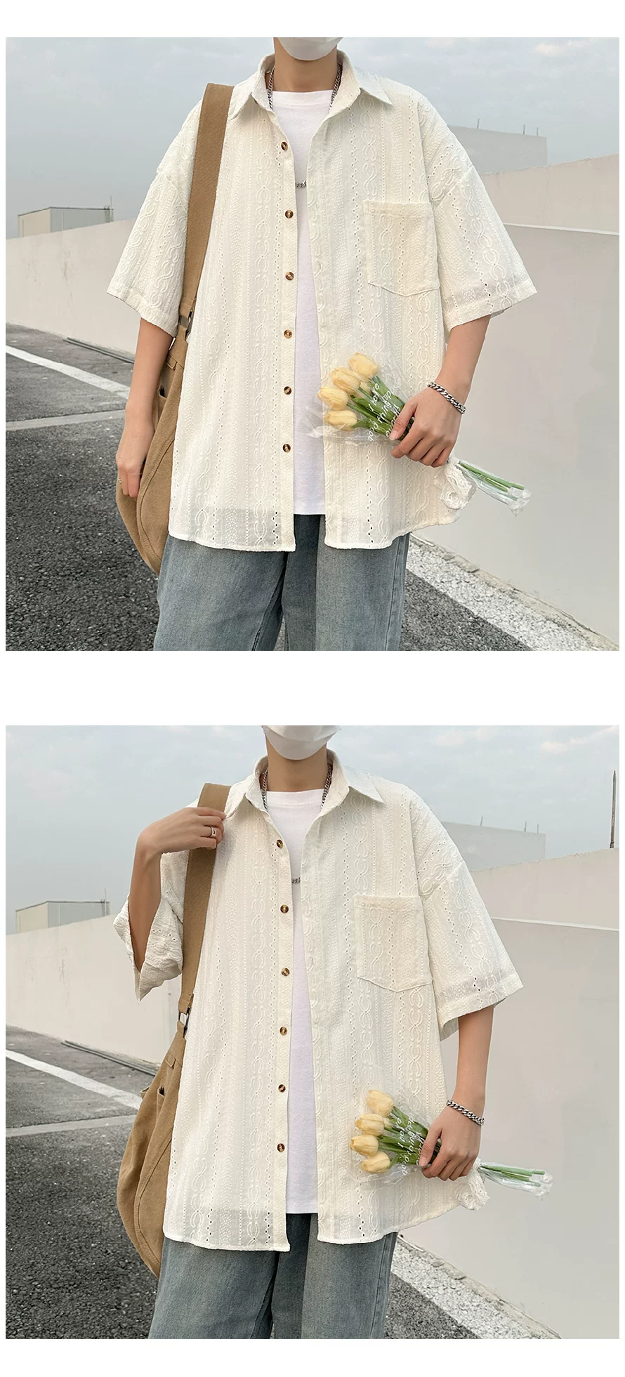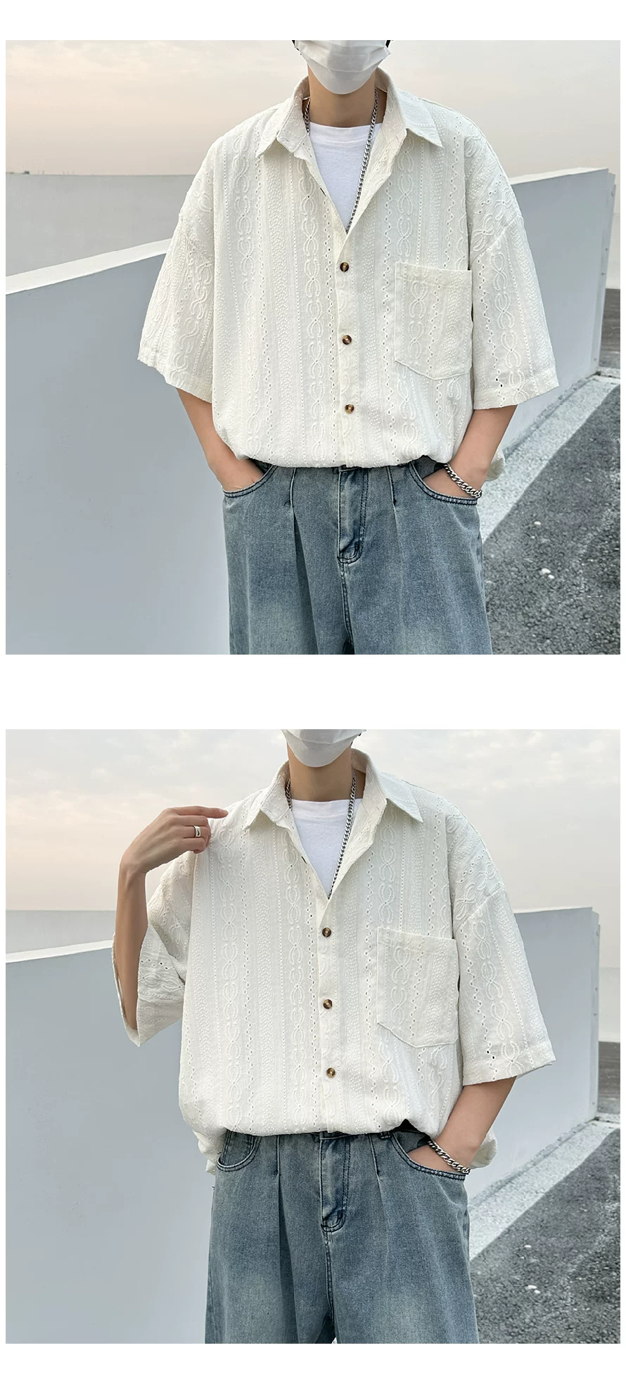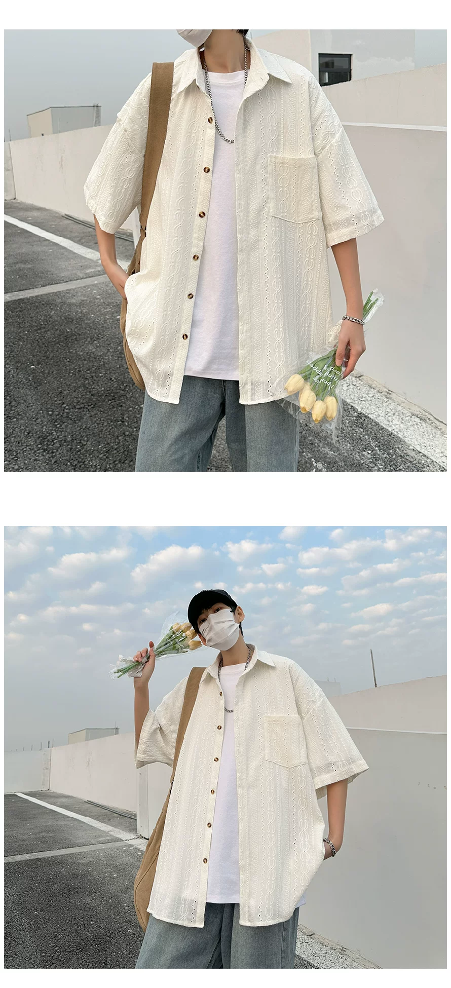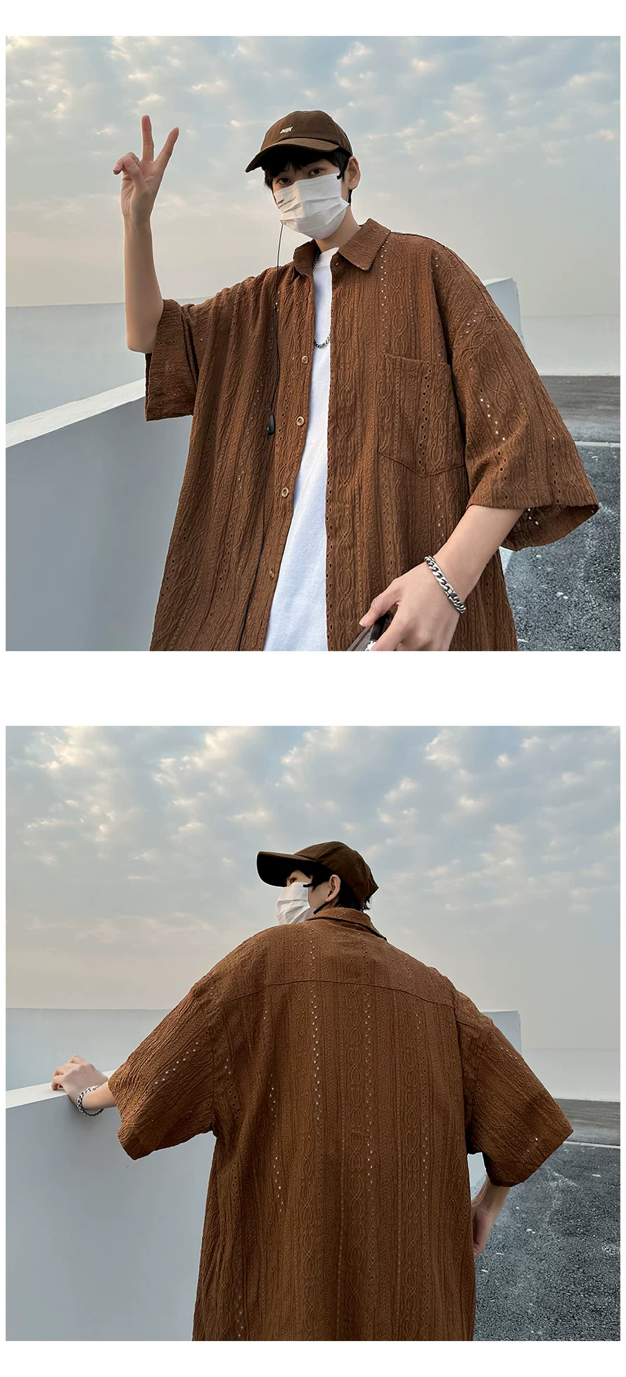 - Áo sơ mi ngắn tay khoét lỗ Jacquard dành cho nam, áo kiểu dáng thời trang mùa hè, áo sơ mi dáng rộng phong cách retro Nhật Bản.