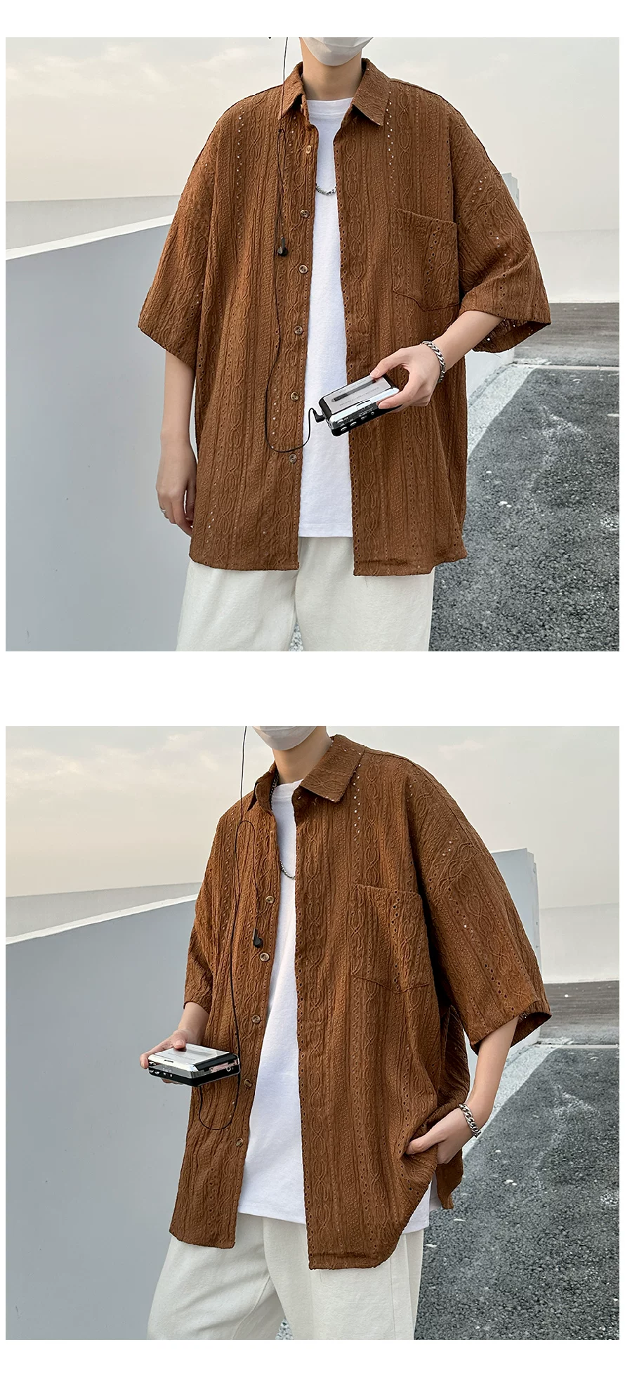 Áo sơ mi ngắn tay khoét lỗ Jacquard dành cho nam, áo kiểu dáng thời trang mùa hè, áo sơ mi dáng rộng phong cách retro Nhật Bản.
