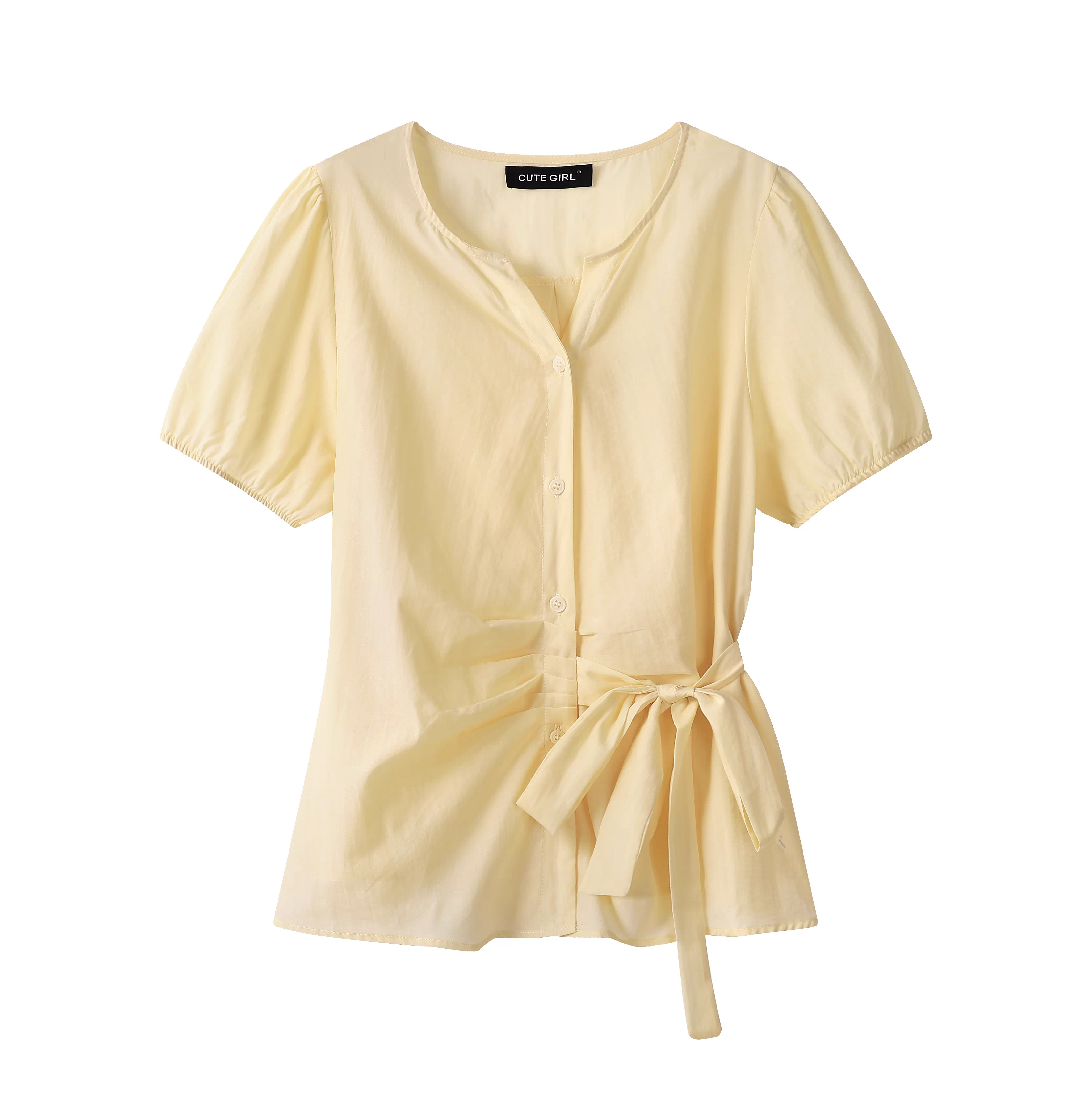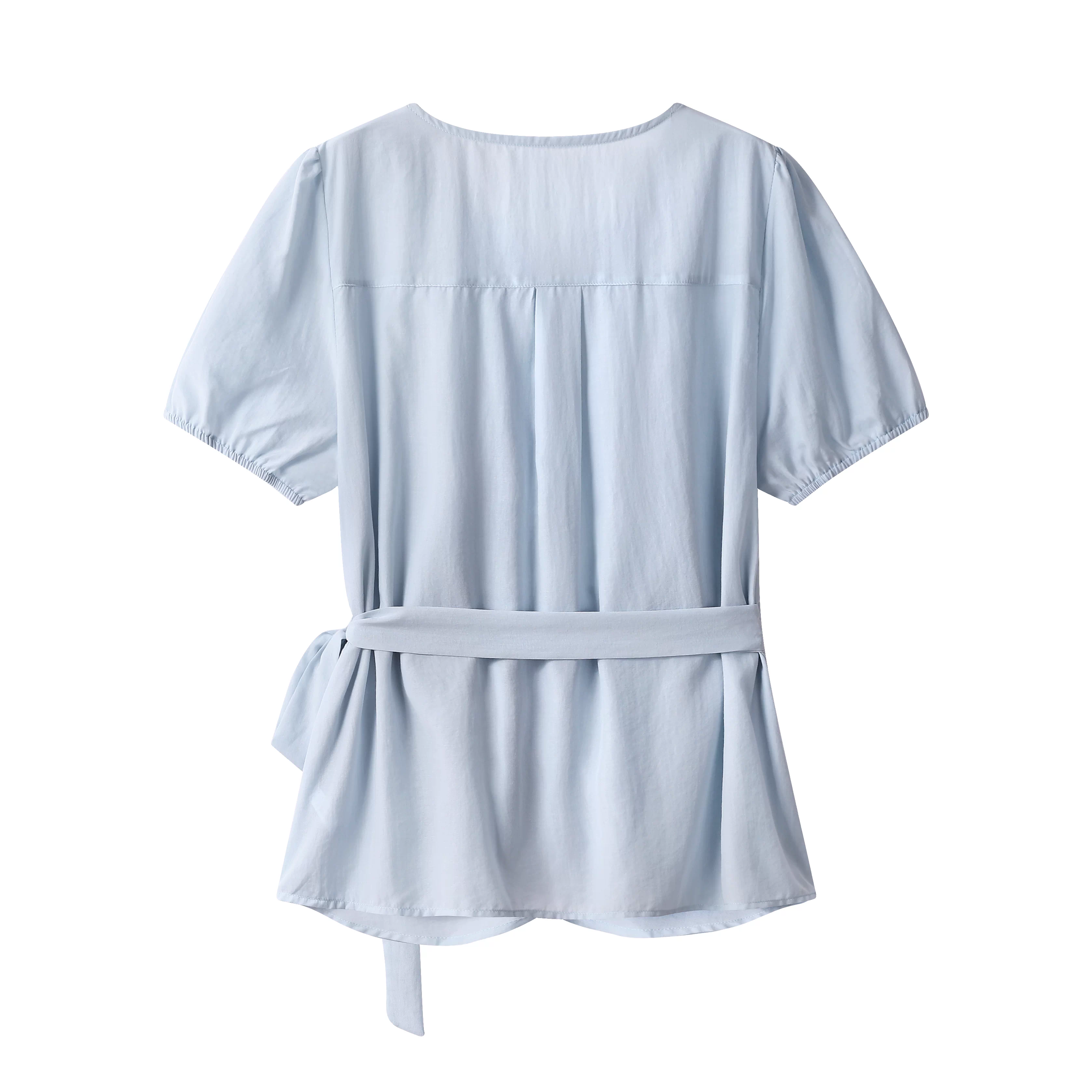 Áo sơ mi ngắn tay thiết kế theo phong cách Hàn Quốc cổ chữ V thắt eo dành cho nữ, áo tay phồng độc đáo mùa hè
