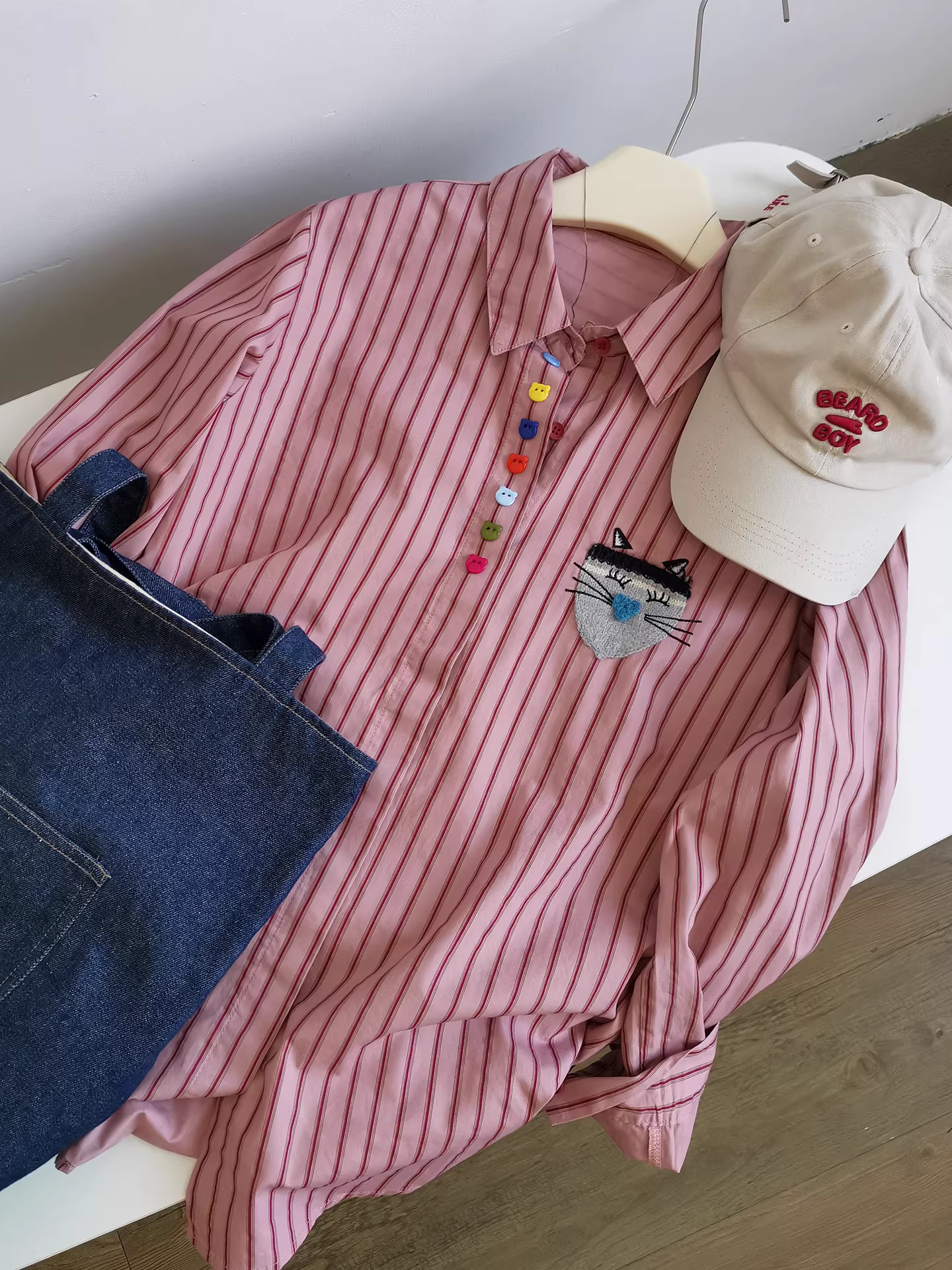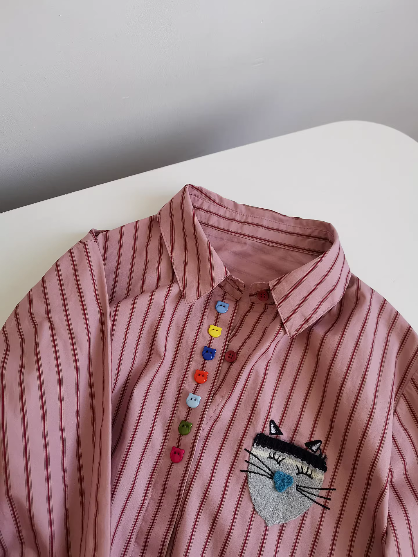 Áo sơ mi nữ kẻ sọc dọc, kiểu dáng xuề xòa, họa tiết mèo ria mép, mẫu mới thu đông 2025.