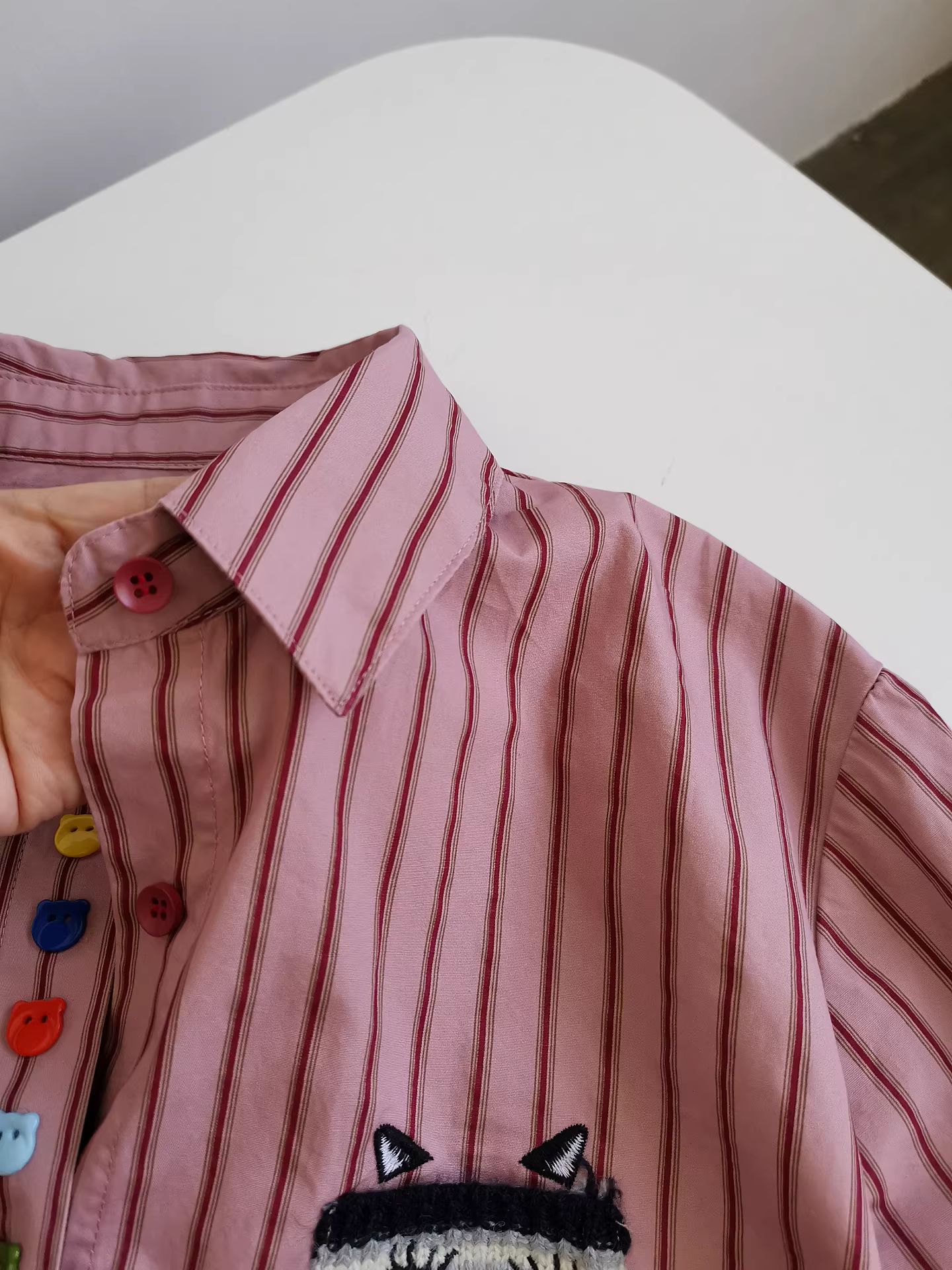 - Áo sơ mi nữ kẻ sọc dọc, kiểu dáng xuề xòa, họa tiết mèo ria mép, mẫu mới thu đông 2025.