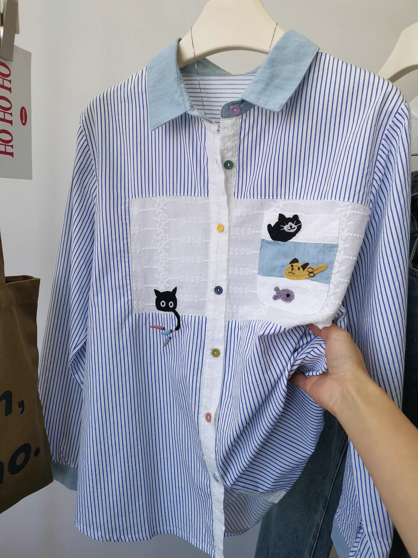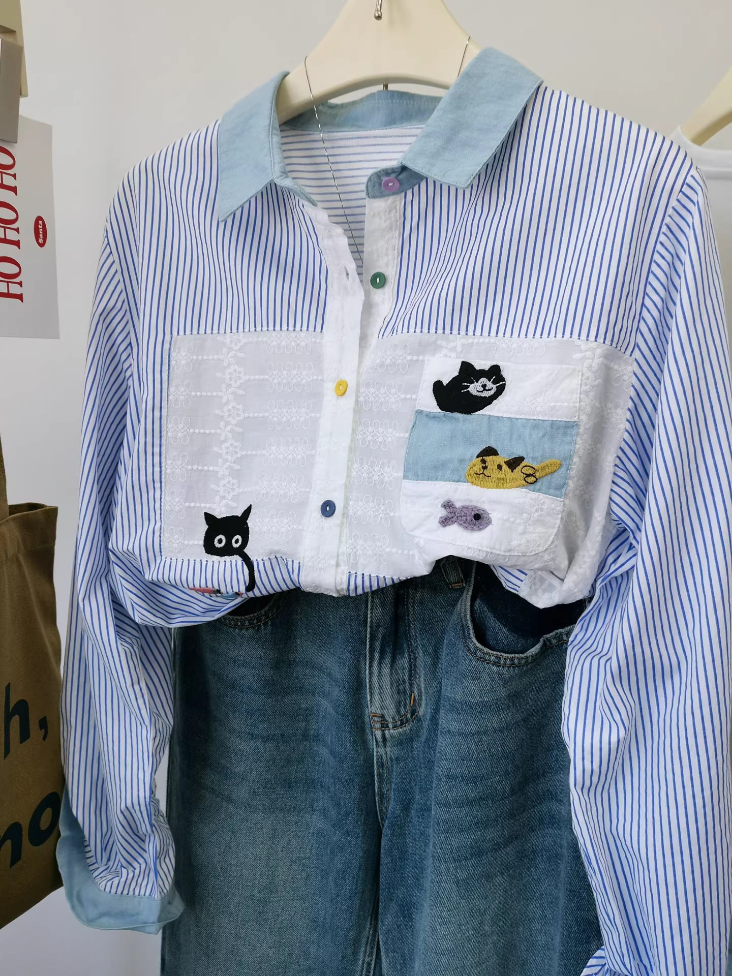 Áo sơ mi nữ phối họa tiết denim thêu hình mèo đen bắt cá, áo sơ mi sọc phối lớp, món đồ thiết yếu