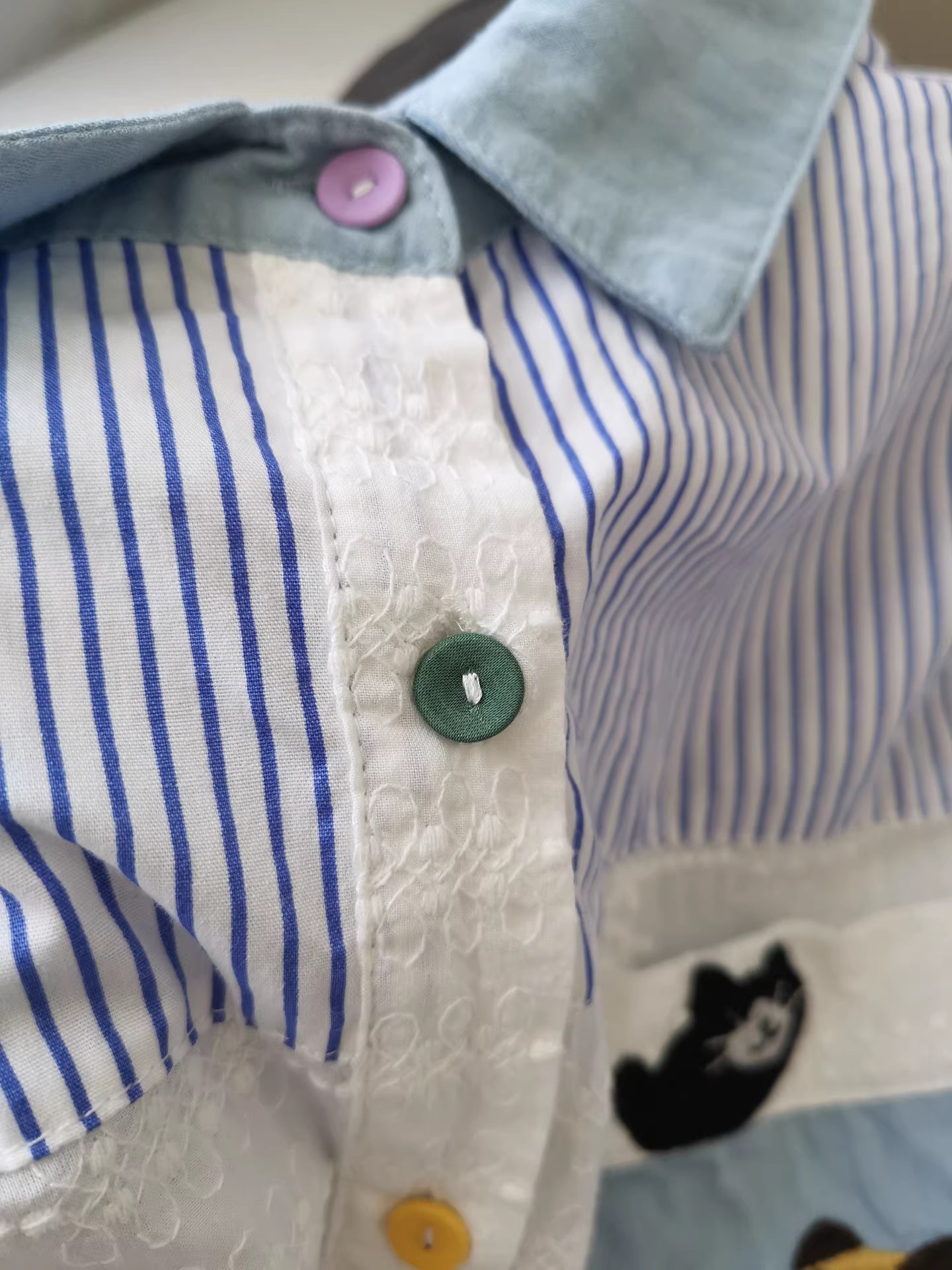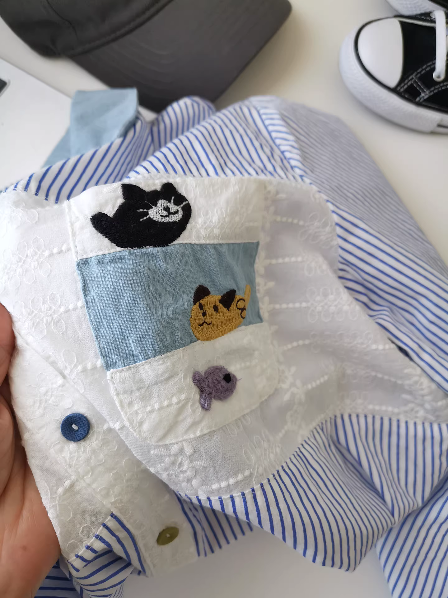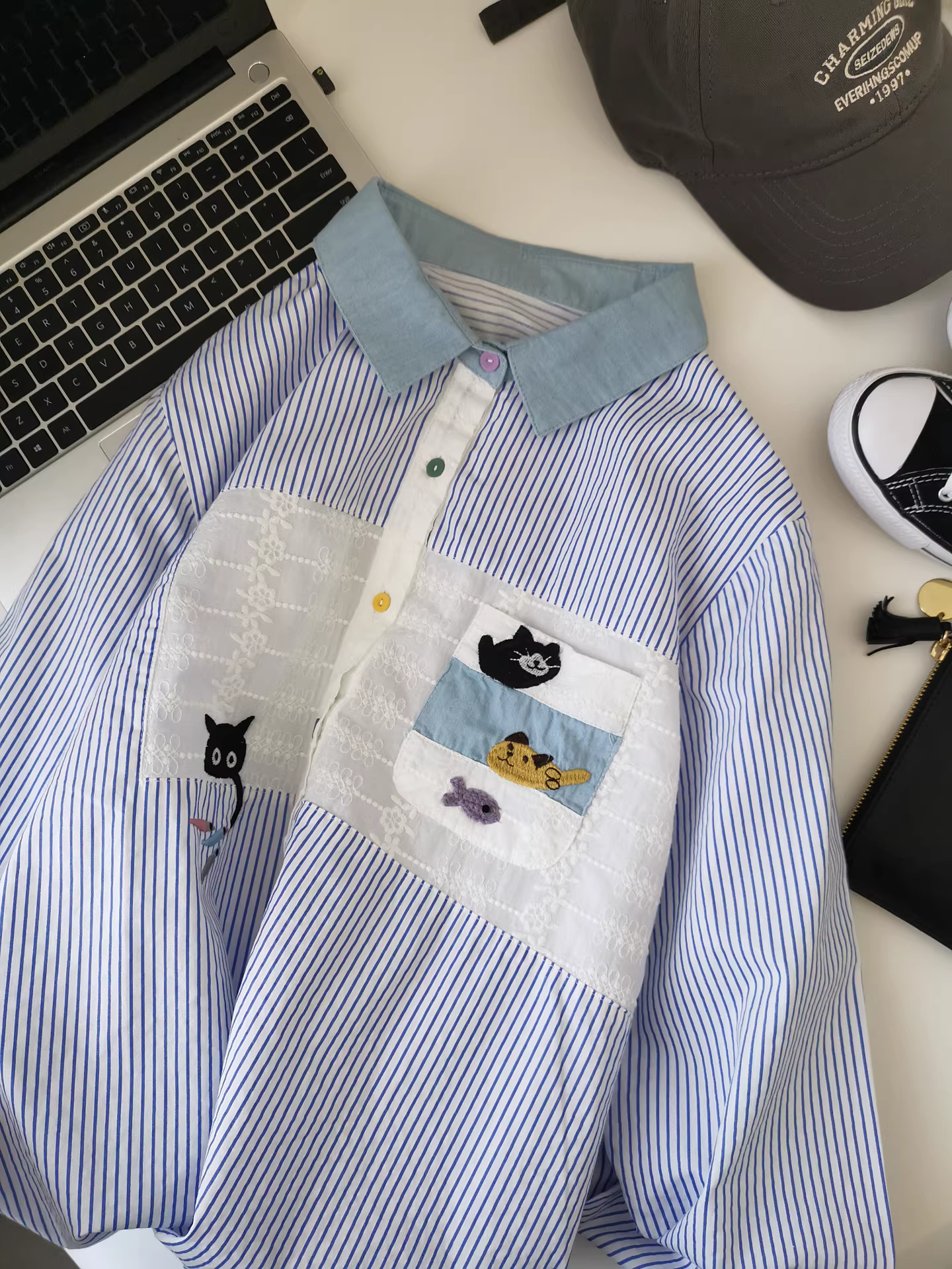 - Áo sơ mi nữ phối họa tiết denim thêu hình mèo đen bắt cá, áo sơ mi sọc phối lớp, món đồ thiết yếu