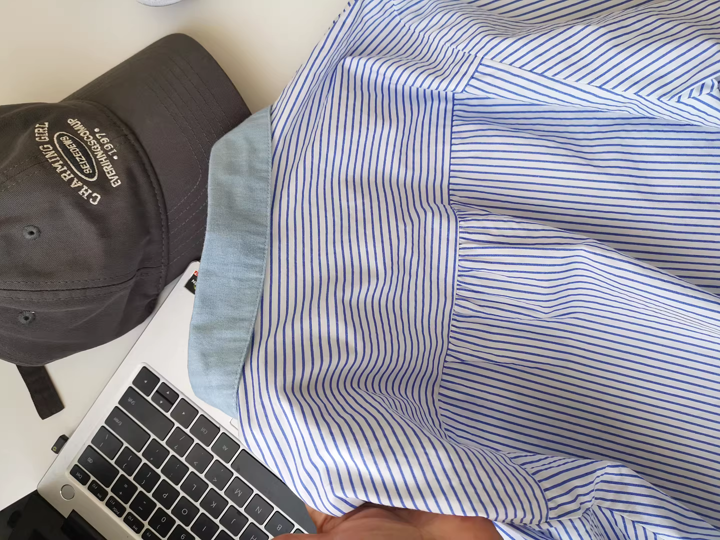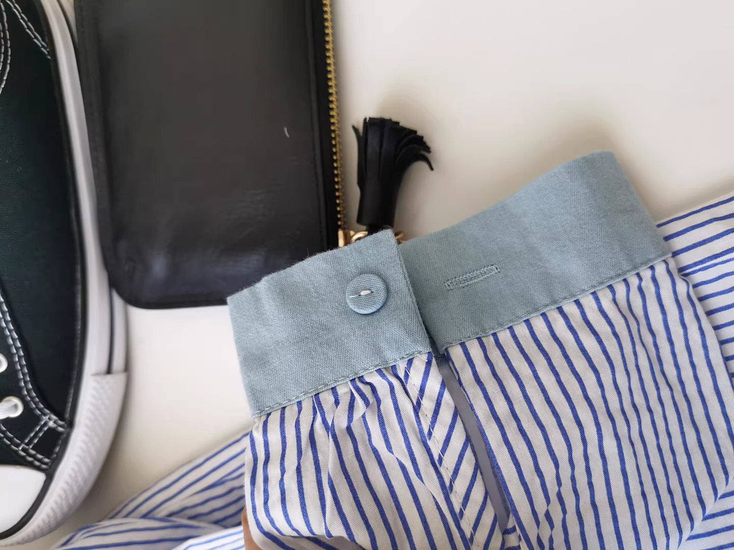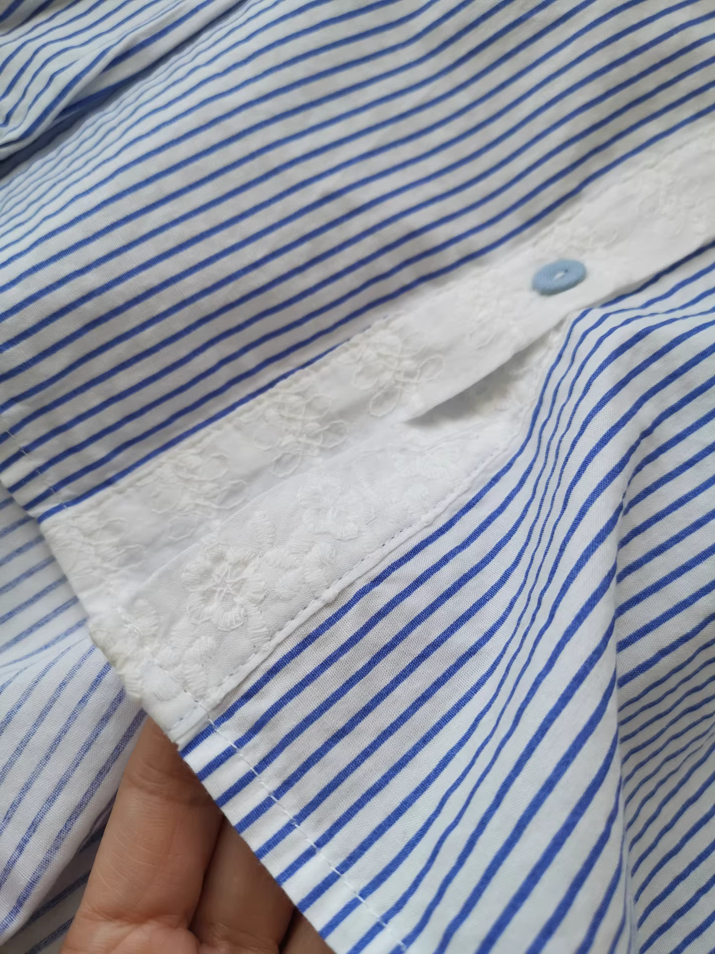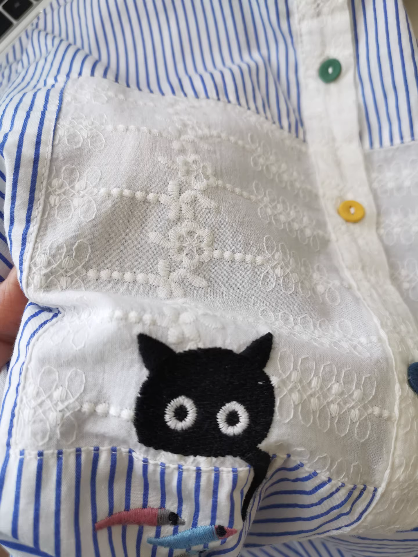 - Áo sơ mi nữ phối họa tiết denim thêu hình mèo đen bắt cá, áo sơ mi sọc phối lớp, món đồ thiết yếu