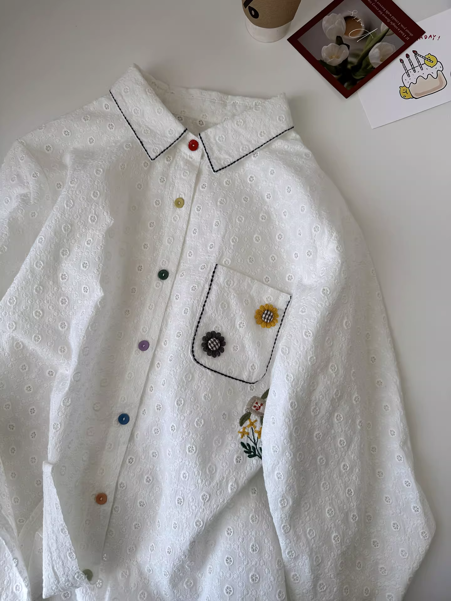 - Áo sơ mi nữ phối màu cổ áo, thêu toàn thân, chất liệu jacquard tinh tế, kiểu dáng mới thu đông 2025, áo dài tay rộng rãi