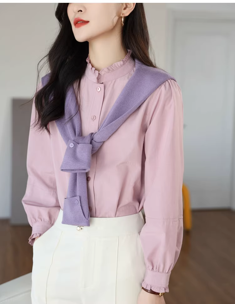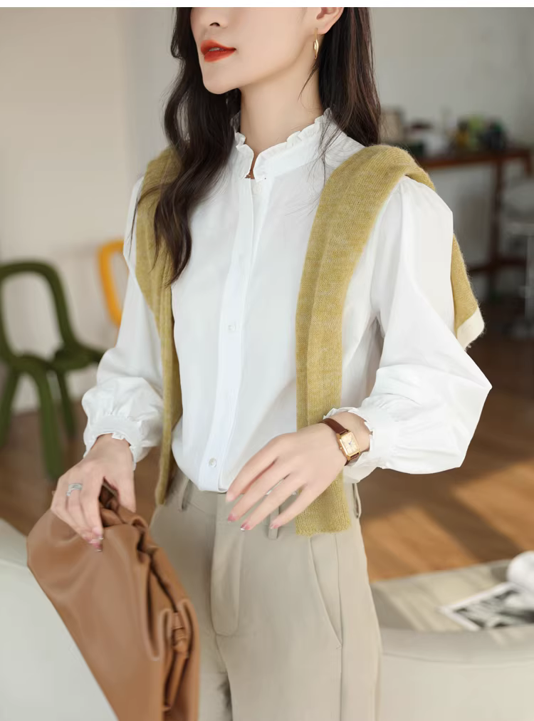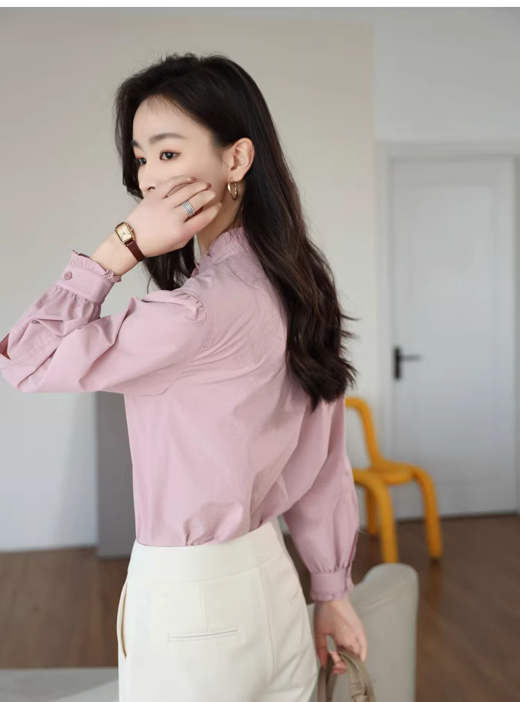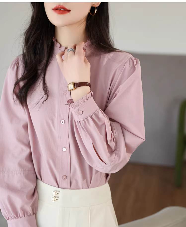 Áo sơ mi nữ tay đèn cotton giặt kiểu Pháp, cổ đứng bèo nhún, tay dài, dáng rộng, mẫu mới xuân hè