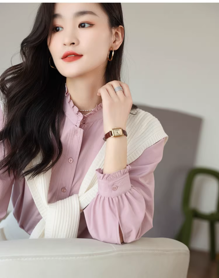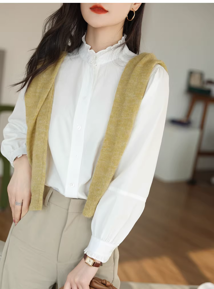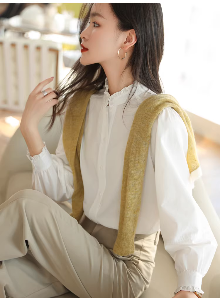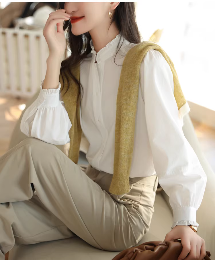 - Áo sơ mi nữ tay đèn cotton giặt kiểu Pháp, cổ đứng bèo nhún, tay dài, dáng rộng, mẫu mới xuân hè
