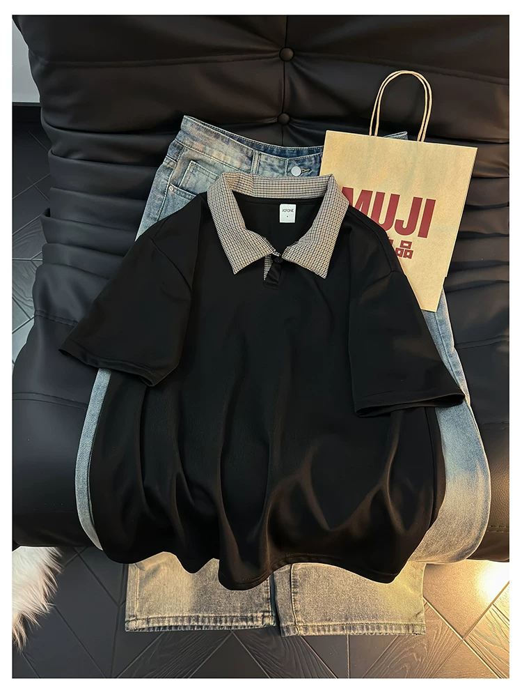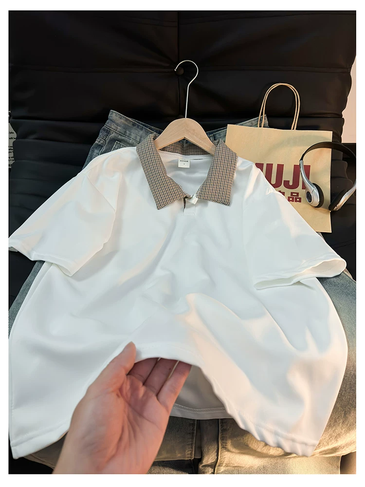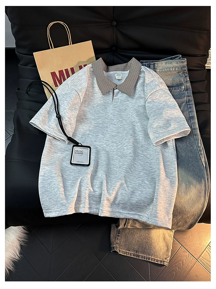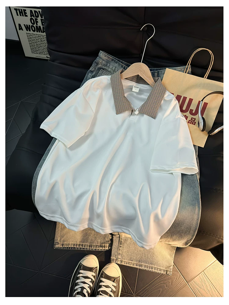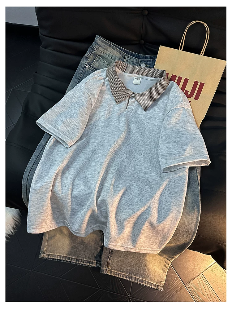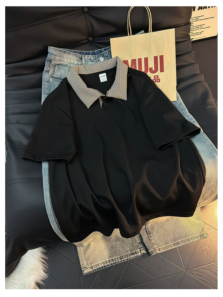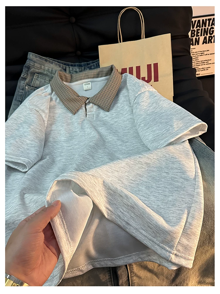 Áo sơ mi Polo tay ngắn kiểu Mỹ dành cho nam, áo thun dáng rộng hợp thời trang mùa hè, áo thun thiết kế chắp vá kẻ sọc