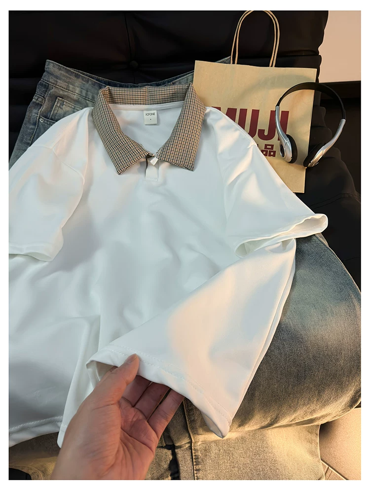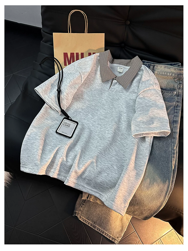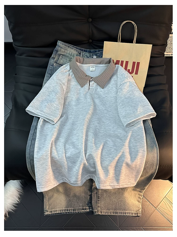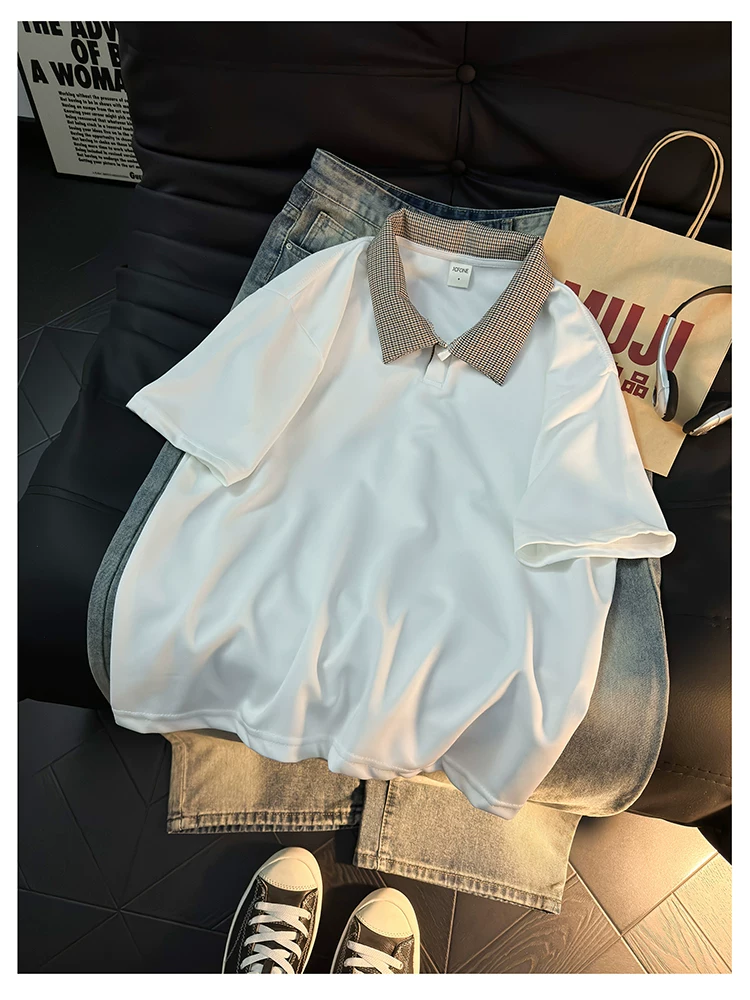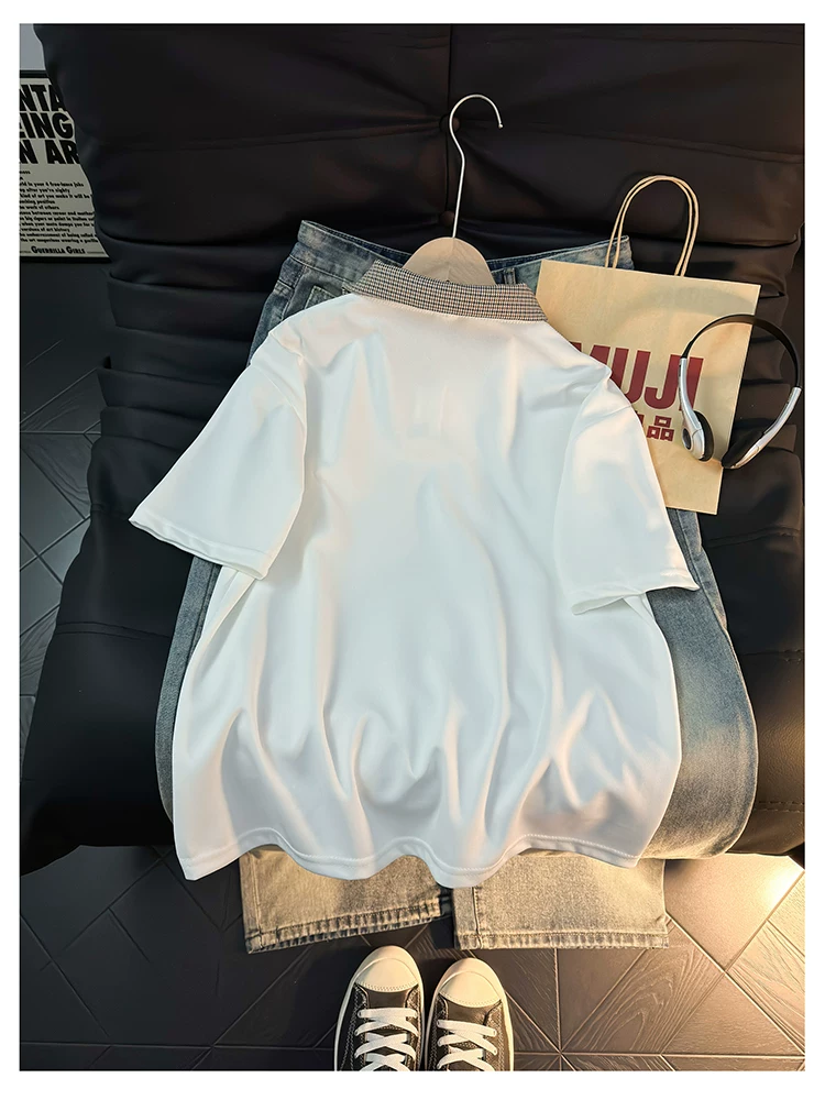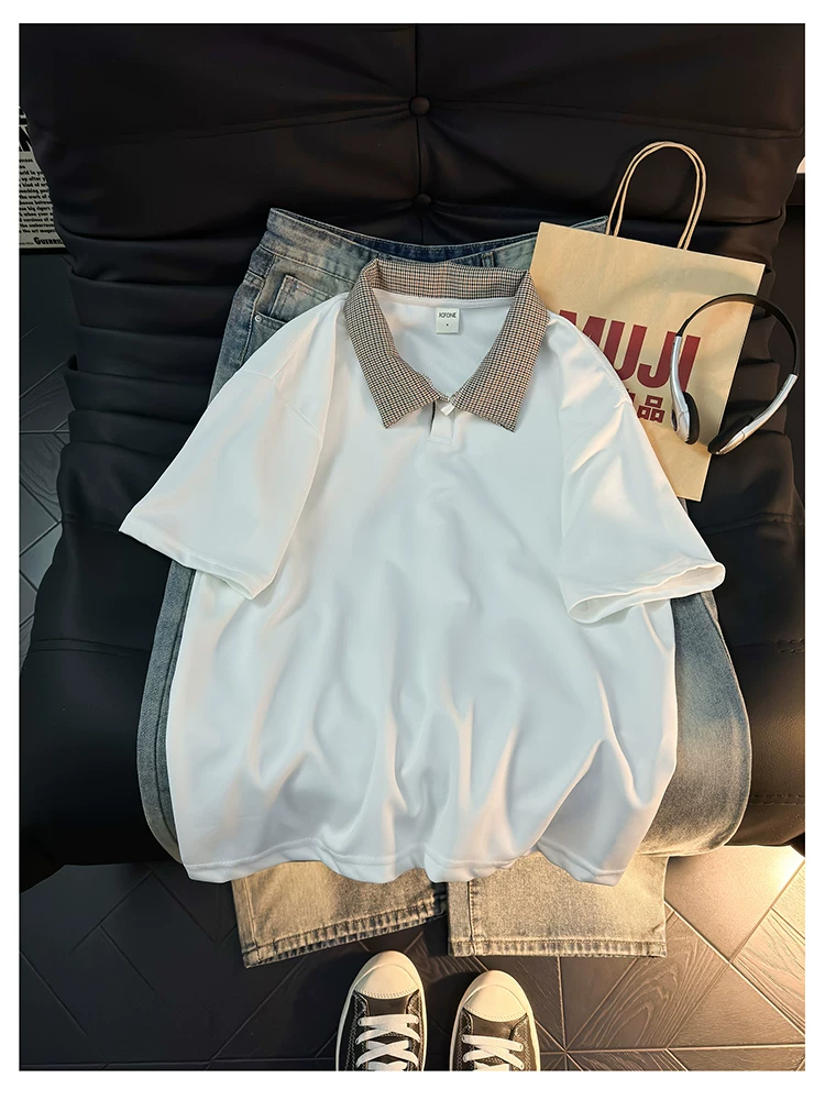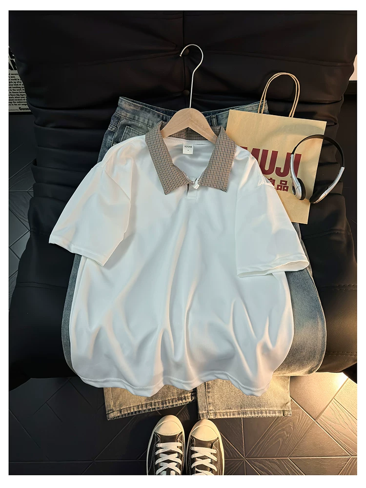 Áo sơ mi Polo tay ngắn kiểu Mỹ dành cho nam, áo thun dáng rộng hợp thời trang mùa hè, áo thun thiết kế chắp vá kẻ sọc