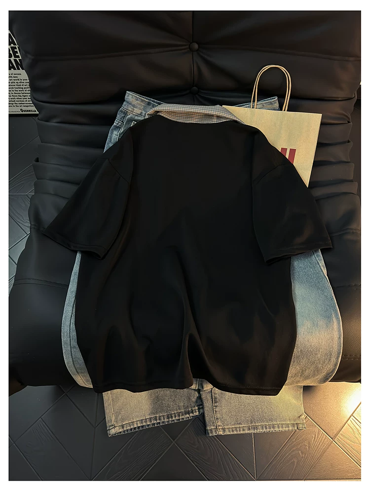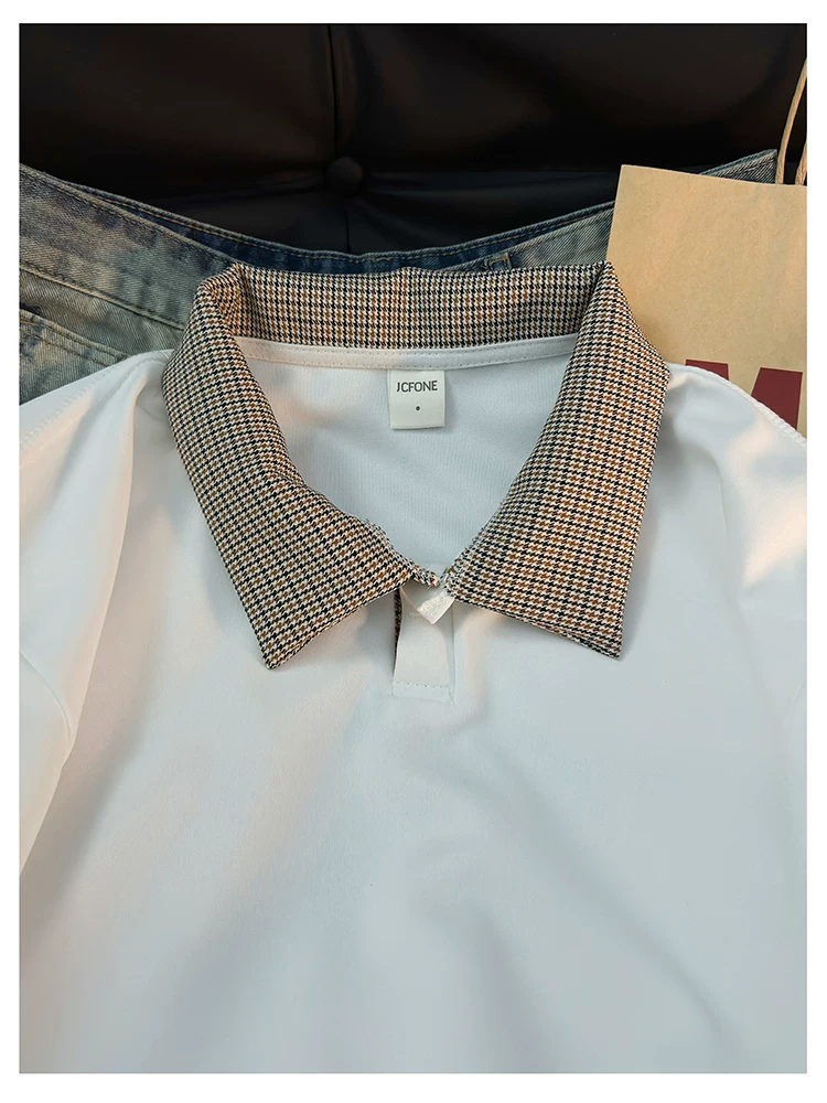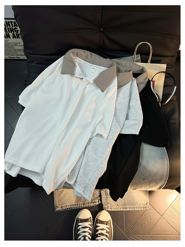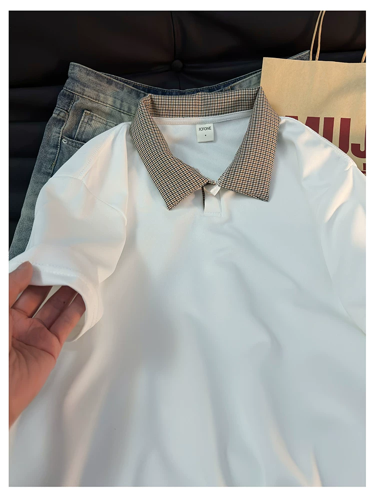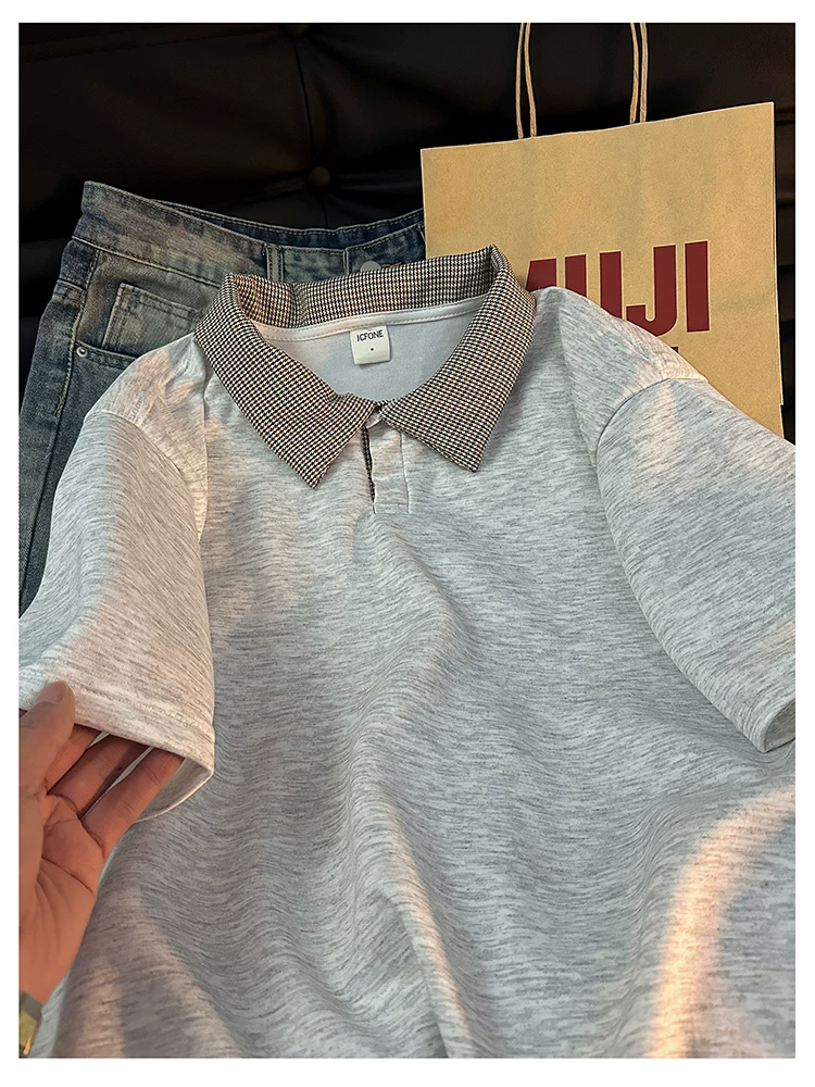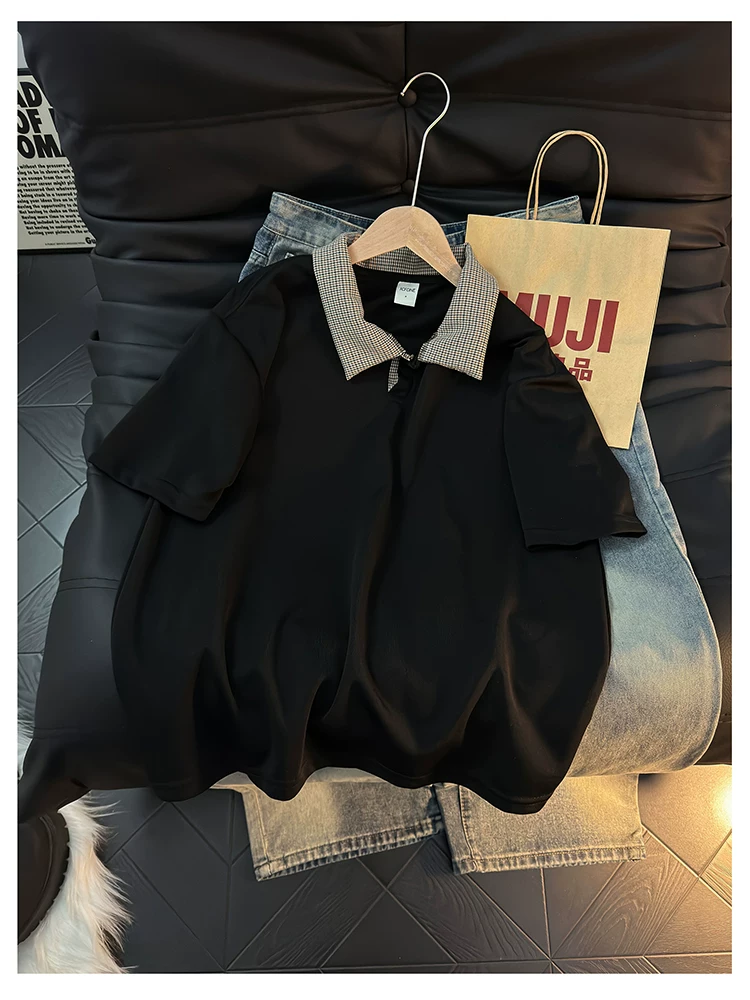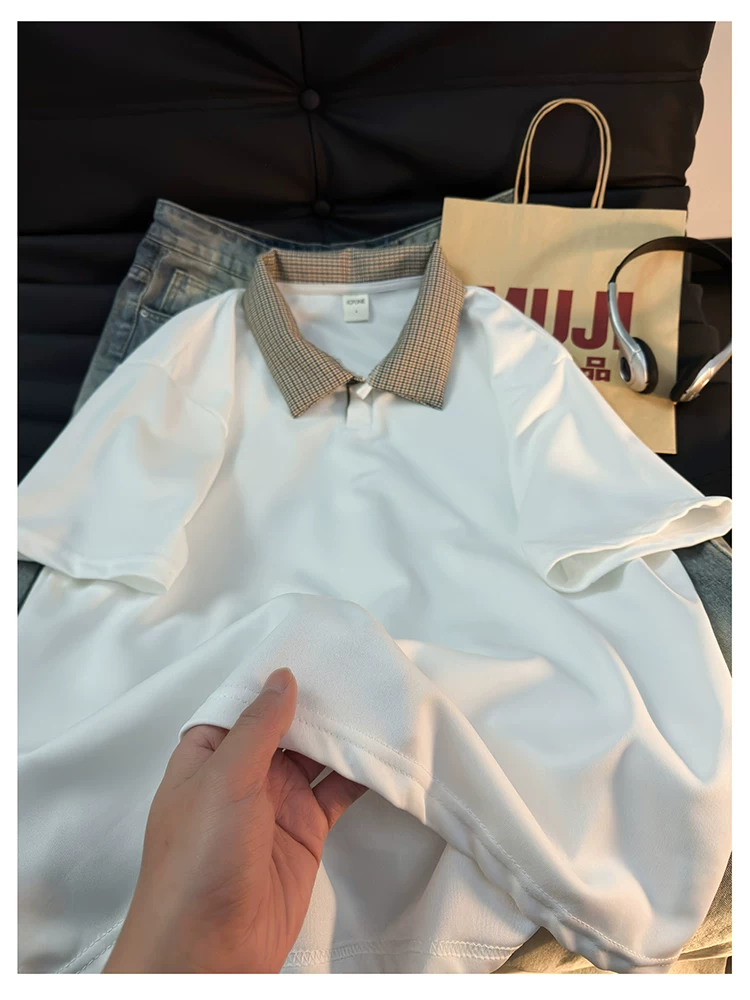 Áo sơ mi Polo tay ngắn kiểu Mỹ dành cho nam, áo thun dáng rộng hợp thời trang mùa hè, áo thun thiết kế chắp vá kẻ sọc