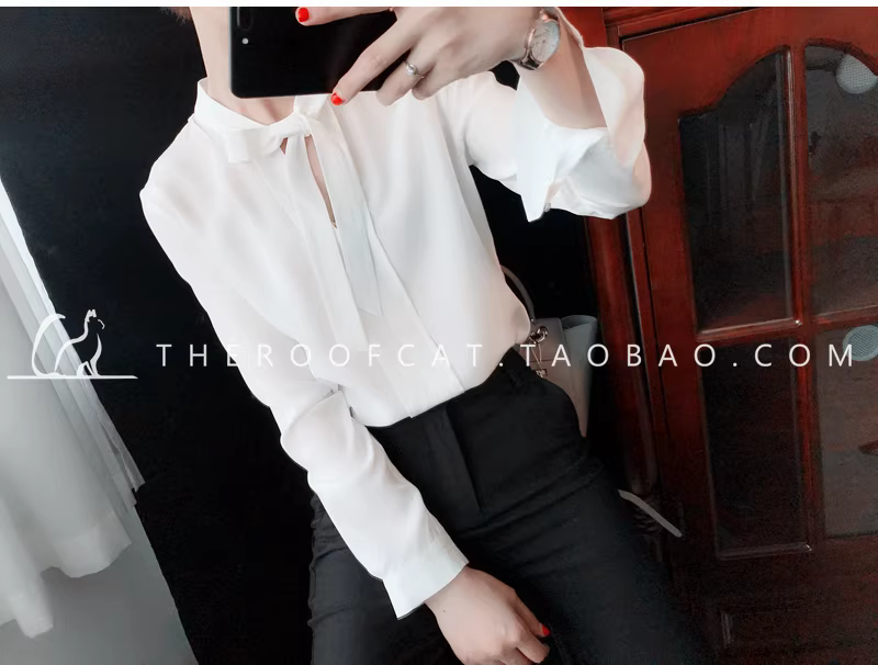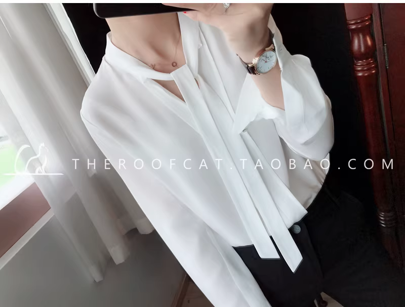 - Áo sơ mi ruy băng lụa cho nữ có nơ, tay dài, cà vạt lụa dâu tằm, cỡ lớn, màu trắng