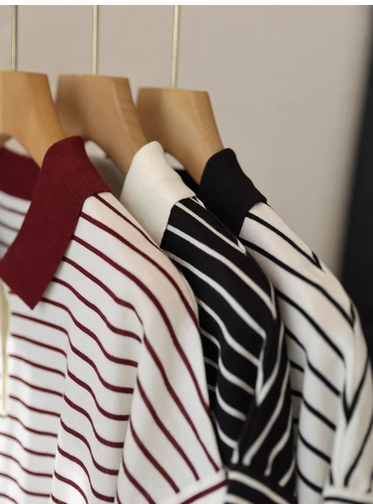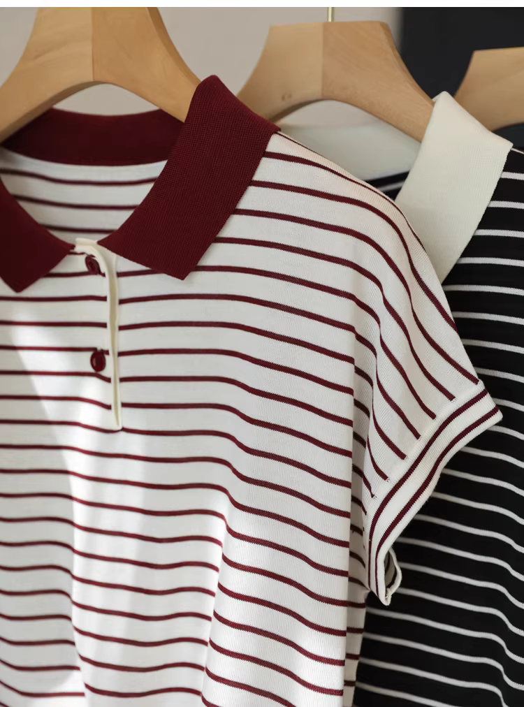 Áo sơ mi sọc cổ điển kiểu Pháp 100% Lyocell cổ Polo, vai rộng, dáng ôm, chất liệu dệt kim, tay ngắn dành cho nữ, mẫu mới mùa hè