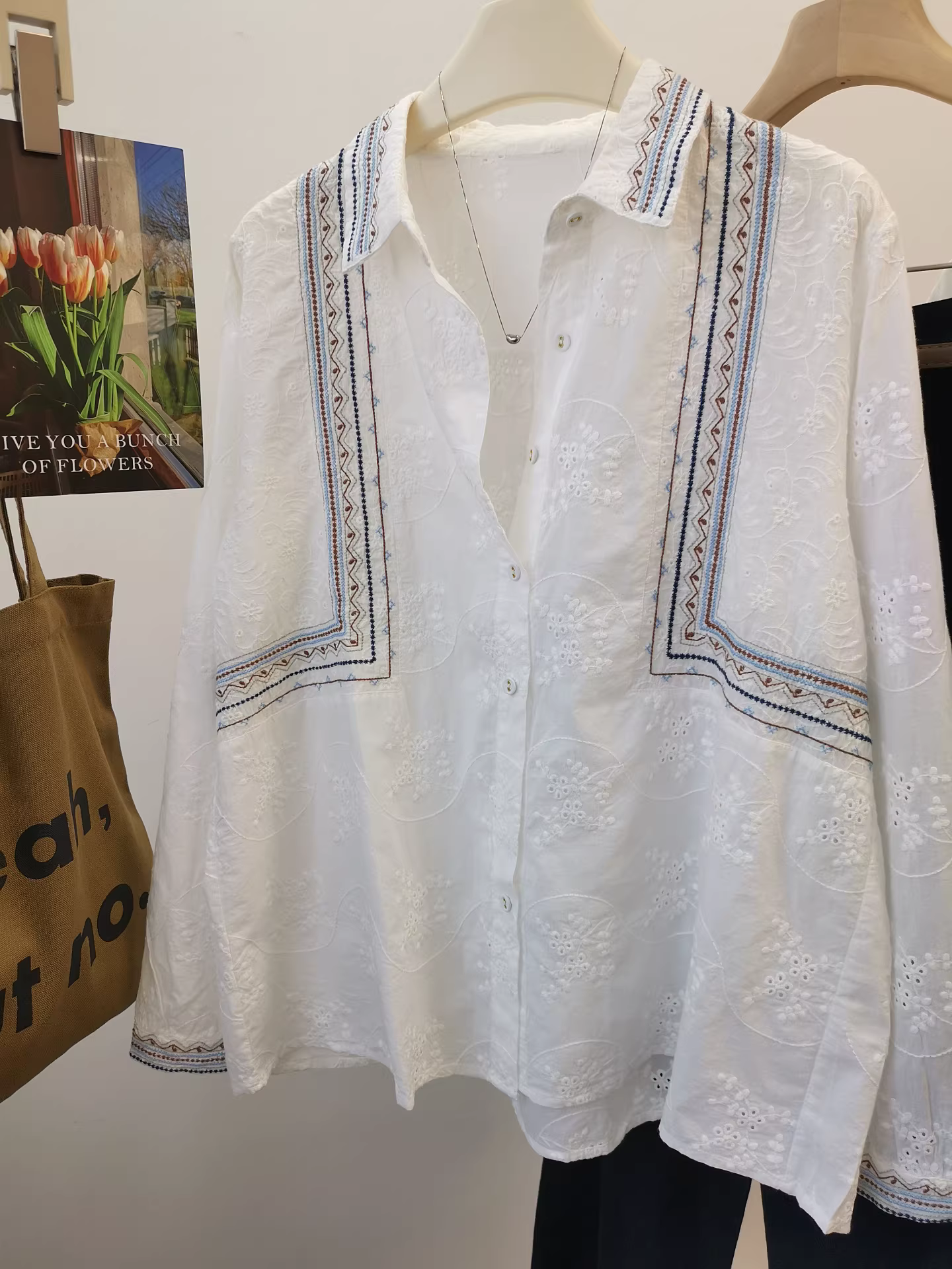 Áo sơ mi thêu toàn thân tinh tế, phong cách thiết kế độc đáo, áo sơ mi cotton nguyên chất đa năng phong cách văn học Pháp dành cho nữ.