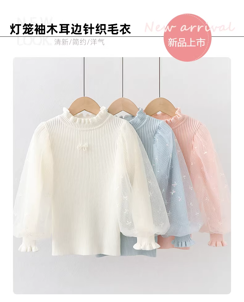 - Áo sơ mi trắng cho bé gái mùa thu đông, áo len cổ lọ nửa cao cho trẻ em có tay phồng và lớp lót lông cừu, áo dệt kim cho bé gái.