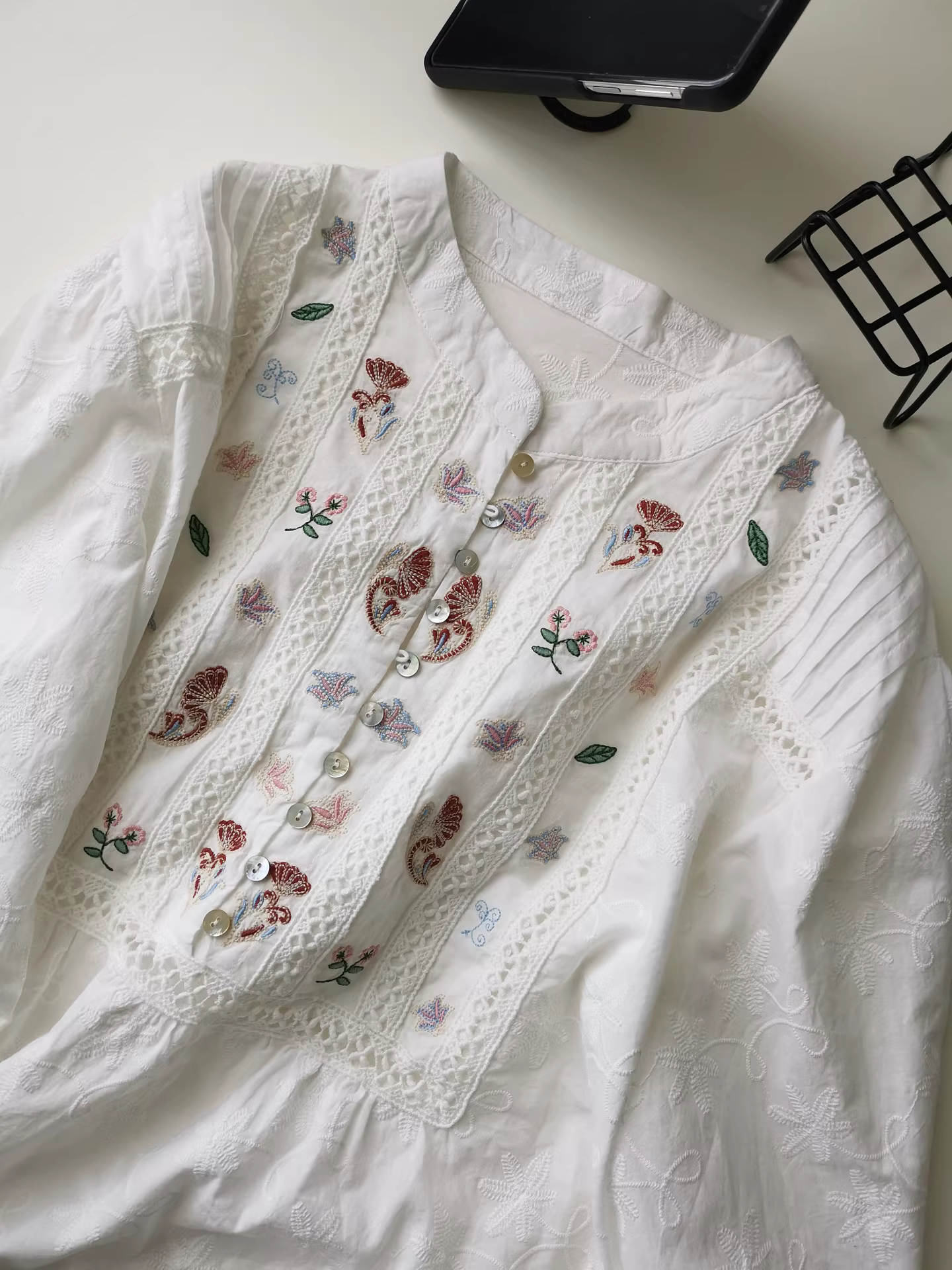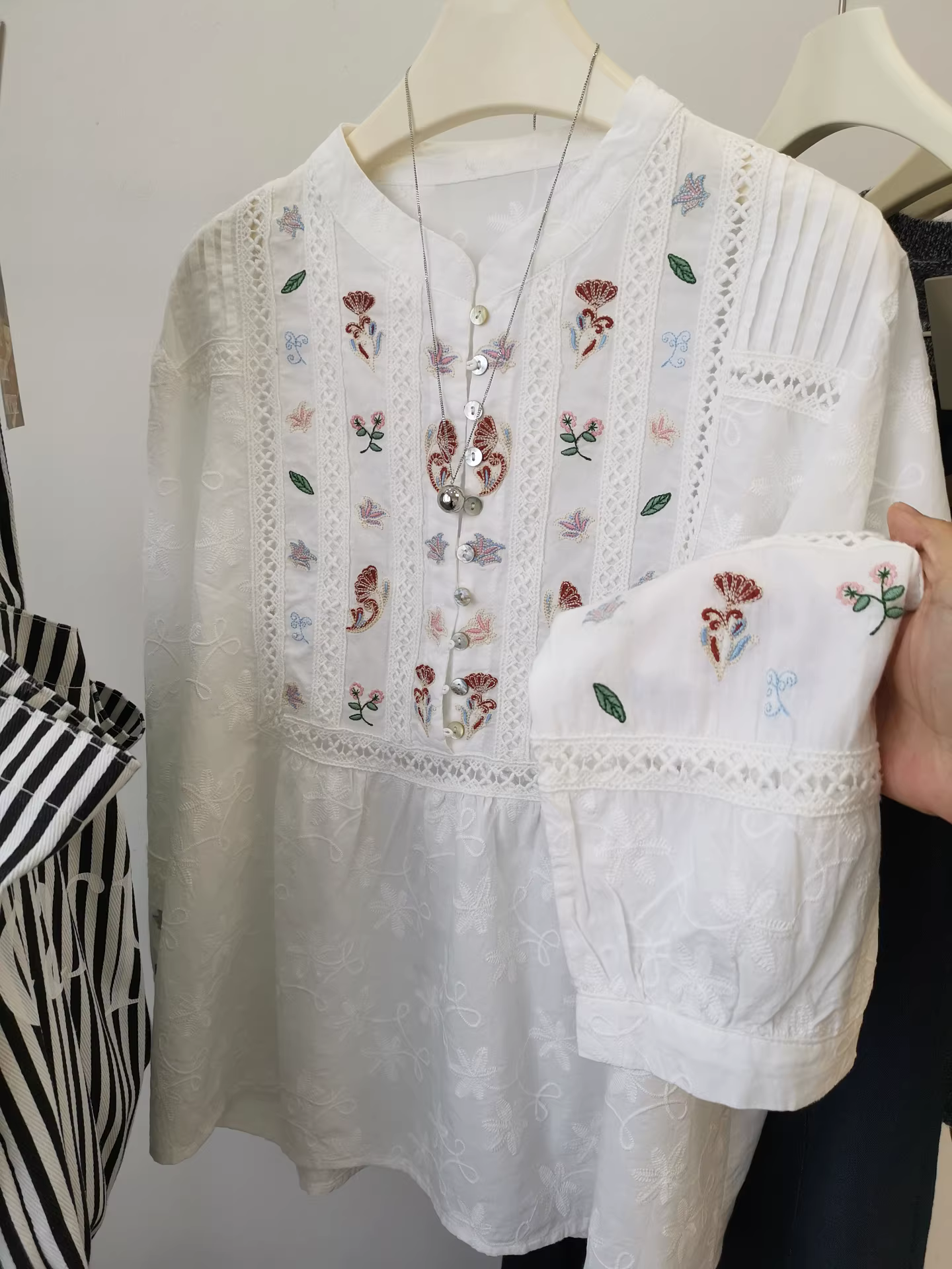 Áo sơ mi trắng thêu hoa tinh tế, thiết kế độc đáo, áo kiểu Pháp đa năng, dáng rộng, phong cách nghệ thuật dành cho nữ
