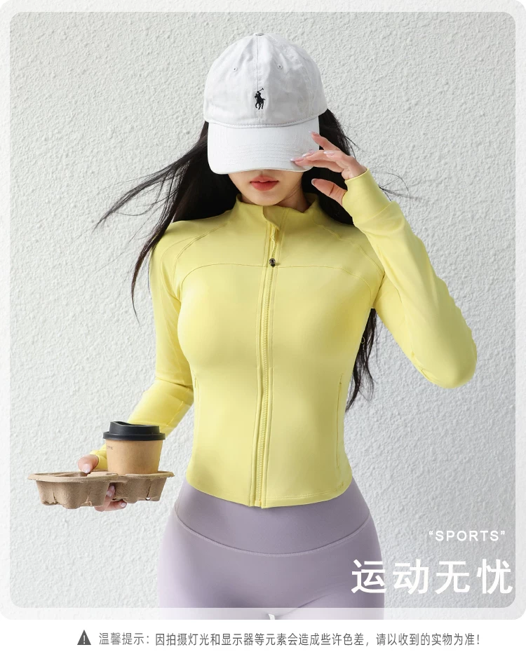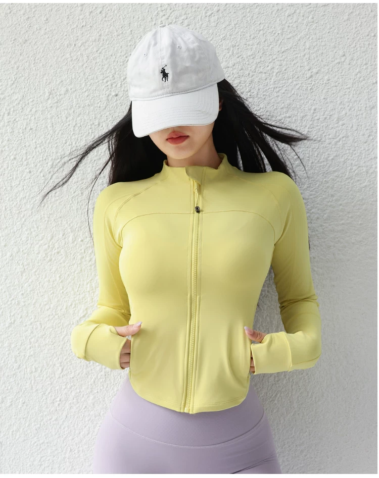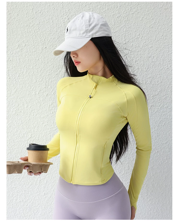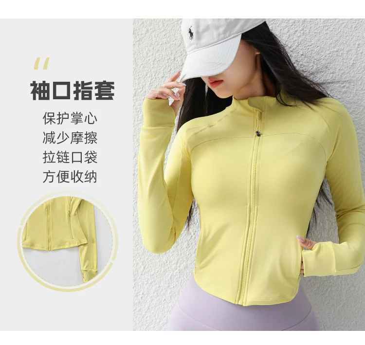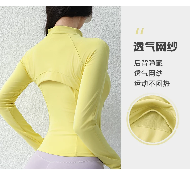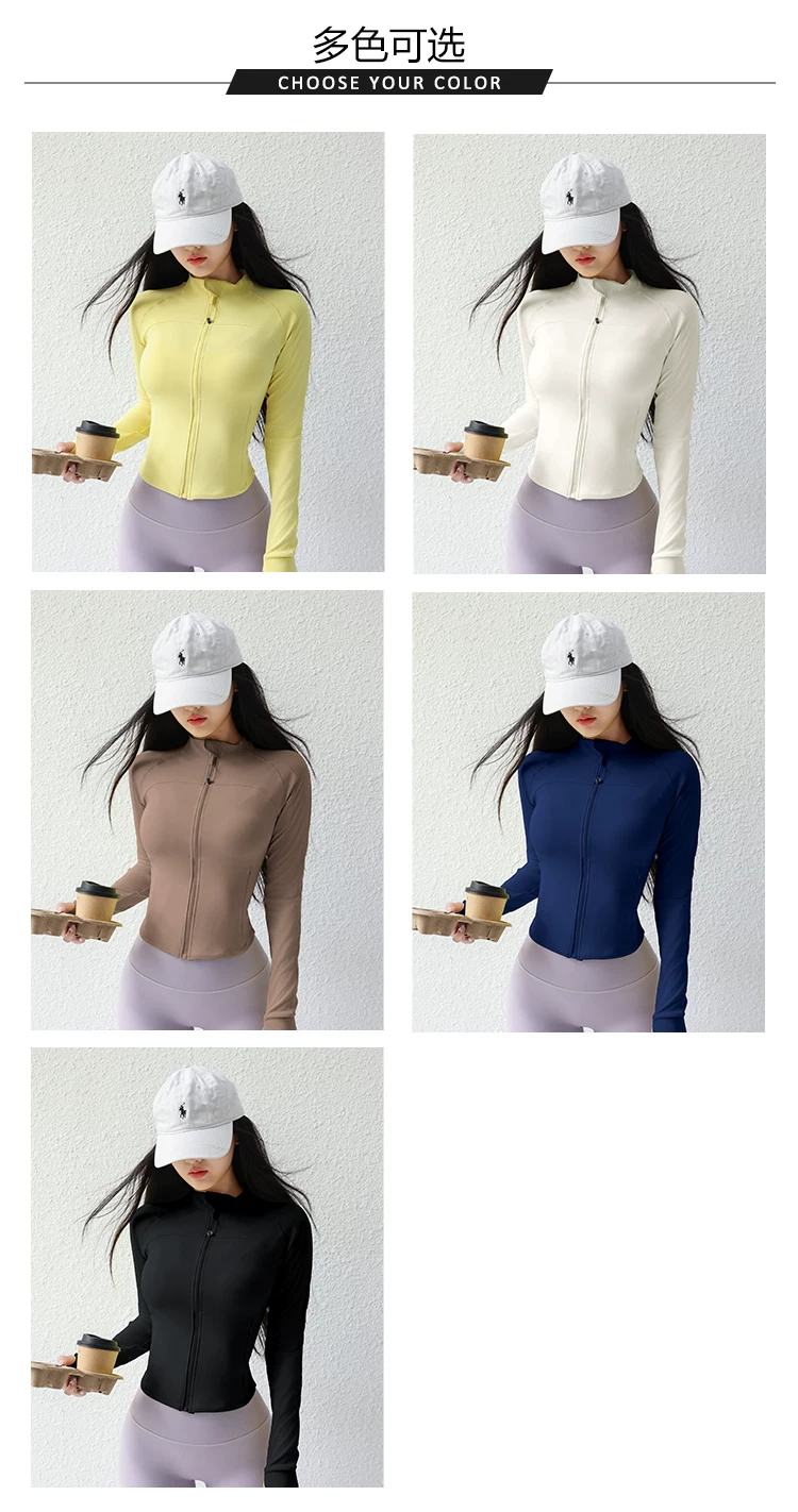 - Áo tập yoga cao cấp mẫu mới 2026 dành cho nữ, áo thể thao tay dài ôm sát, áo khoác tập gym cổ đứng có khóa kéo.