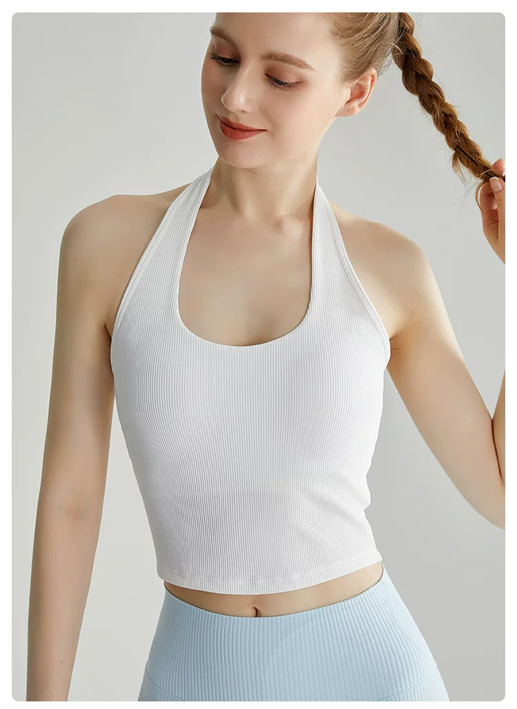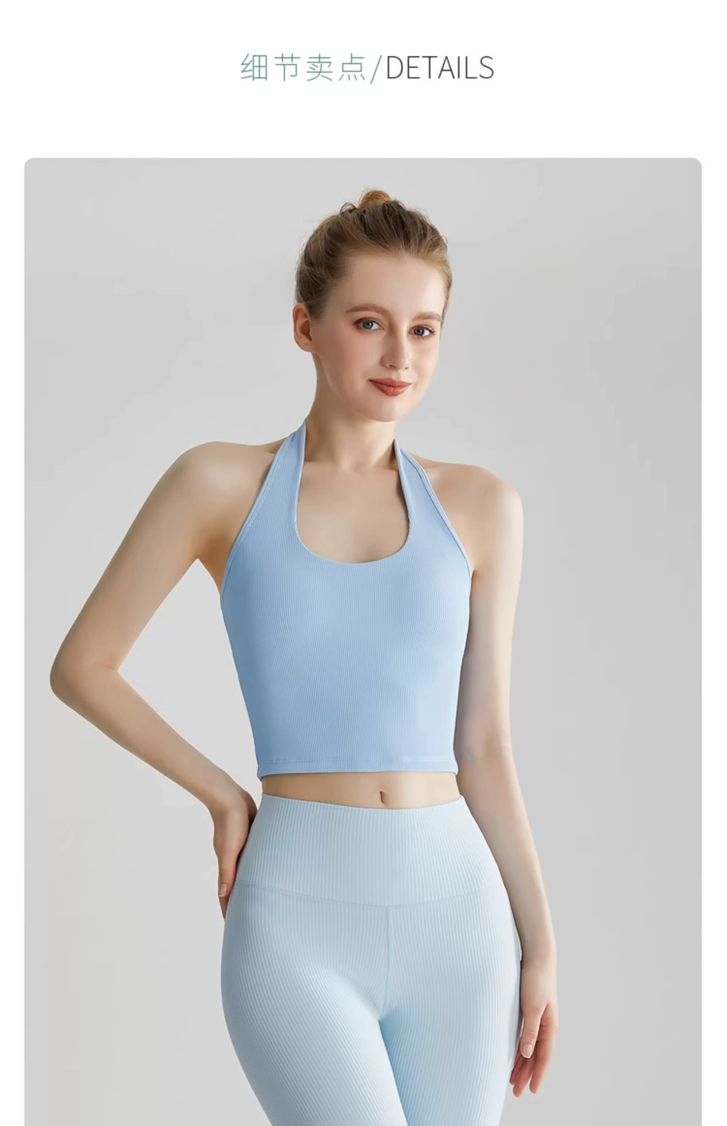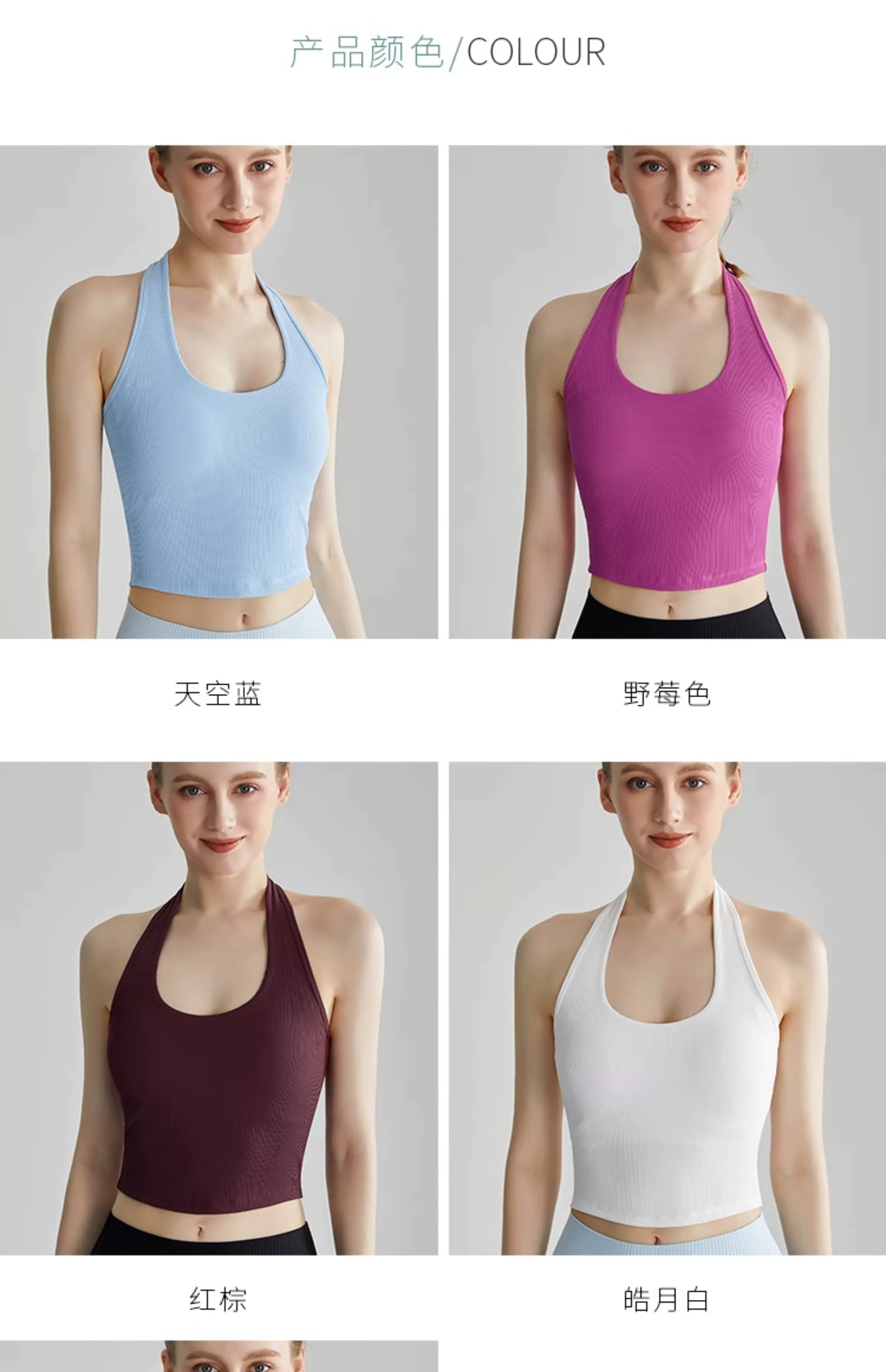 Áo tập yoga cổ halter đa năng có đệm ngực, kiểu dáng dài, chống sốc cường độ trung bình, có gân, kháng khuẩn, áo ngực thể thao dành cho nữ.