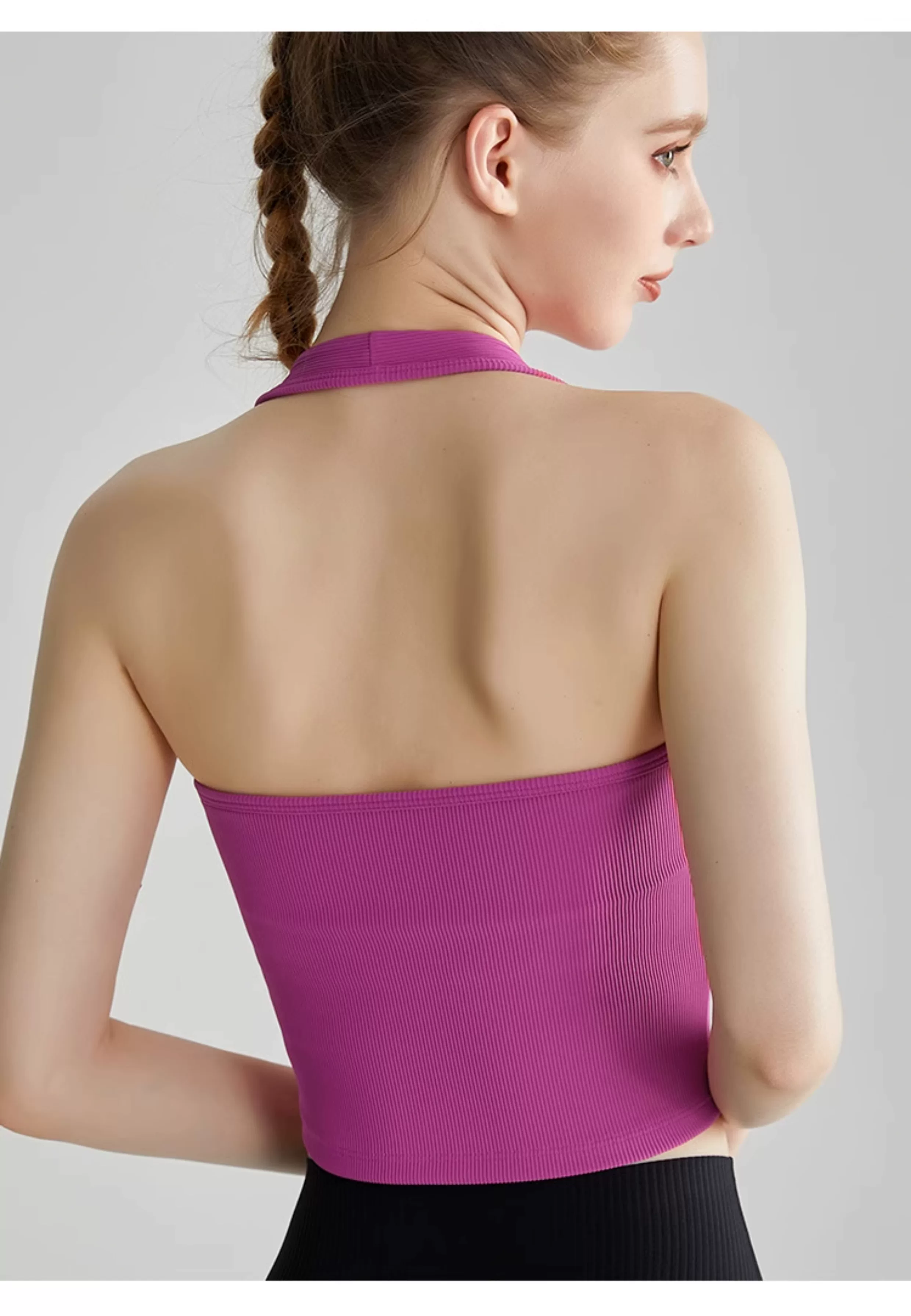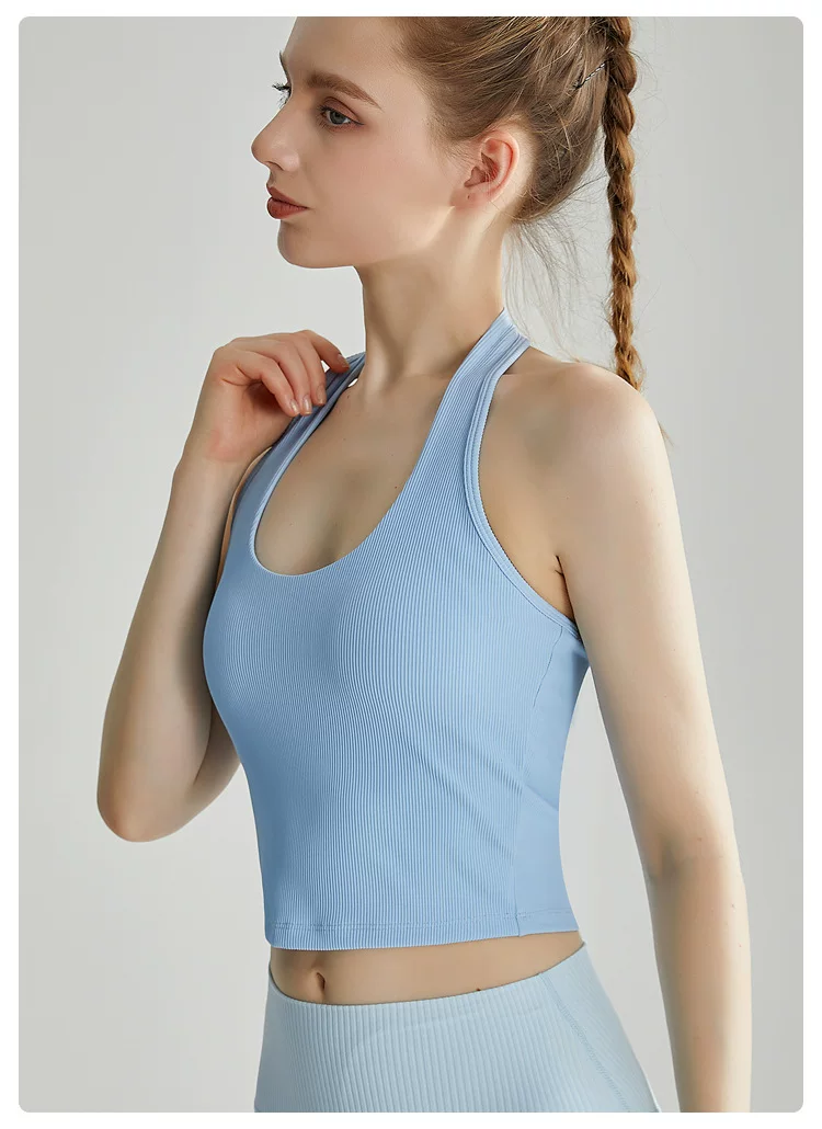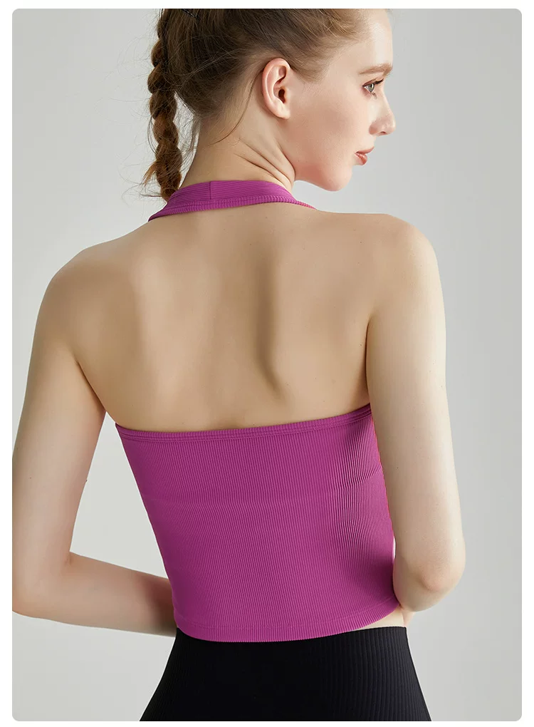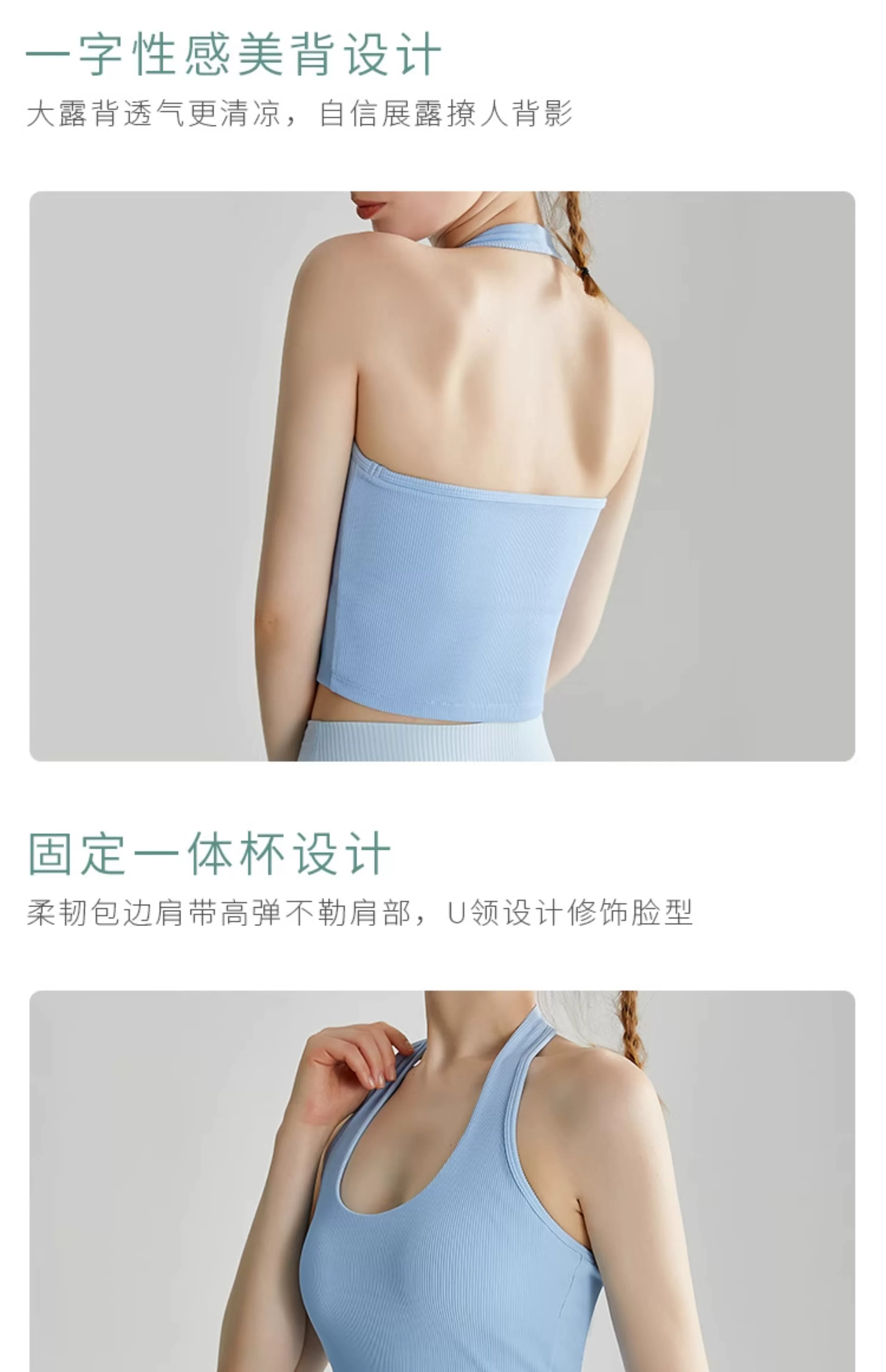 Áo tập yoga cổ halter đa năng có đệm ngực, kiểu dáng dài, chống sốc cường độ trung bình, có gân, kháng khuẩn, áo ngực thể thao dành cho nữ.