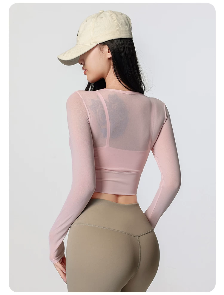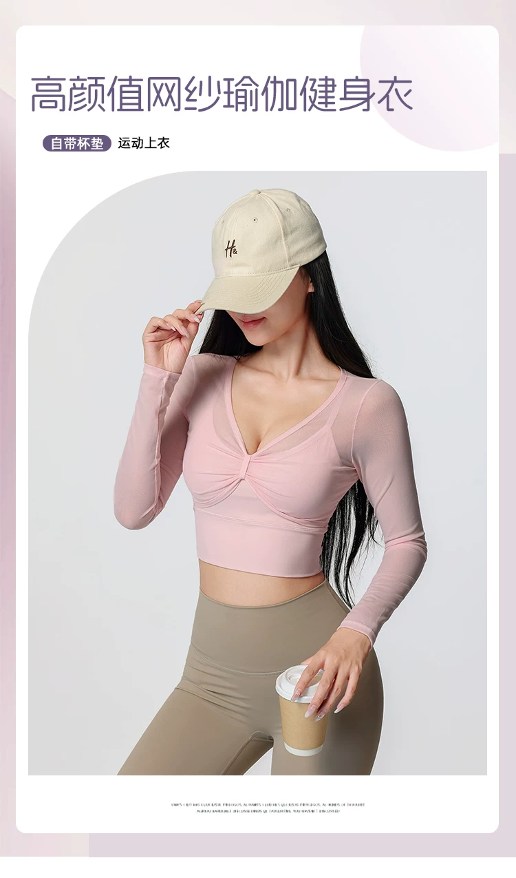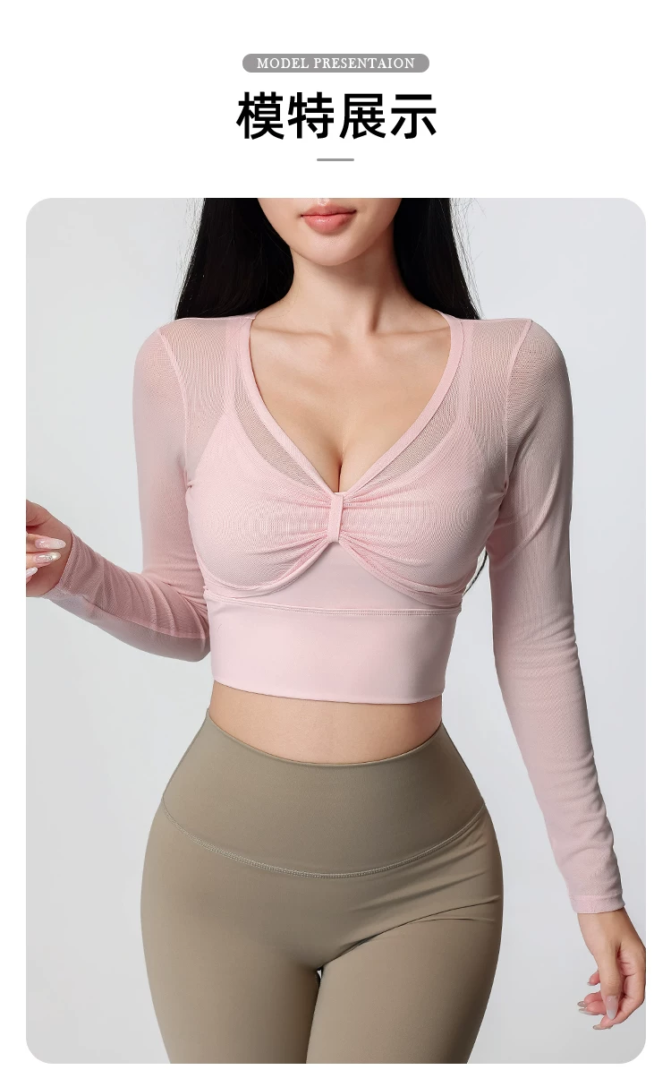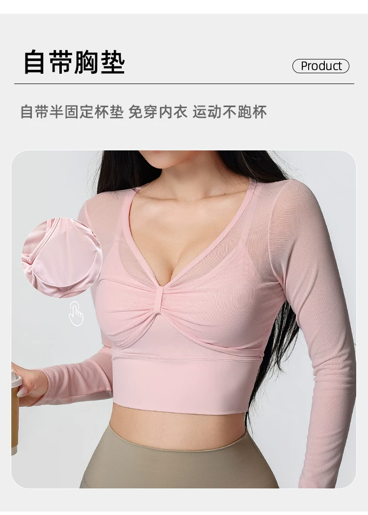Áo tập yoga nữ 2026 mới xuân hè, tay dài, lưới, thể thao, ôm dáng, có mút ngực, dành cho tập Pilates