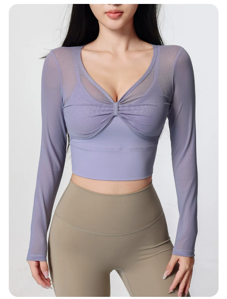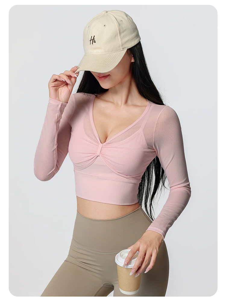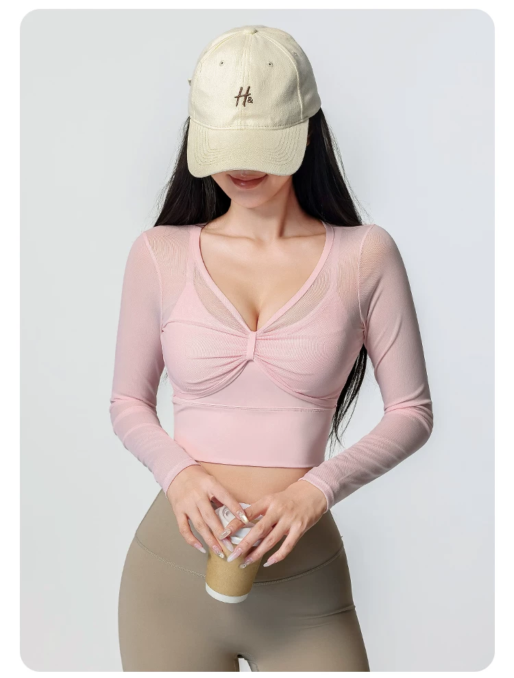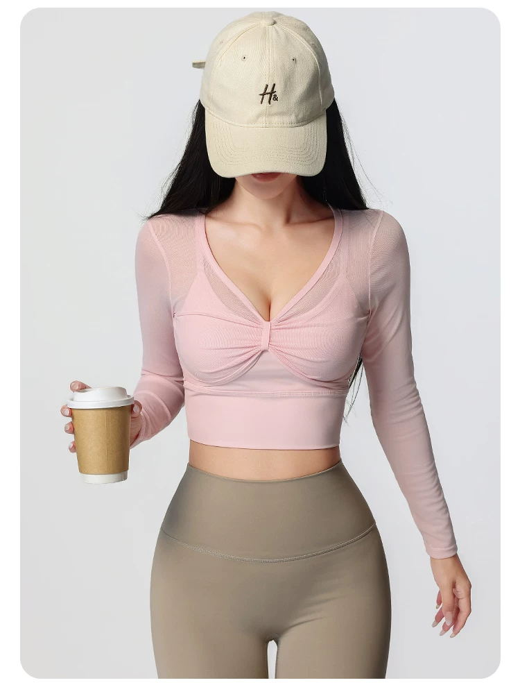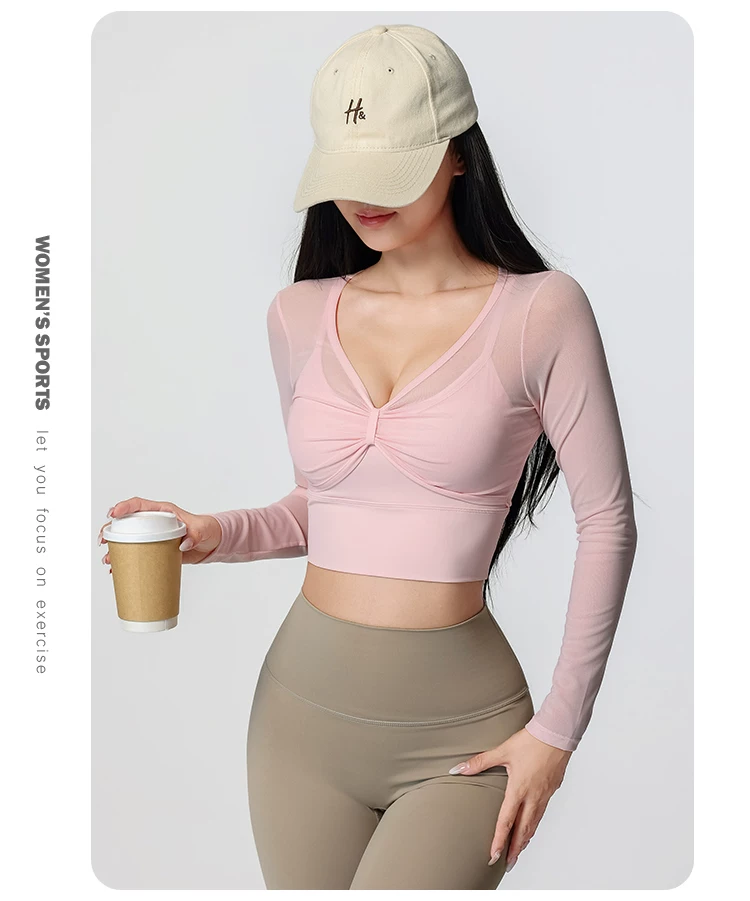 Áo tập yoga nữ 2026 mới xuân hè, tay dài, lưới, thể thao, ôm dáng, có mút ngực, dành cho tập Pilates