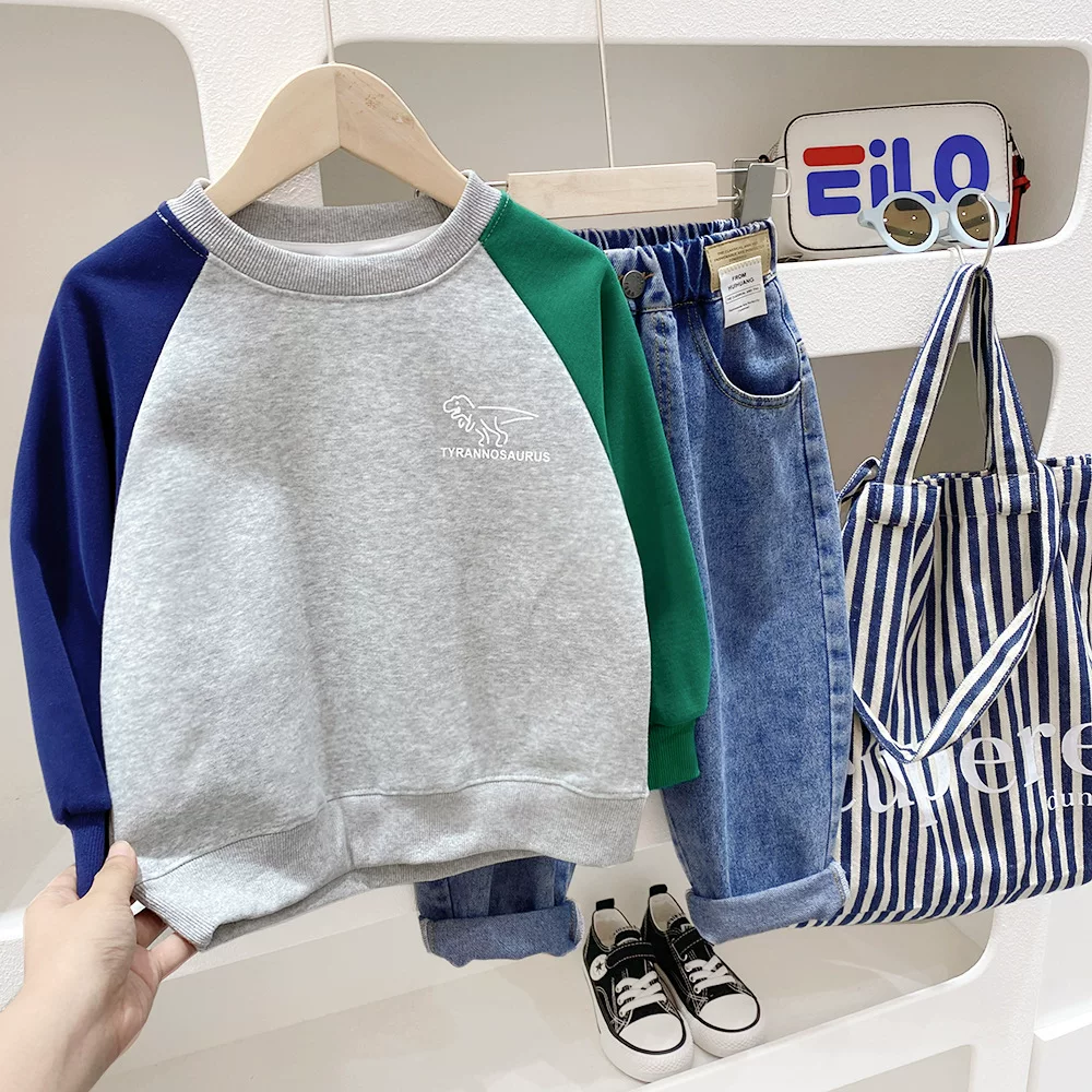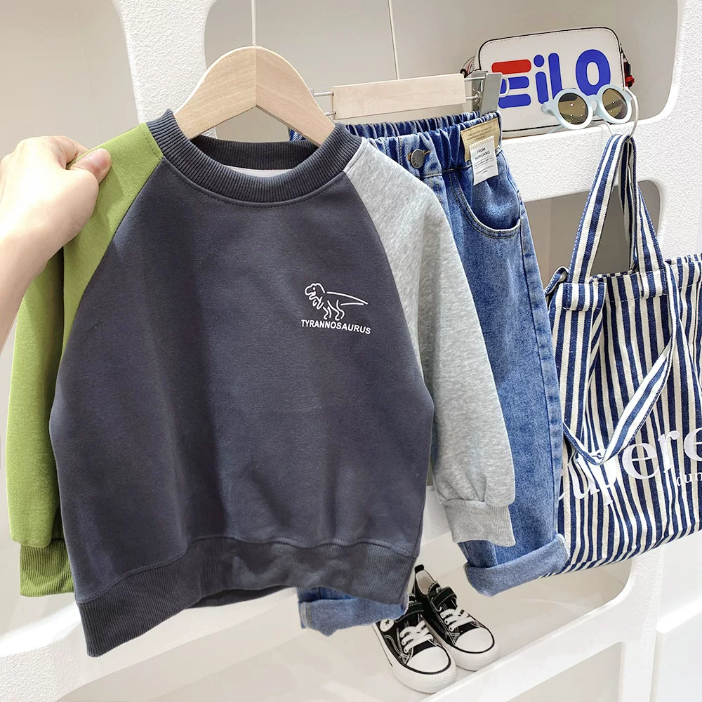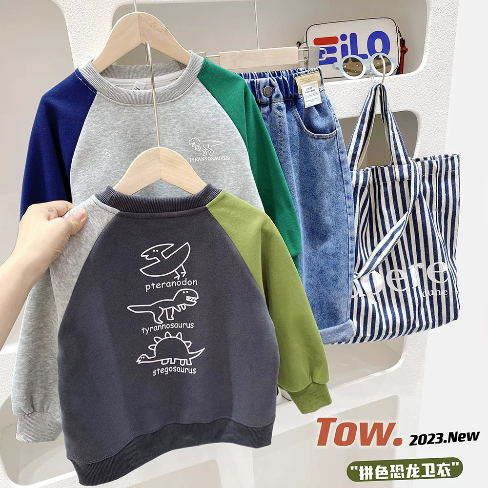 - Áo thun bé trai 2025 mẫu xuân mới áo dài tay in hình khủng long áo thun bé trai size trung và lớn áo thun cổ tròn