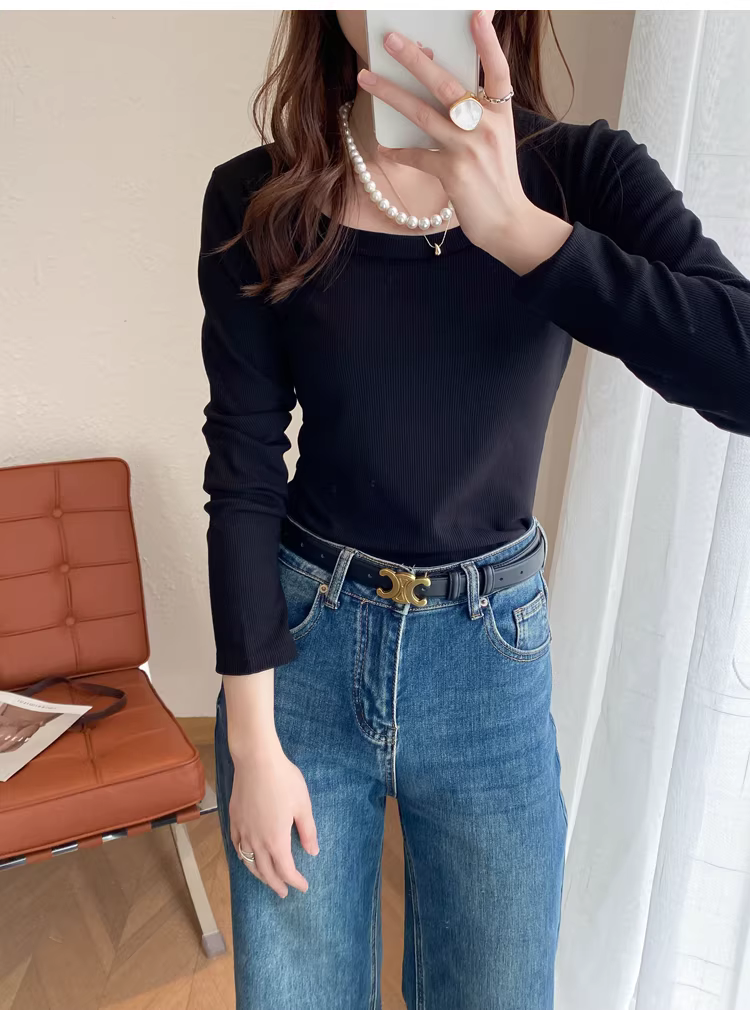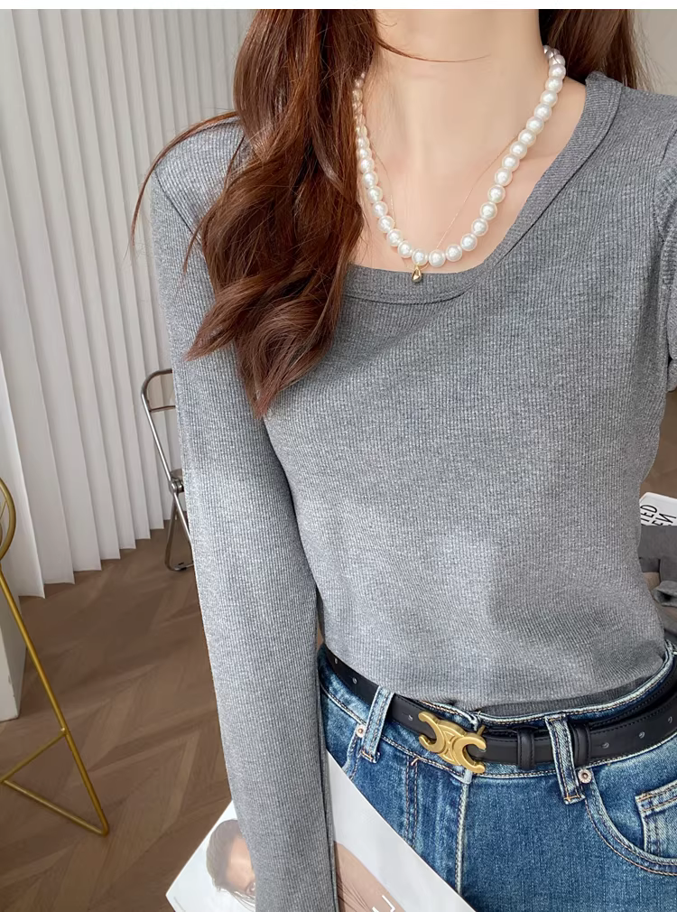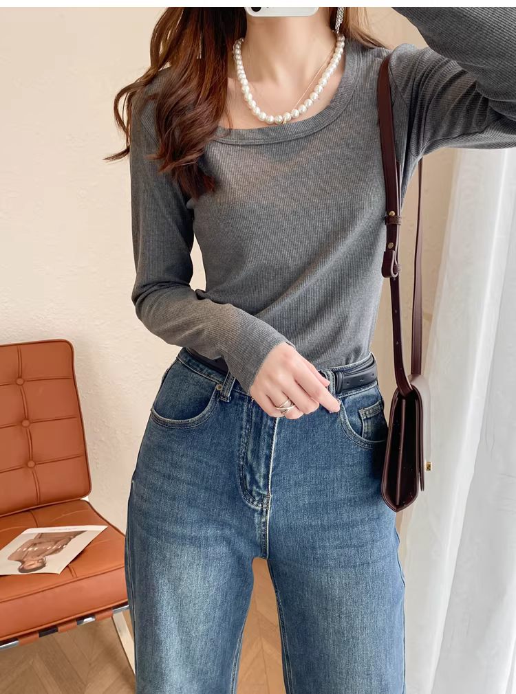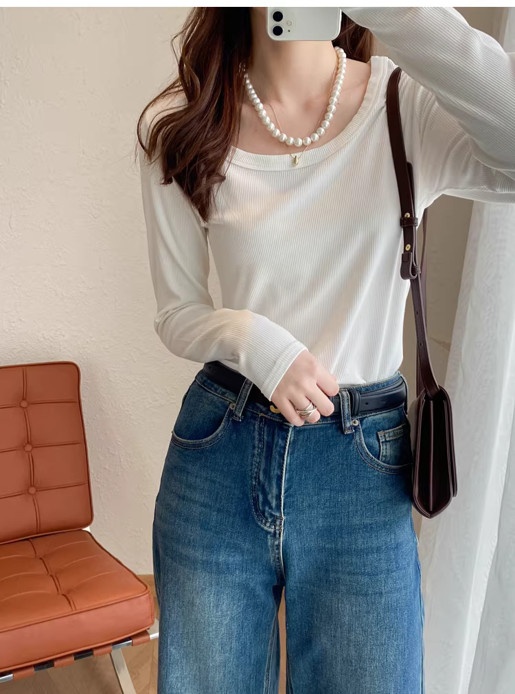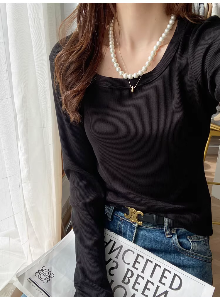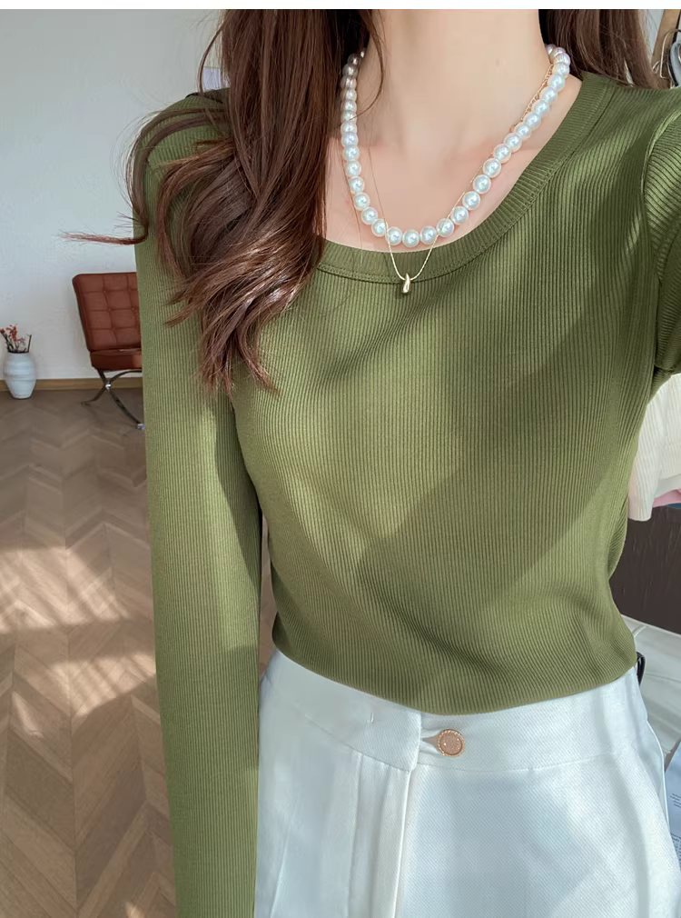 大U领螺纹长袖T恤