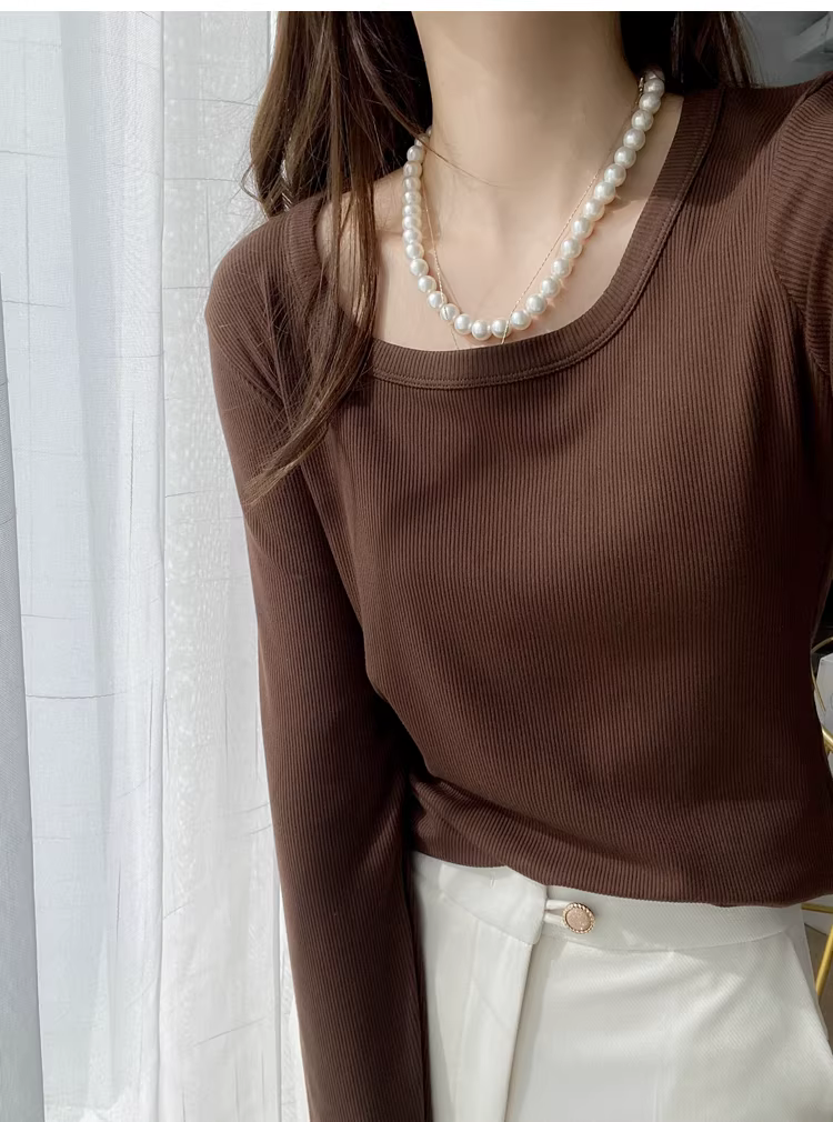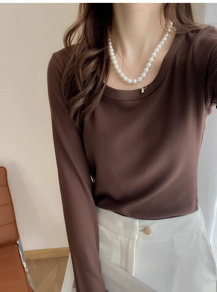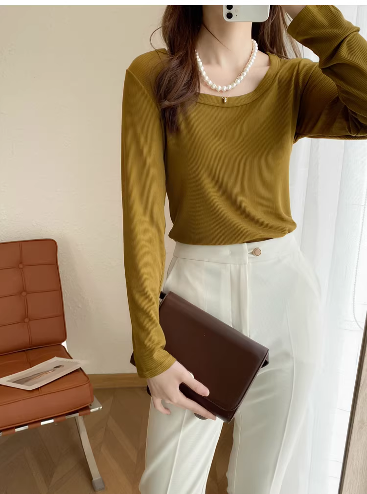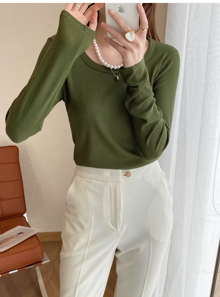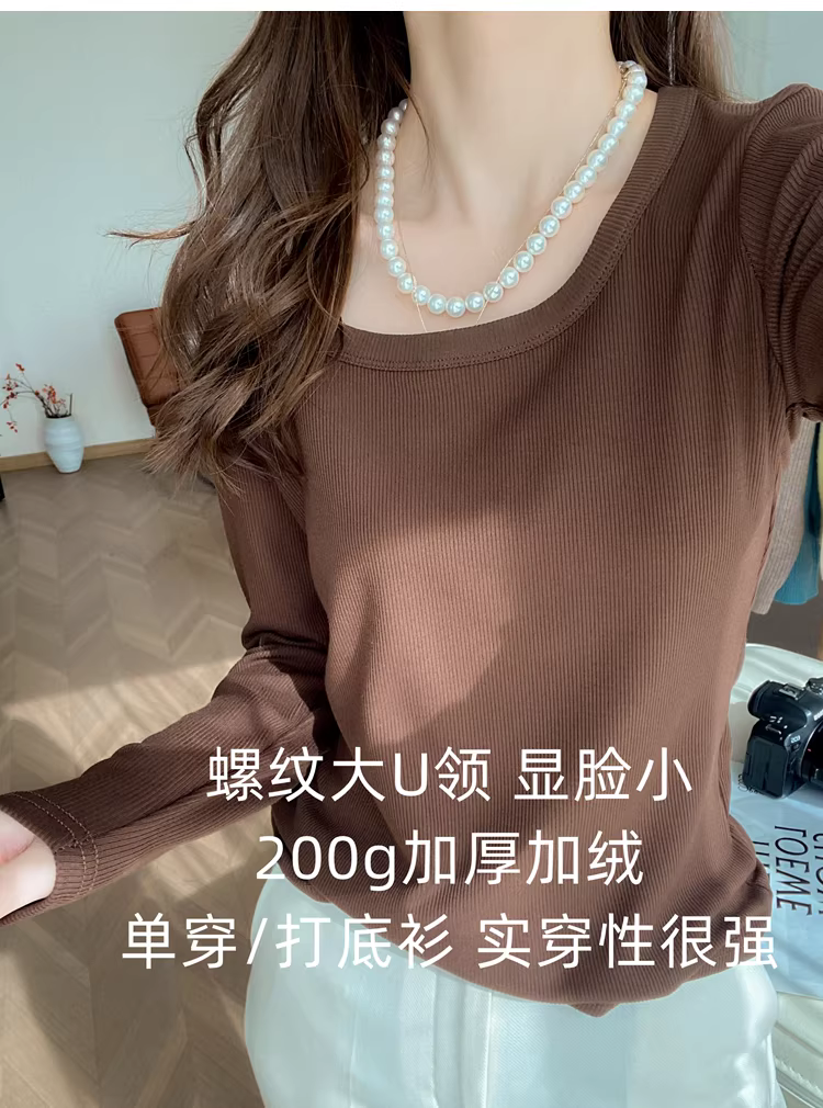 - Áo thun dài tay cổ chữ U dày dặn 200g có ren dành cho nữ, áo sơ mi cơ bản đa năng màu trơn mới mùa thu đông