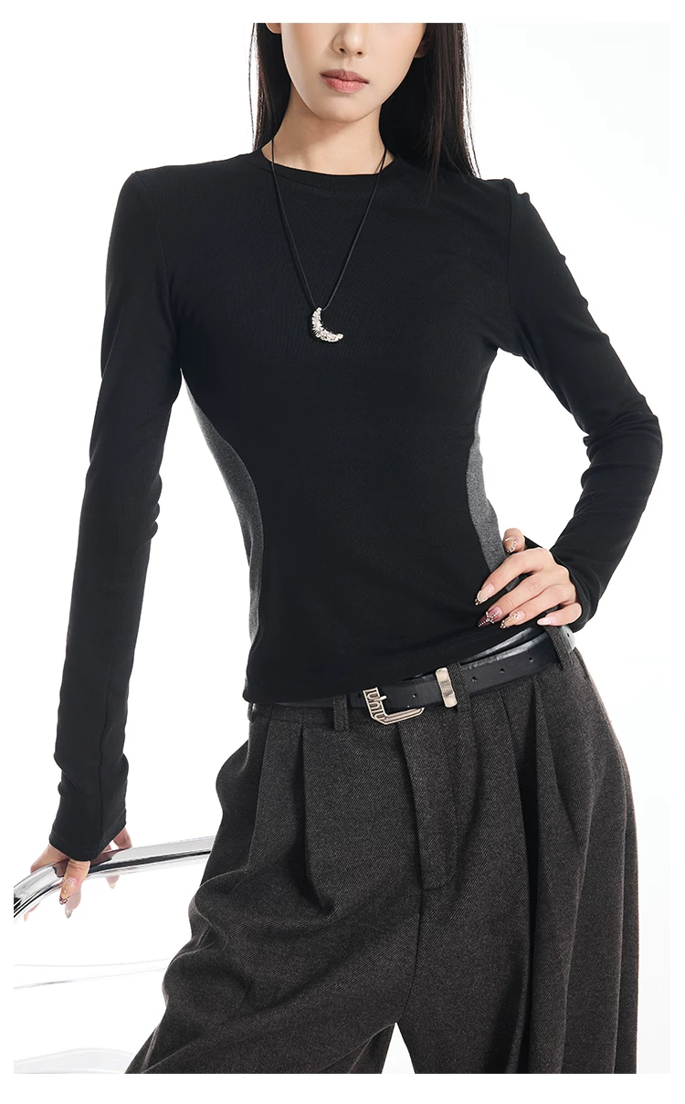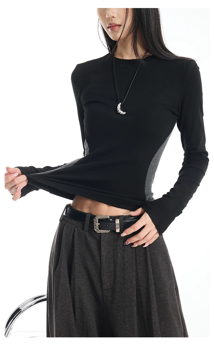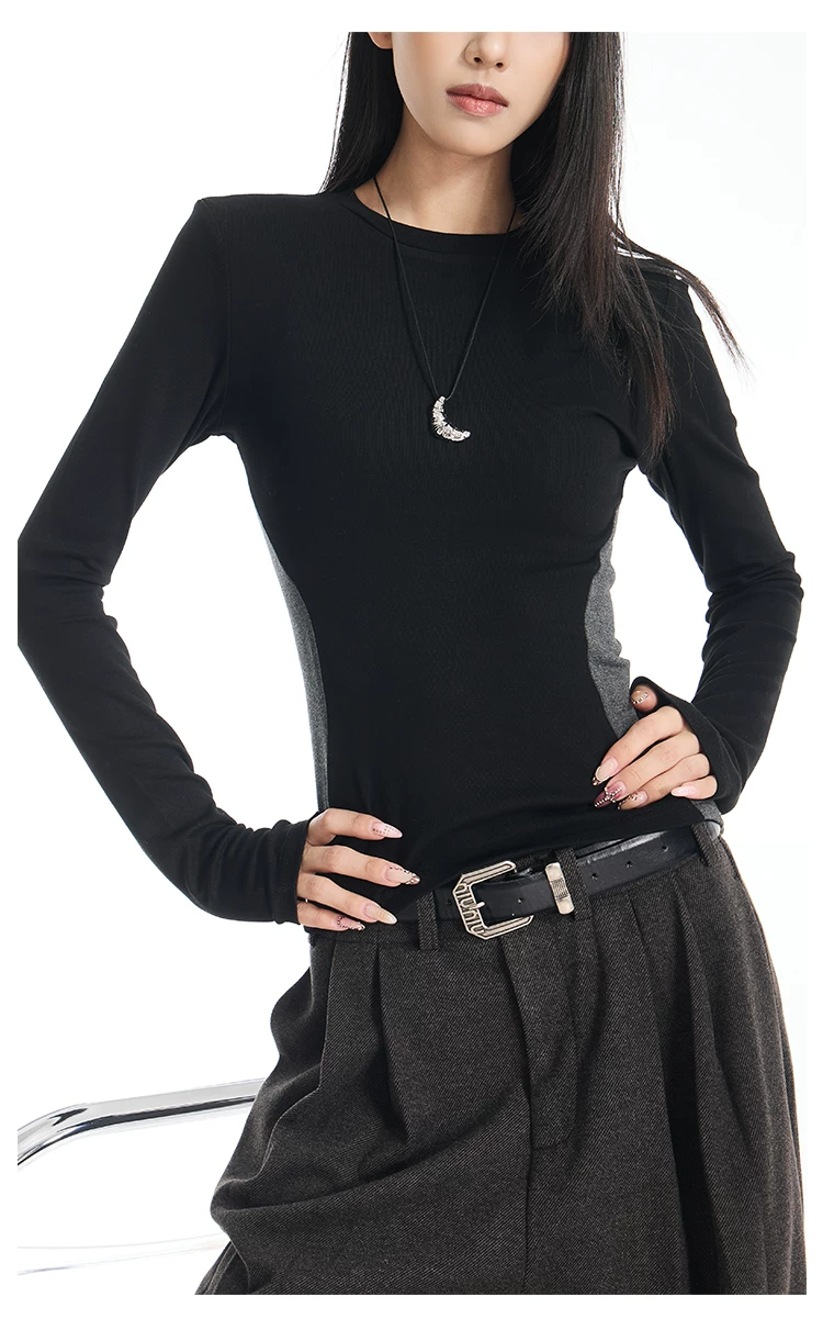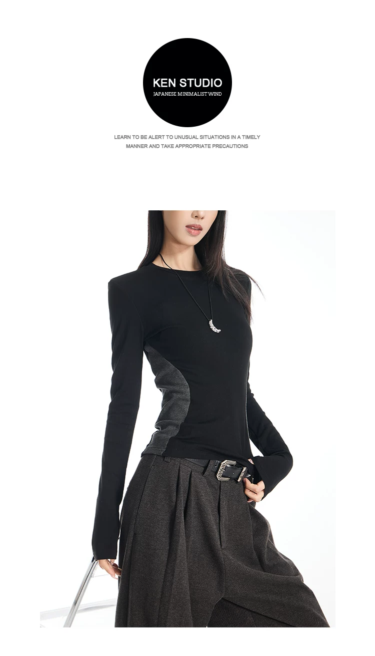 Áo thun dài tay cổ tròn màu sắc phối hợp gợi cảm của KEN STUDIO dành cho nữ, áo lớp trong có dây buộc eo chải kỹ mùa thu đông