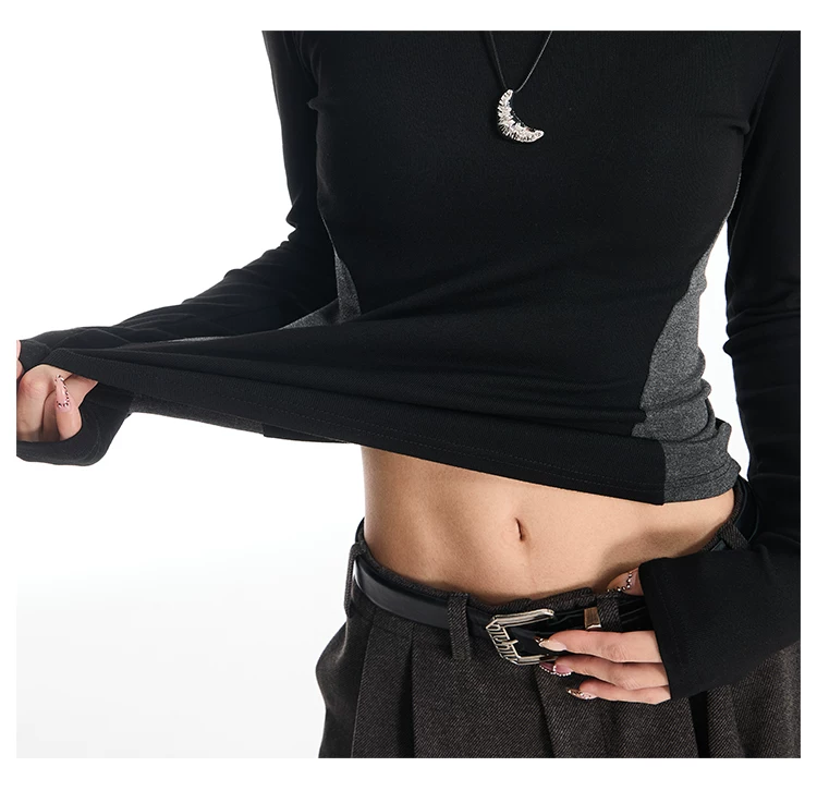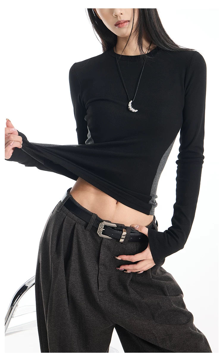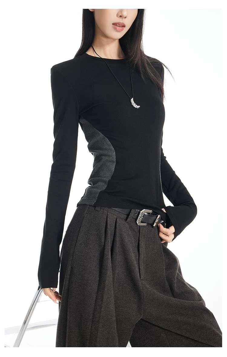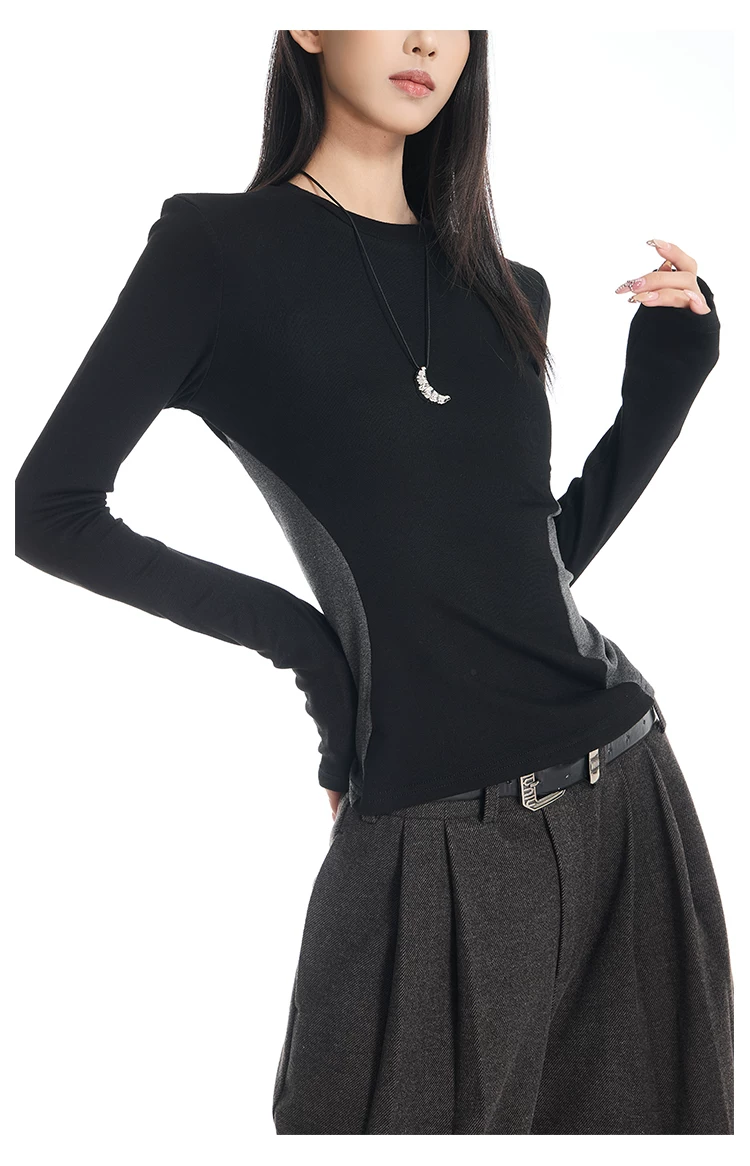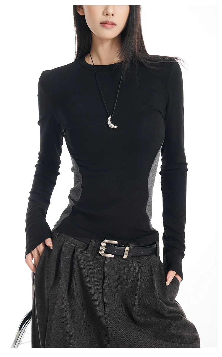 Áo thun dài tay cổ tròn màu sắc phối hợp gợi cảm của KEN STUDIO dành cho nữ, áo lớp trong có dây buộc eo chải kỹ mùa thu đông