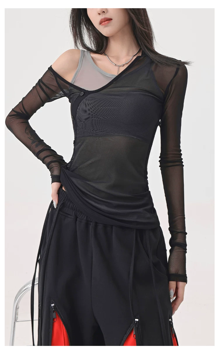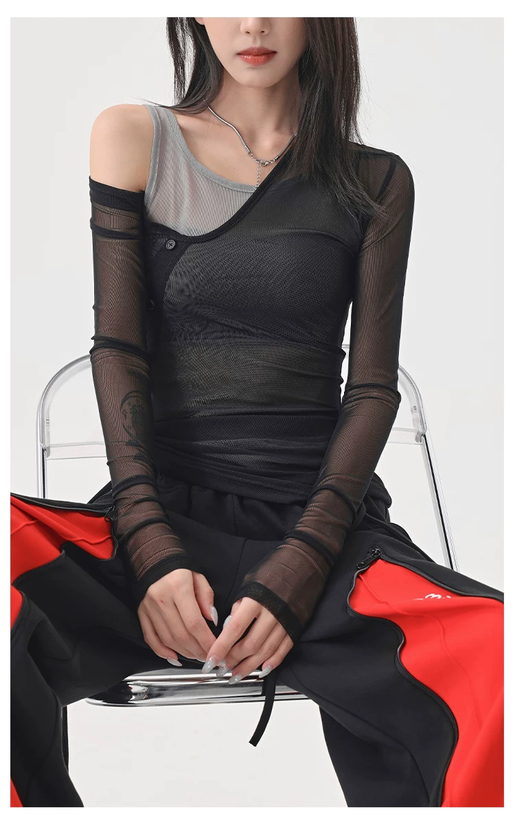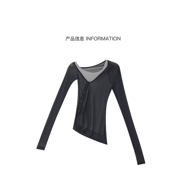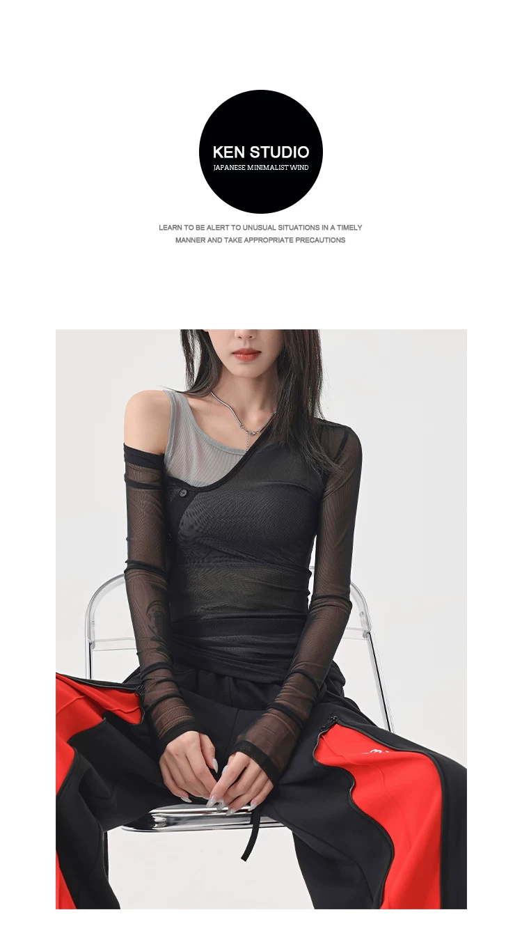 Áo thun dài tay dạng lưới giả hai mảnh màu đen của KEN STUDIO, áo che nắng vừa vặn vừa vặn