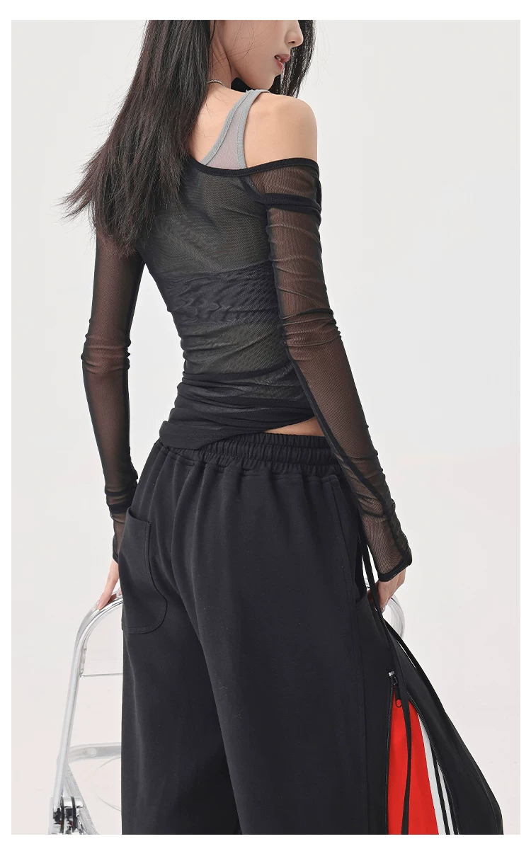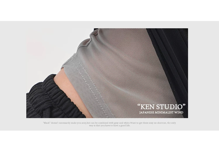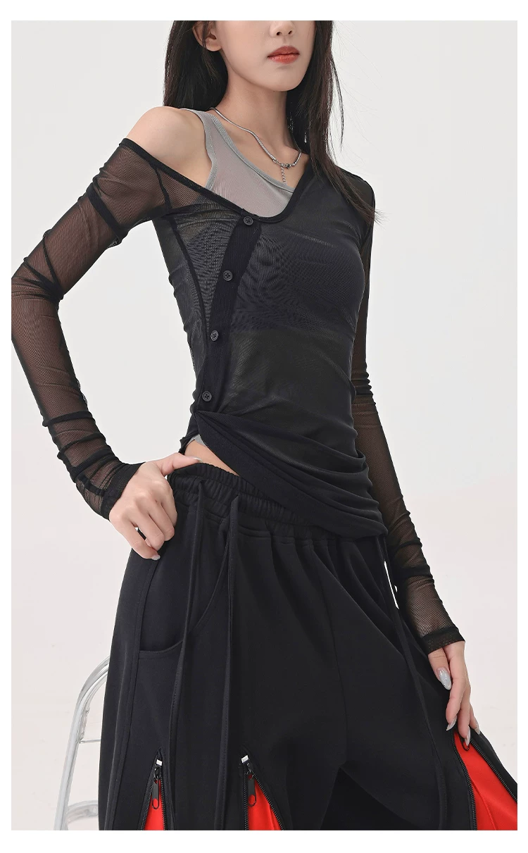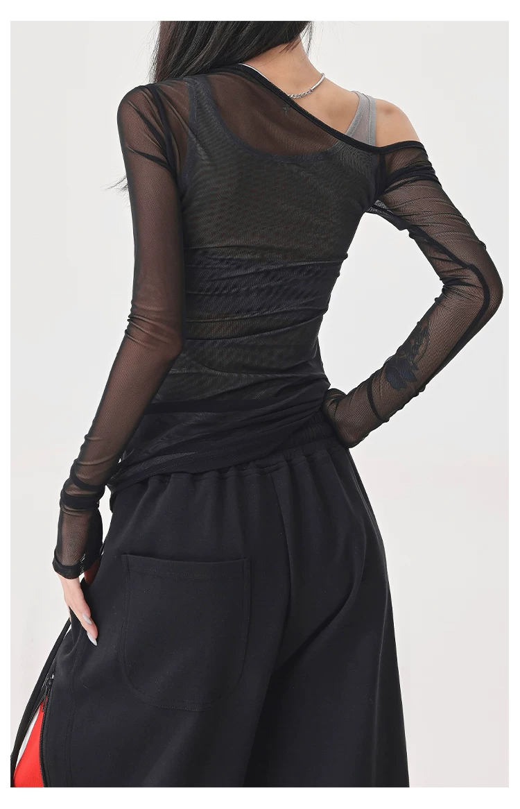 Áo thun dài tay dạng lưới giả hai mảnh màu đen của KEN STUDIO, áo che nắng vừa vặn vừa vặn
