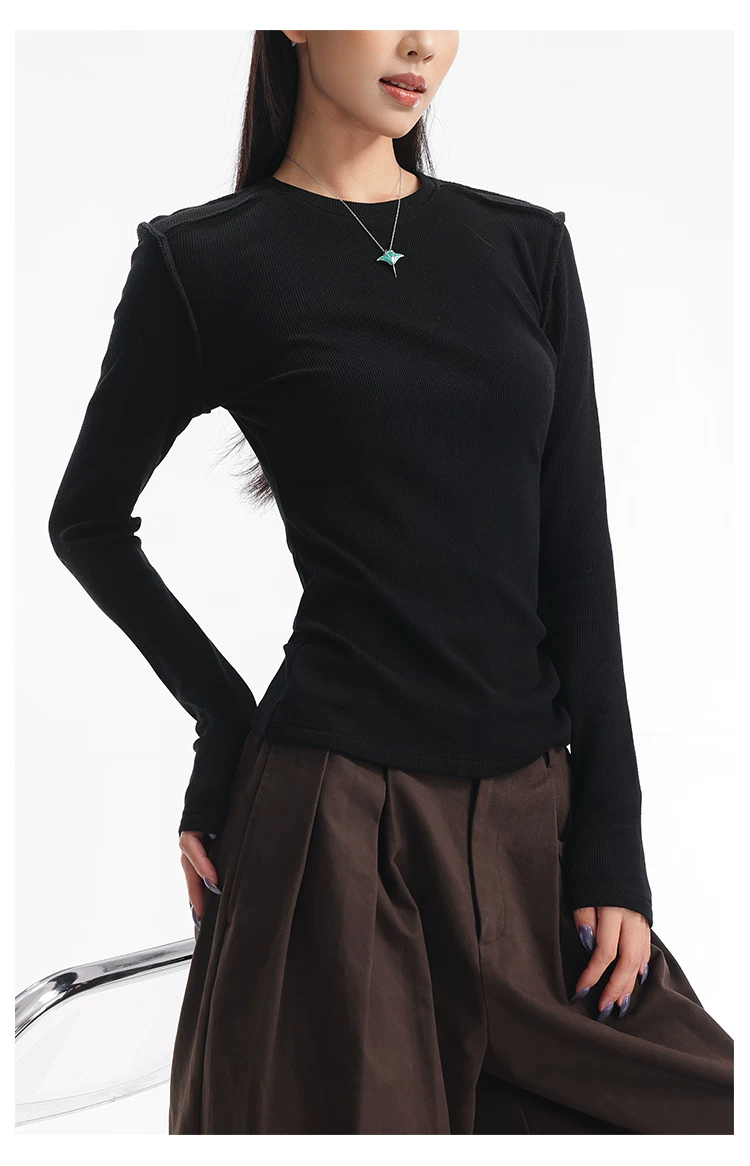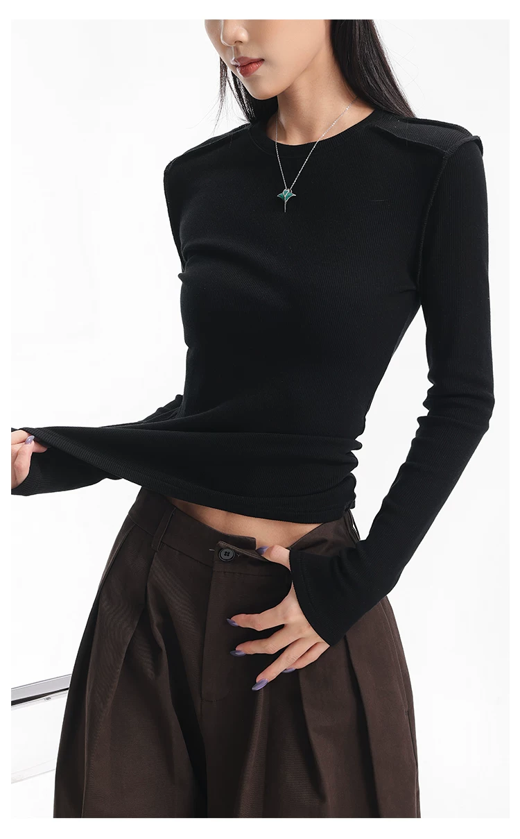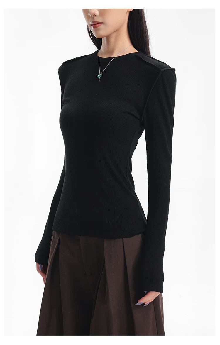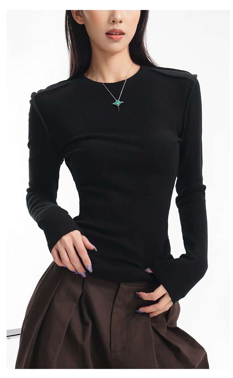Áo thun dài tay dệt kim màu đen thường ngày của KEN STUDIO mùa thu đông dành cho nữ, áo sơ mi cơ bản có họa tiết ôm vừa vặn