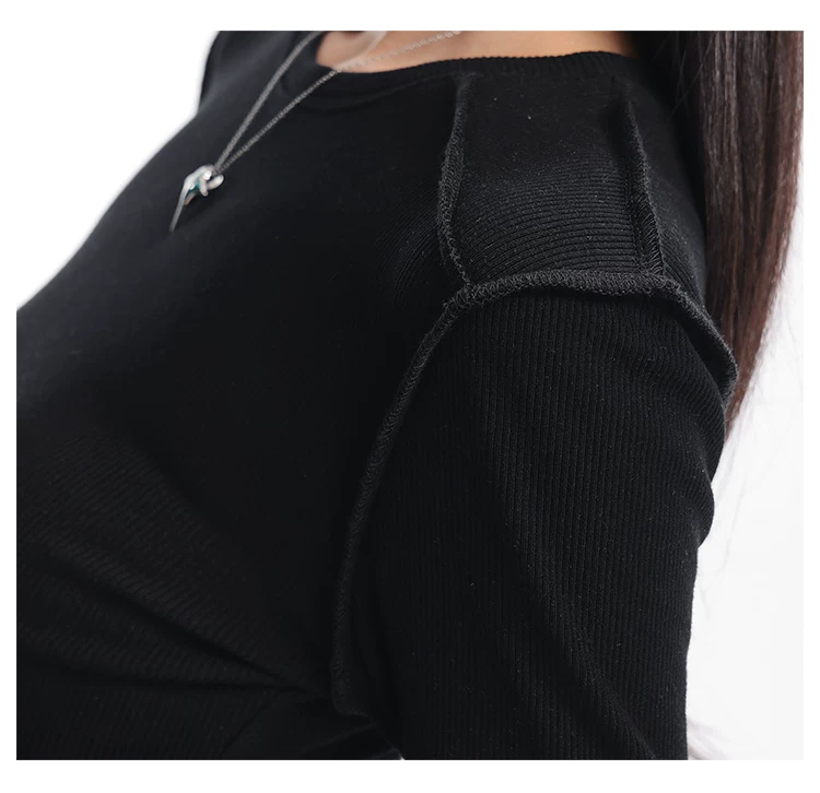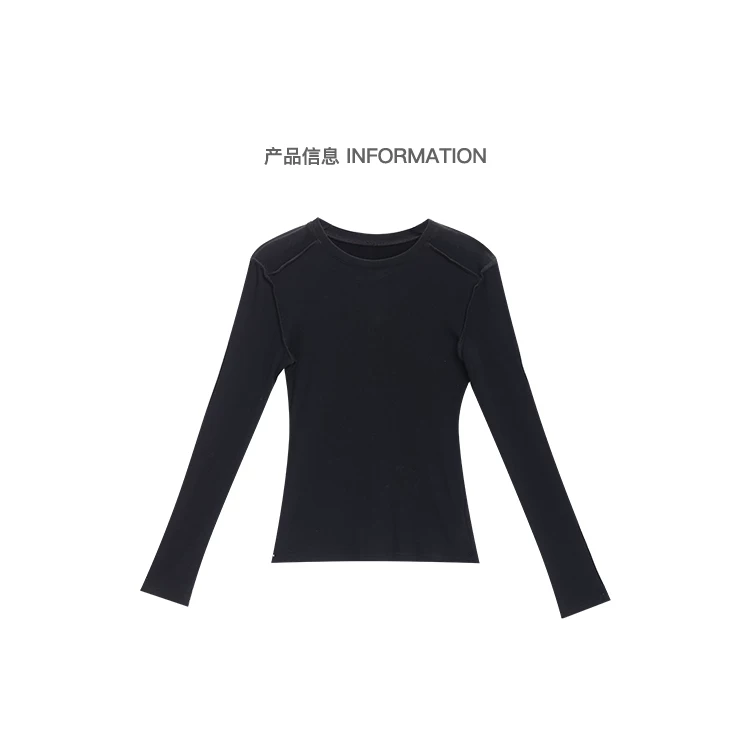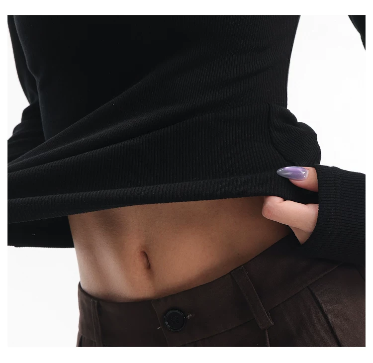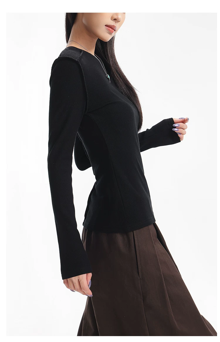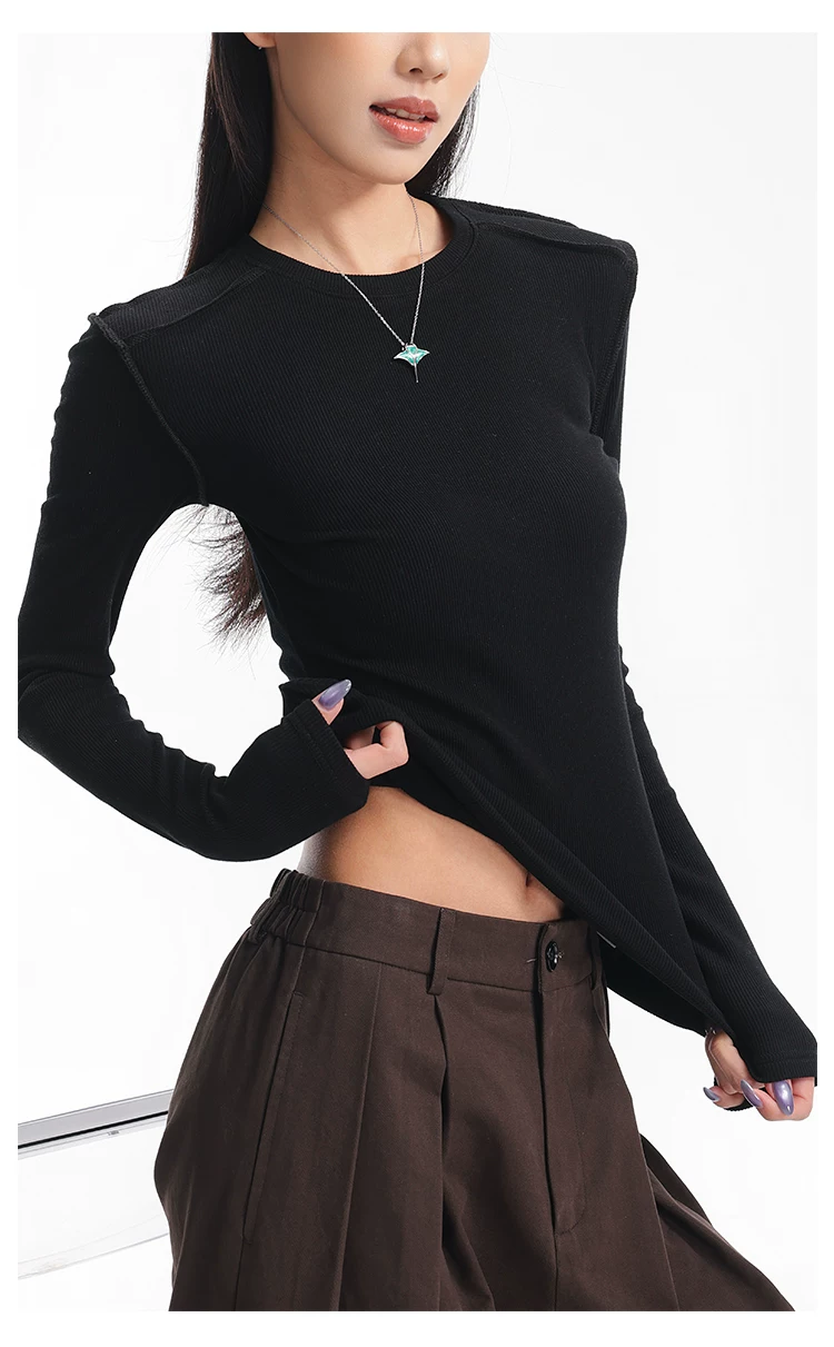Áo thun dài tay dệt kim màu đen thường ngày của KEN STUDIO mùa thu đông dành cho nữ, áo sơ mi cơ bản có họa tiết ôm vừa vặn