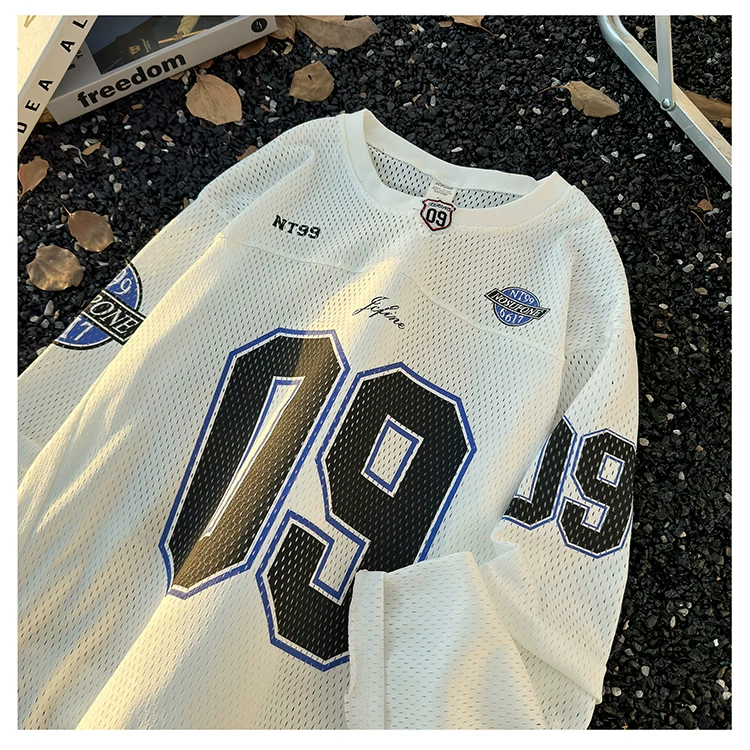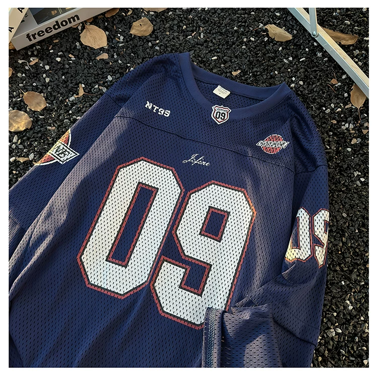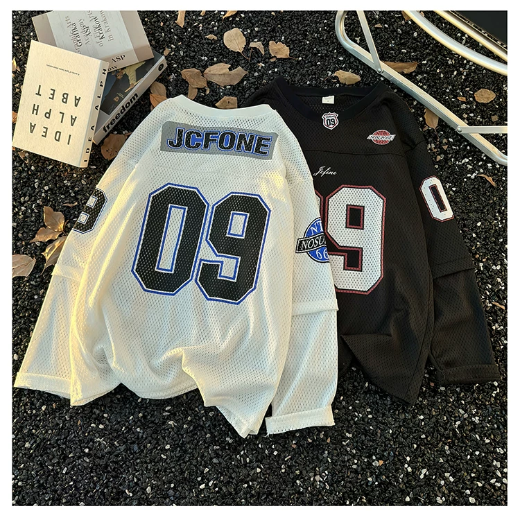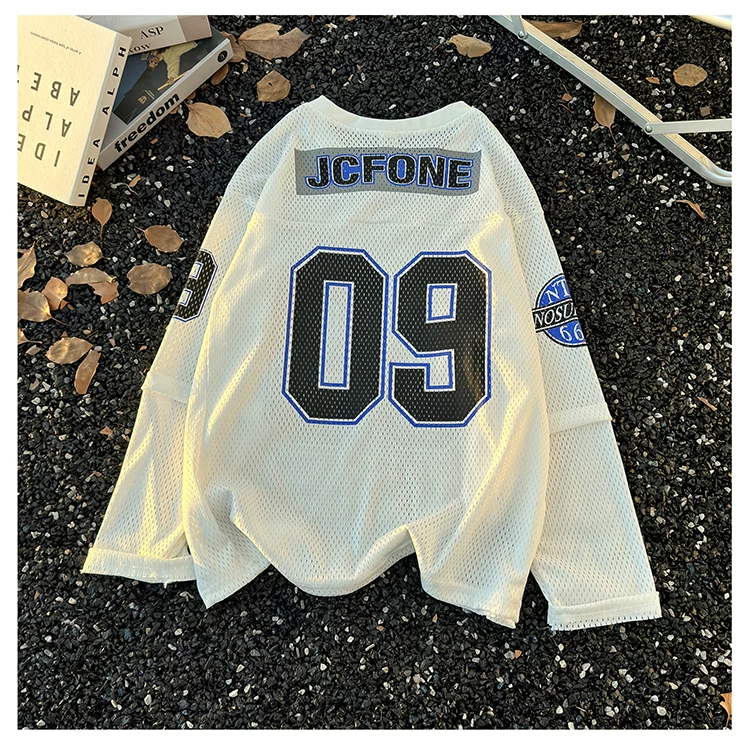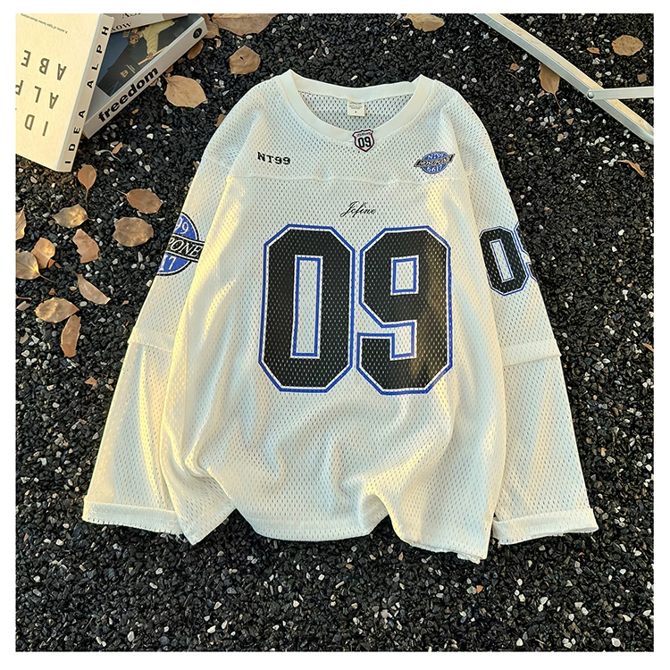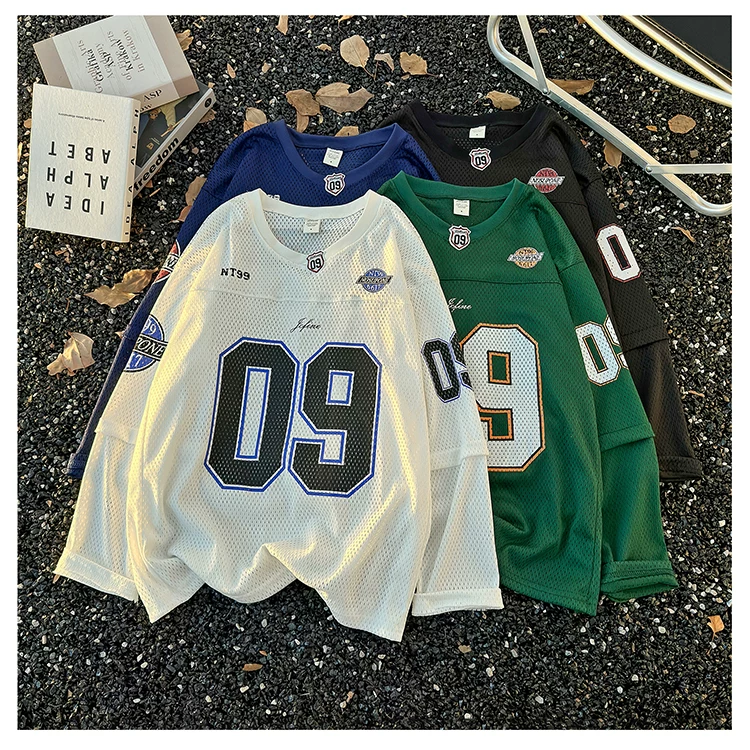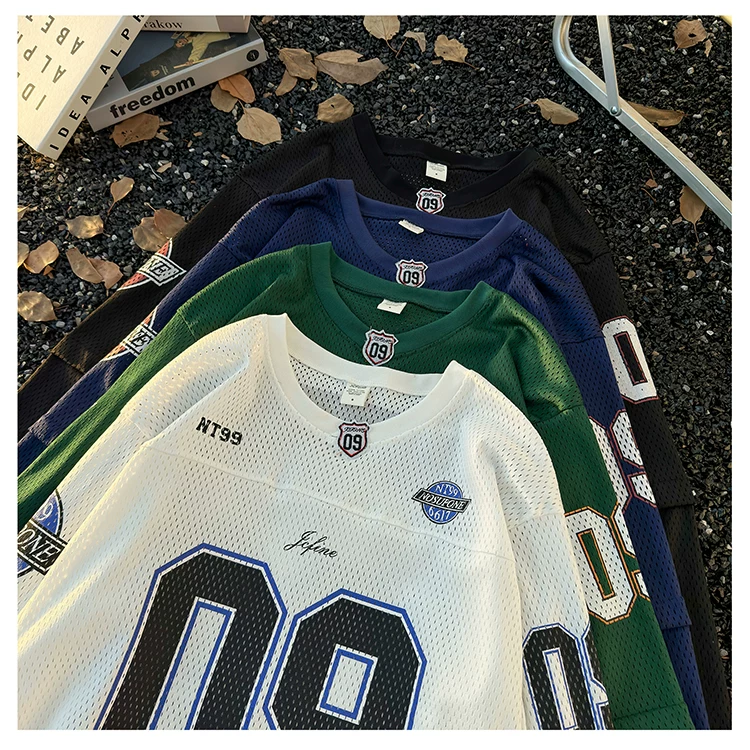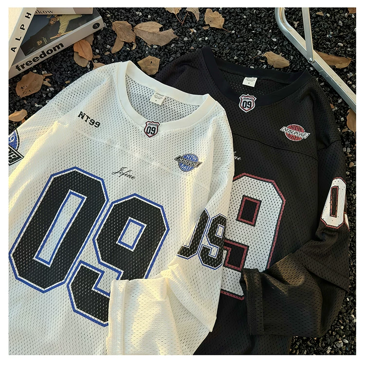 - Áo thun dài tay in kỹ thuật số dành cho nam, áo thun cổ tròn chất liệu lưới thoáng khí, thời trang xuân thu, phong cách thể thao Mỹ.