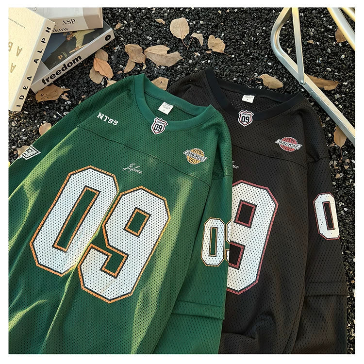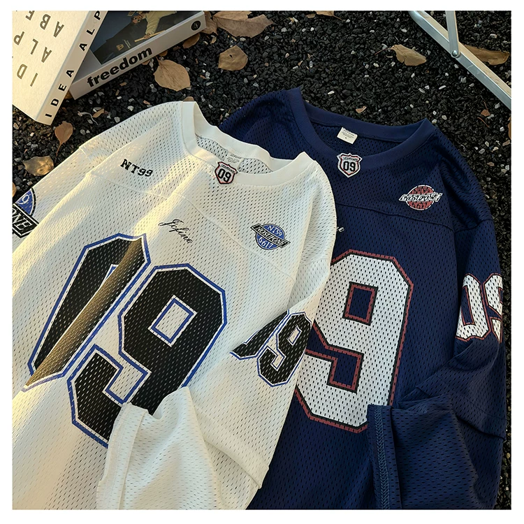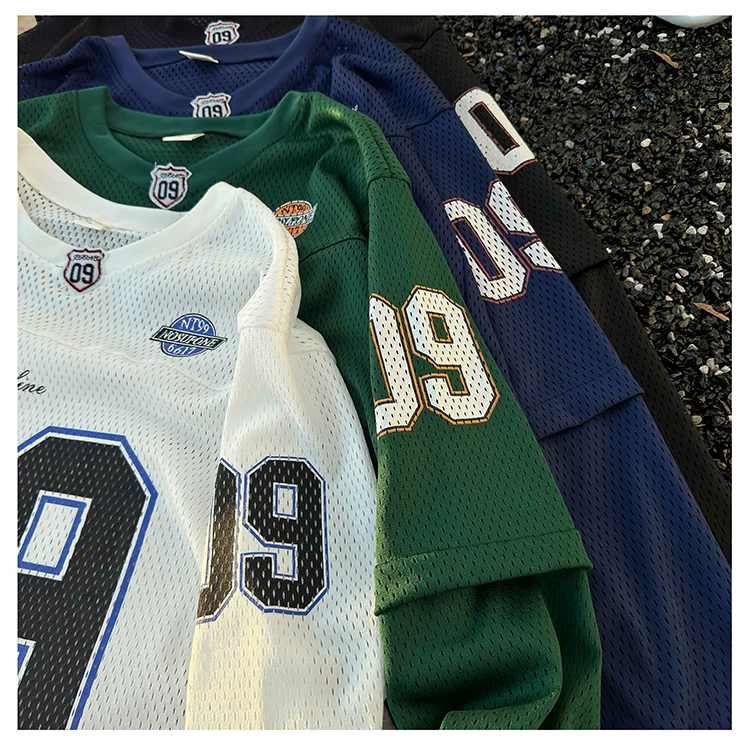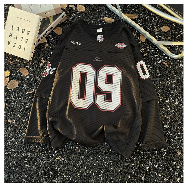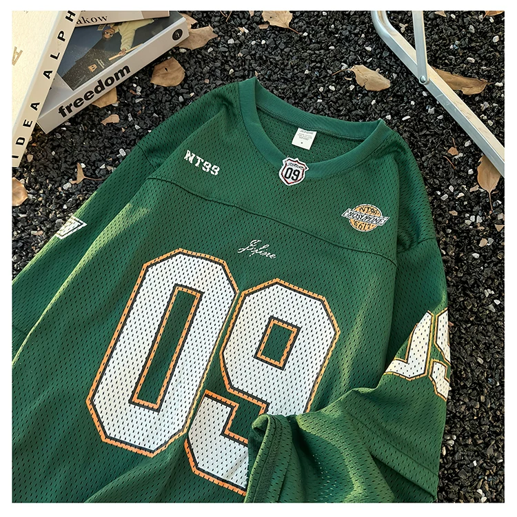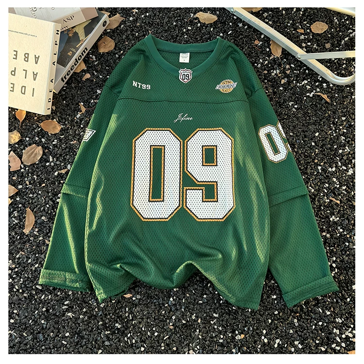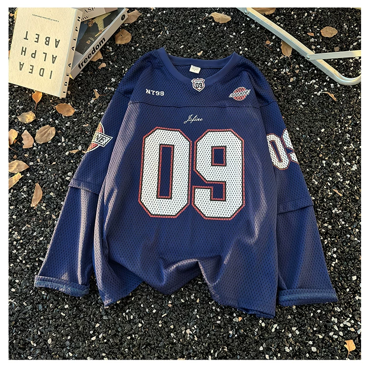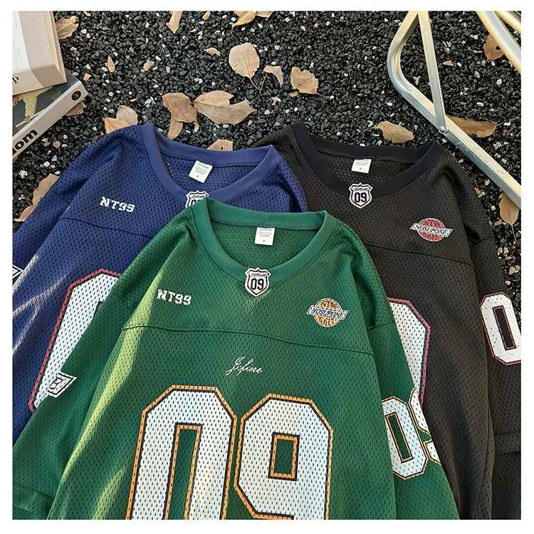 - Áo thun dài tay in kỹ thuật số dành cho nam, áo thun cổ tròn chất liệu lưới thoáng khí, thời trang xuân thu, phong cách thể thao Mỹ.