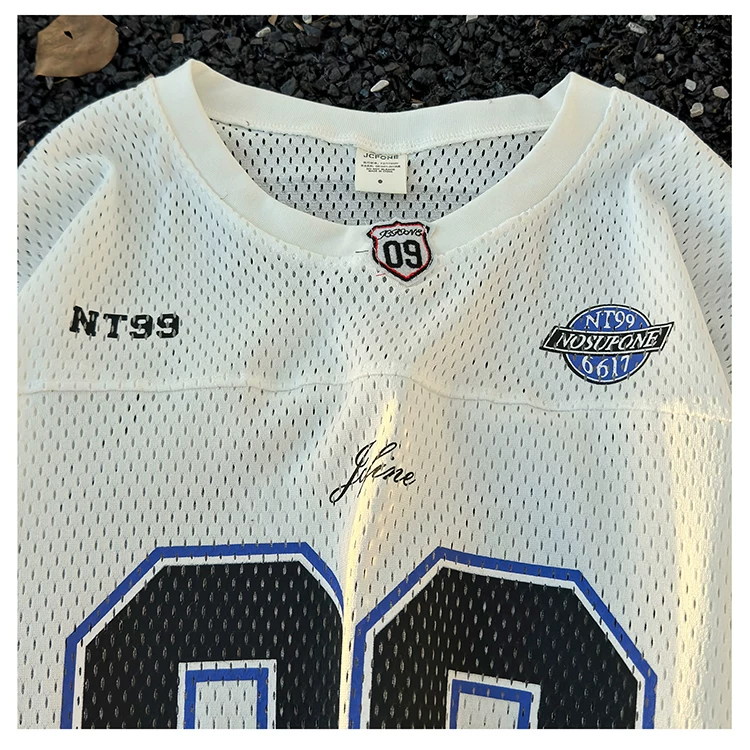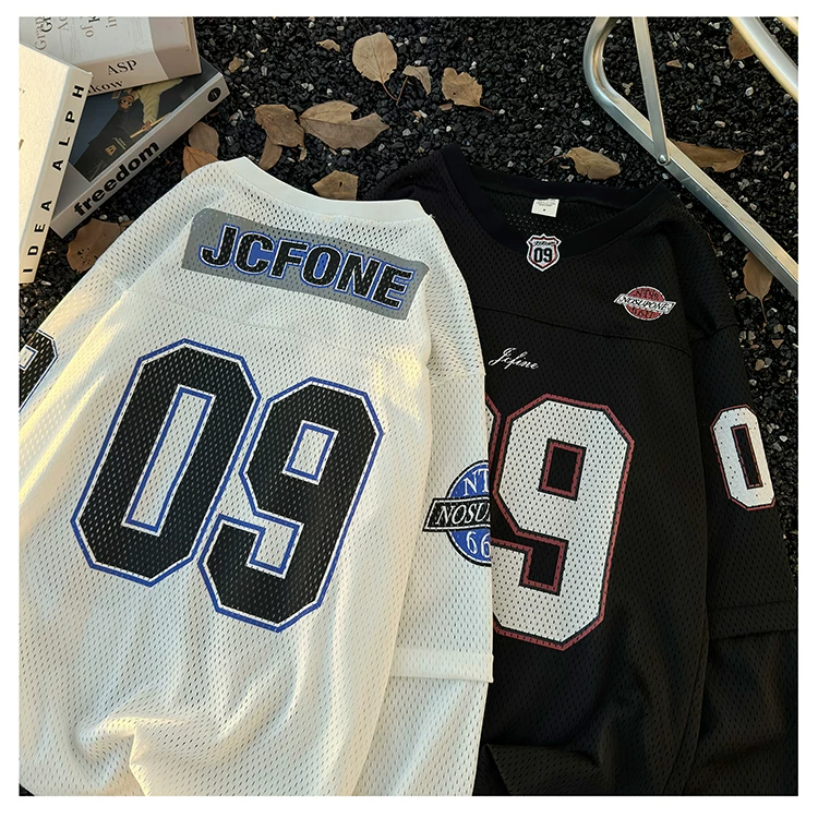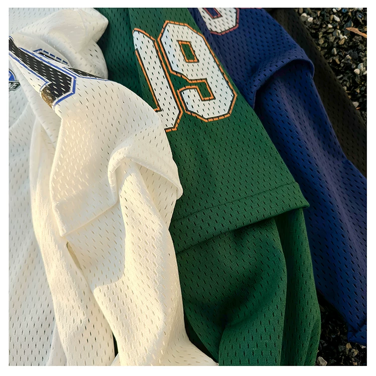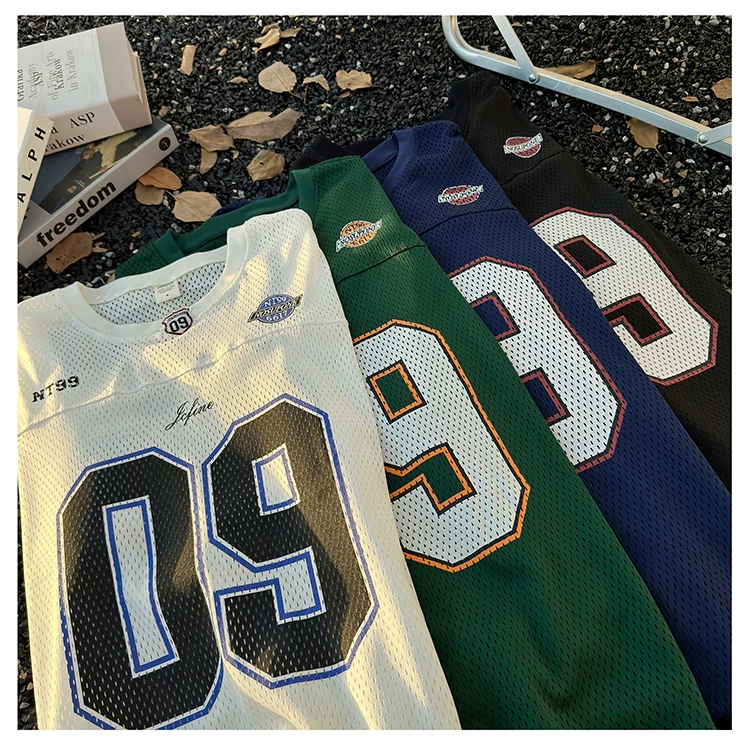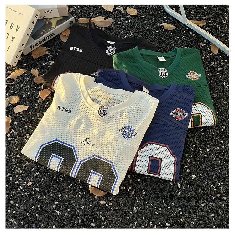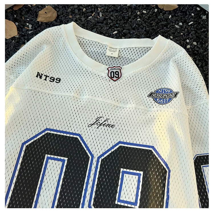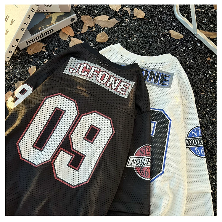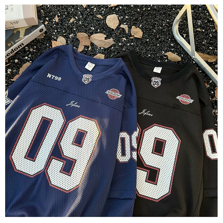 - Áo thun dài tay in kỹ thuật số dành cho nam, áo thun cổ tròn chất liệu lưới thoáng khí, thời trang xuân thu, phong cách thể thao Mỹ.